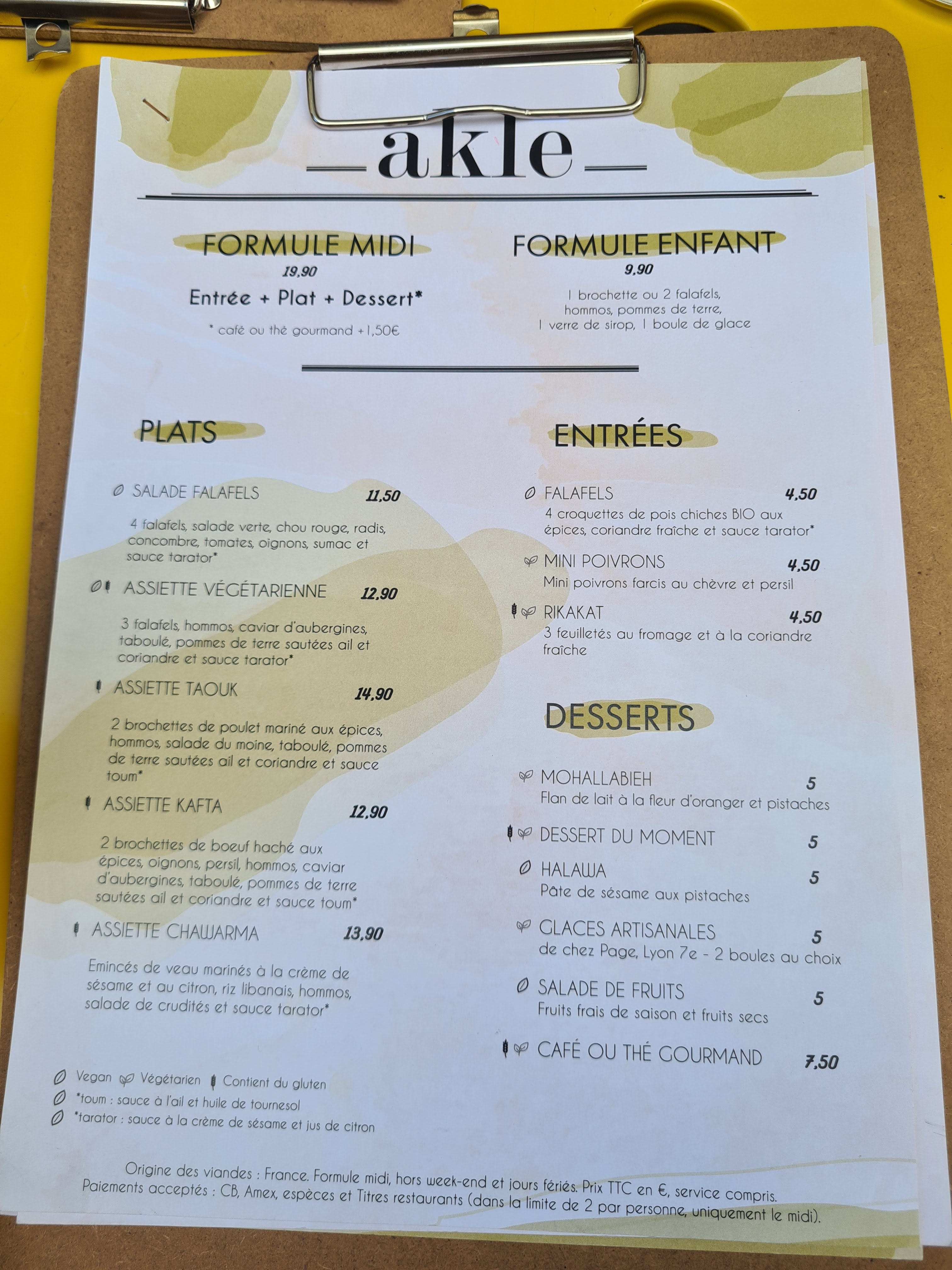 Bonjour Merci pour votre super retour ☺️ Pour info, nos menus changent à la fin du mois pour proposer des mezzes à la carte en plus des plateaux, n’hésitez pas à revenir tester ;) Belle journée L’équipe d’Aklé