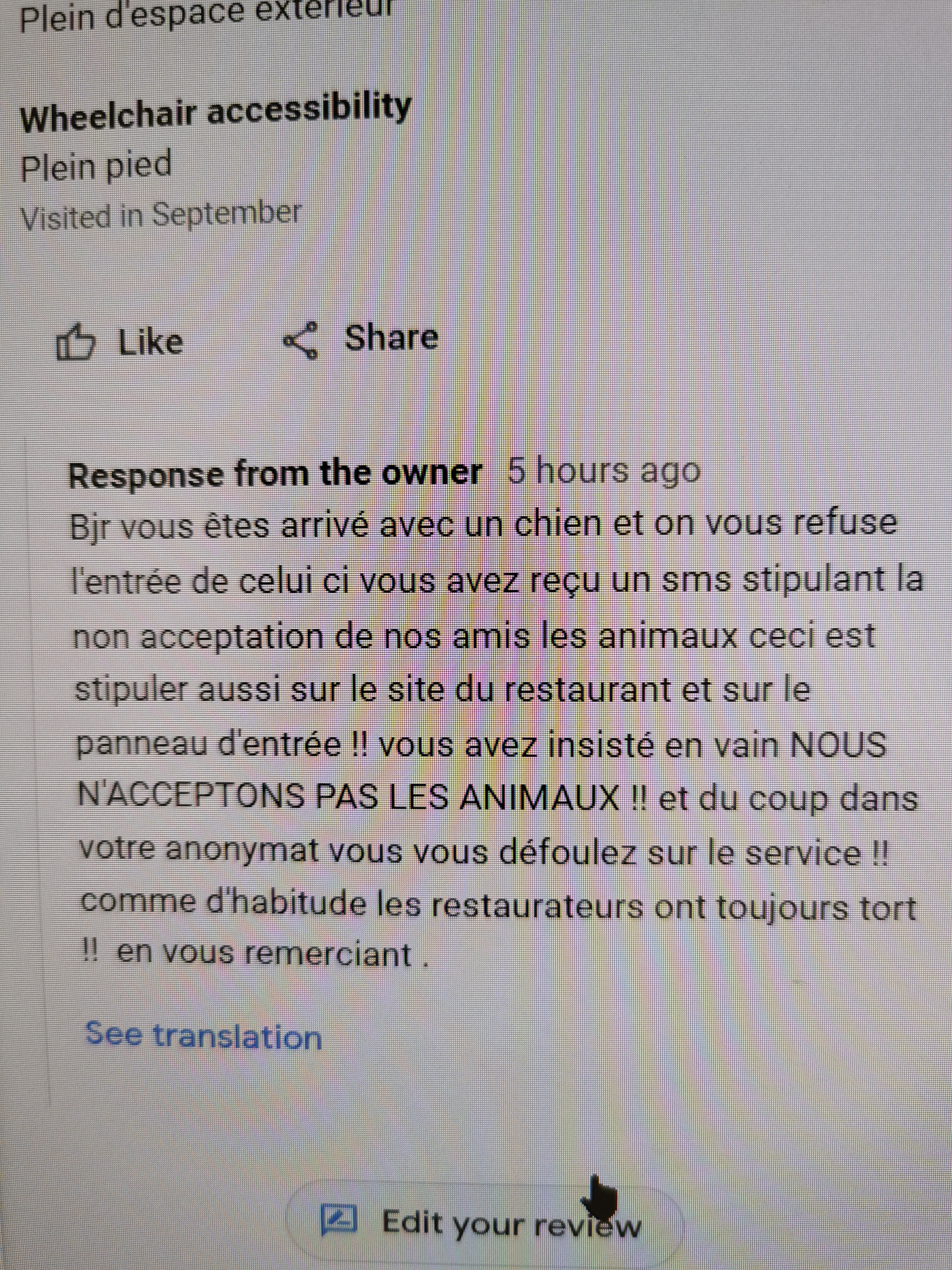 Bjr vous êtes arrivé avec un chien et on vous refuse l'entrée de celui ci vous avez reçu un sms stipulant la non acceptation de nos amis les animaux ceci est stipuler aussi sur le site du restaurant et sur le panneau d'entrée !! vous avez insisté en vain NOUS N'ACCEPTONS PAS LES ANIMAUX !! et du coup dans votre anonymat vous vous défoulez sur le service !! comme d'habitude les restaurateurs ont toujours tort !! en vous remerciant .