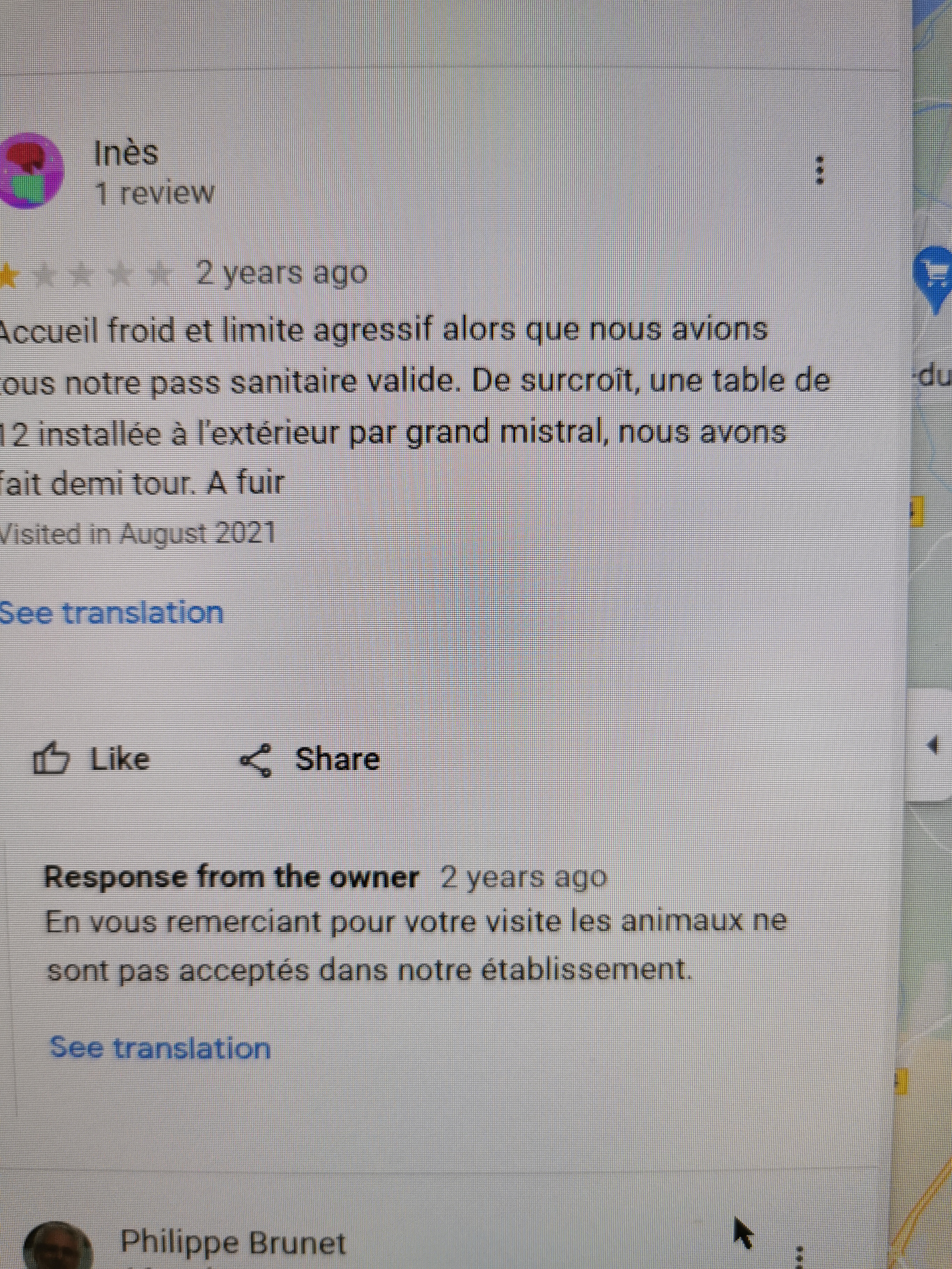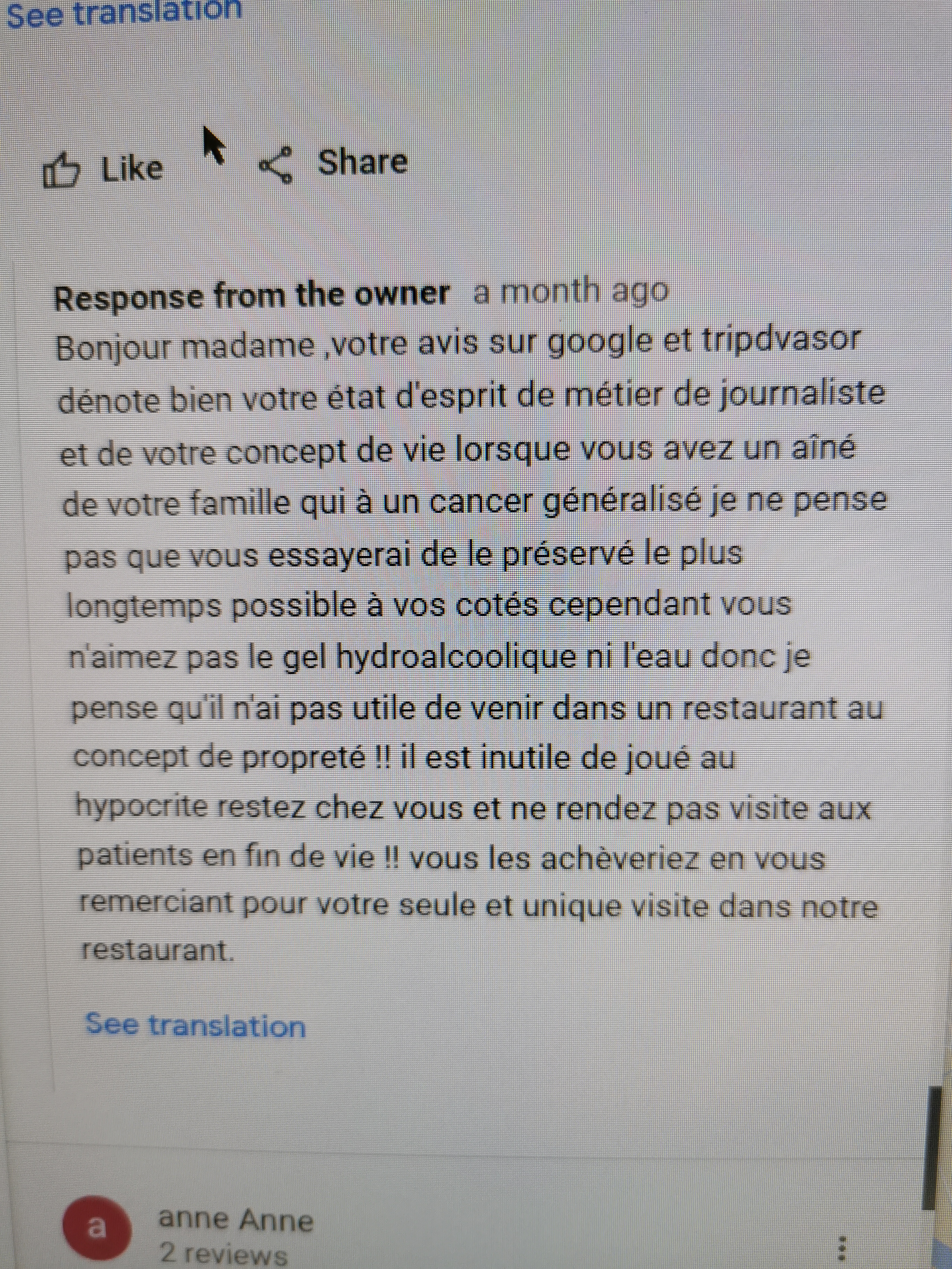 Bonjour madame ,votre avis sur google et tripdvasor dénote bien votre état d'esprit de métier de journaliste et de votre concept de vie lorsque vous avez un aîné de votre famille qui à un cancer généralisé je ne pense pas que vous essayerai de le préservé le plus longtemps possible à vos cotés cependant vous n'aimez pas le gel hydroalcoolique ni l'eau donc je pense qu'il n'ai pas utile de venir dans un restaurant au concept de propreté !! il est inutile de joué au hypocrite restez chez vous et ne rendez pas visite aux patients en fin de vie !! vous les achèveriez en vous remerciant pour votre seule et unique visite dans notre restaurant.