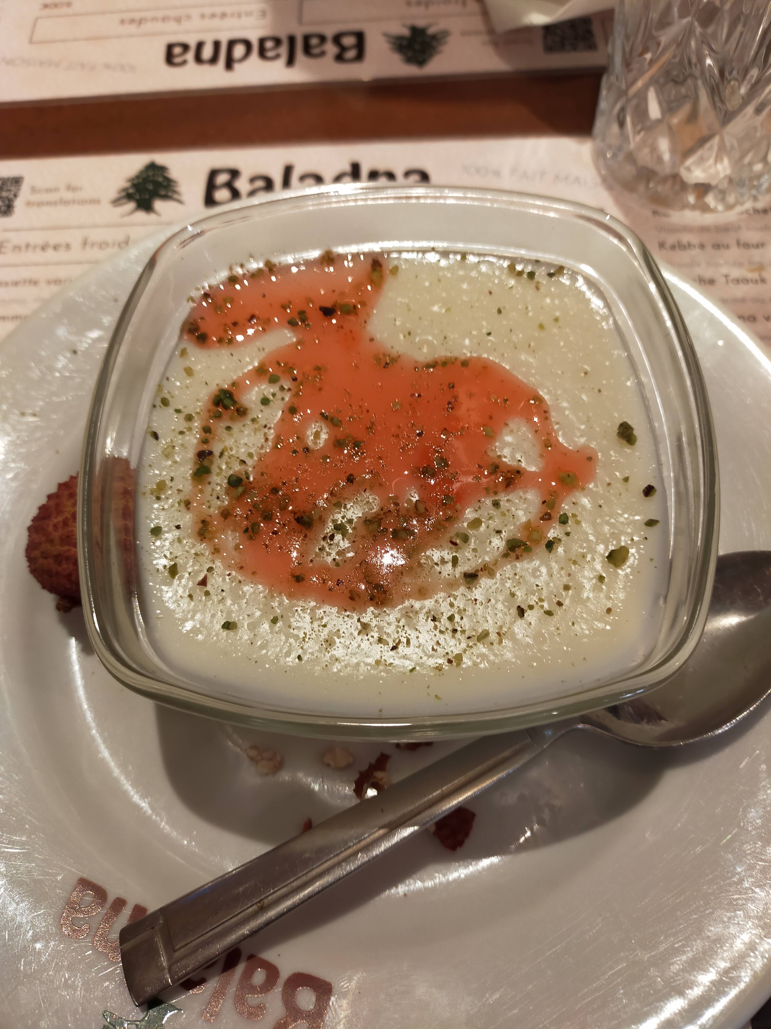 Une bonne cuisine chez Baladna Entrée de mezze à partager. Bien fait, épicé avec des saveurs. En plat, le poulet est très bon. Bien cuit, juteux et bien épicé. Le mouhallabieh en dessert aussi bien réalisé.