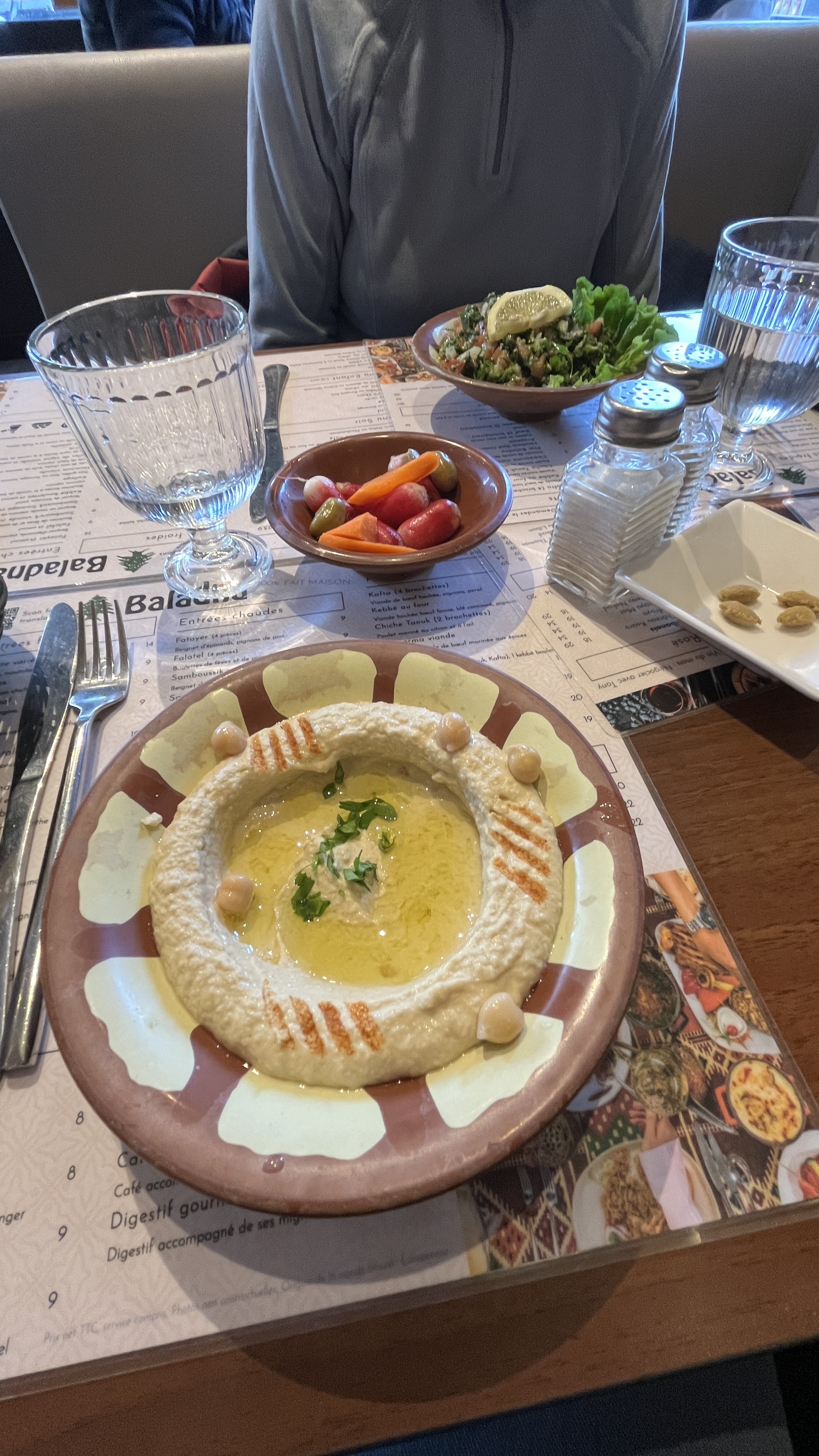 J'étais réticent à aller au resto pour manger du houmous et Tony m'a réconcilié avec le Libanais. Tellement sympa et tellement bon, un vrai bon moment. Merci pour le petit japonais surprise à la fin du repas