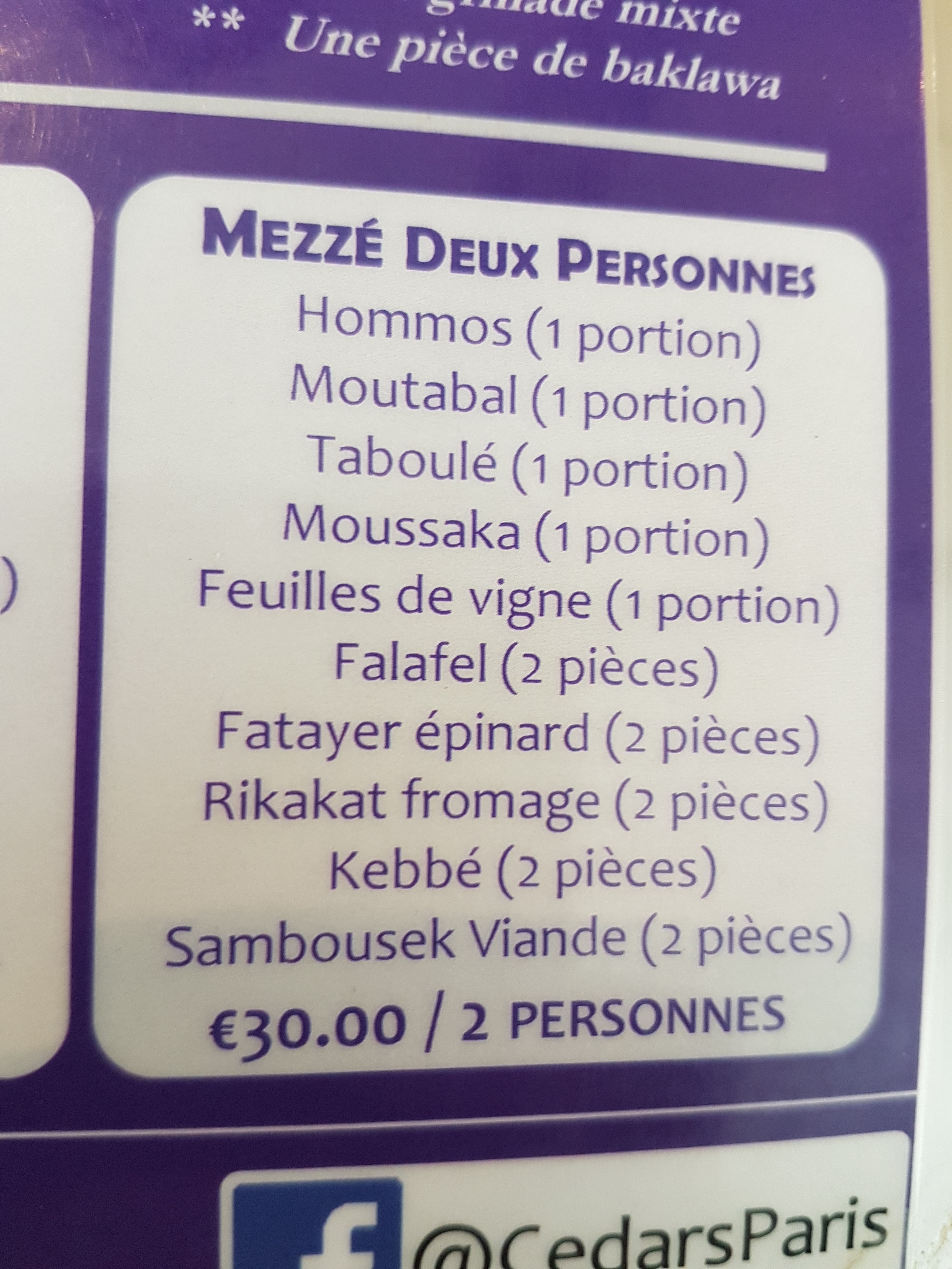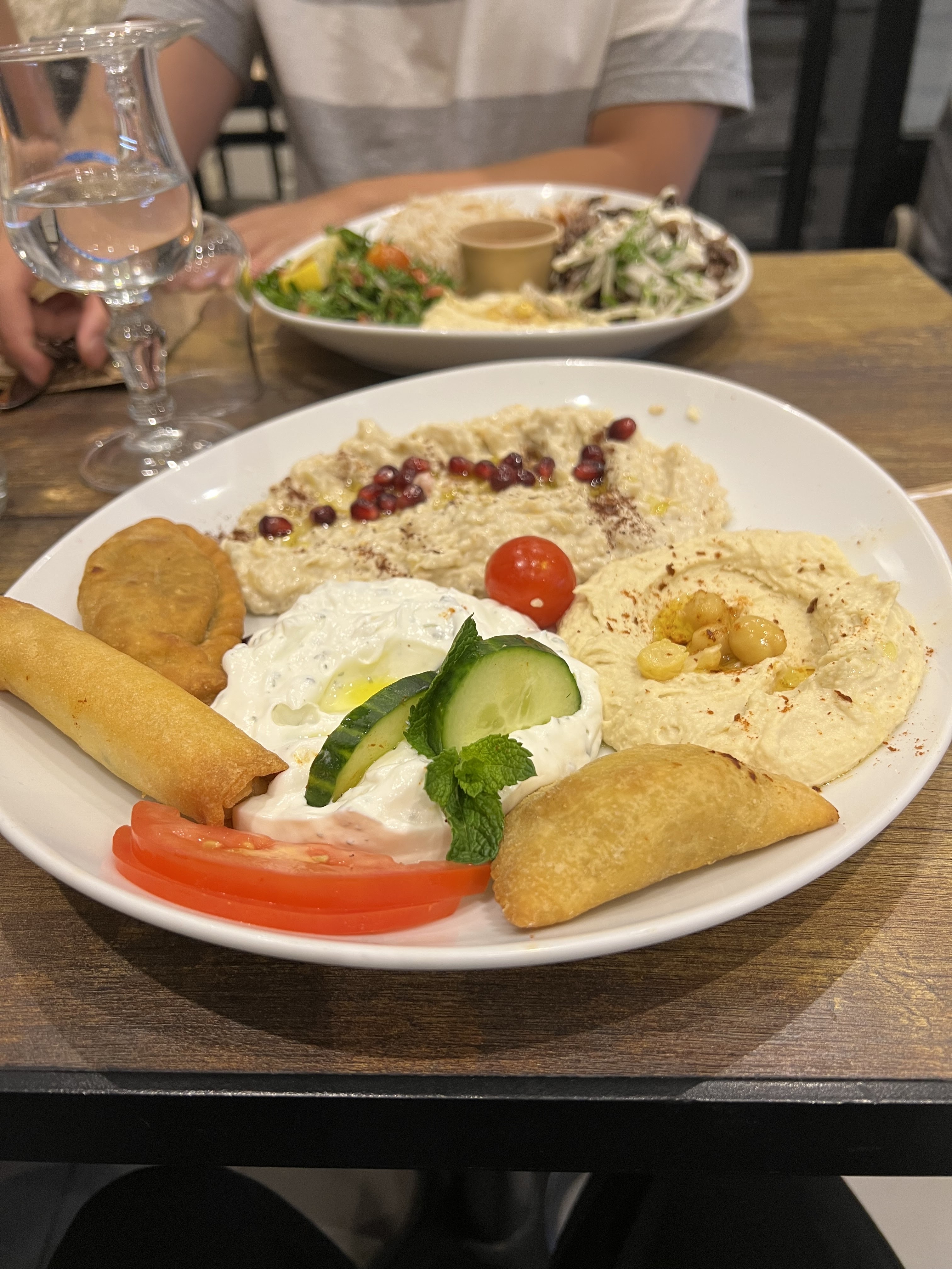 Nous avons été reçu au Cedars par un serveur très sympathique qui a fait attention à ce que notre repas se passe bien au long de la soirée. Nous avons pris des mezze à partager à 2 (il en manque sur la photo). Les mezze étaient globalement bon. Les portions sont généreuses! Nous n'avons pas pu finir, mais le serveur a mis ce qu'il nous restait dans des boîtes pour les ramener à la maison.