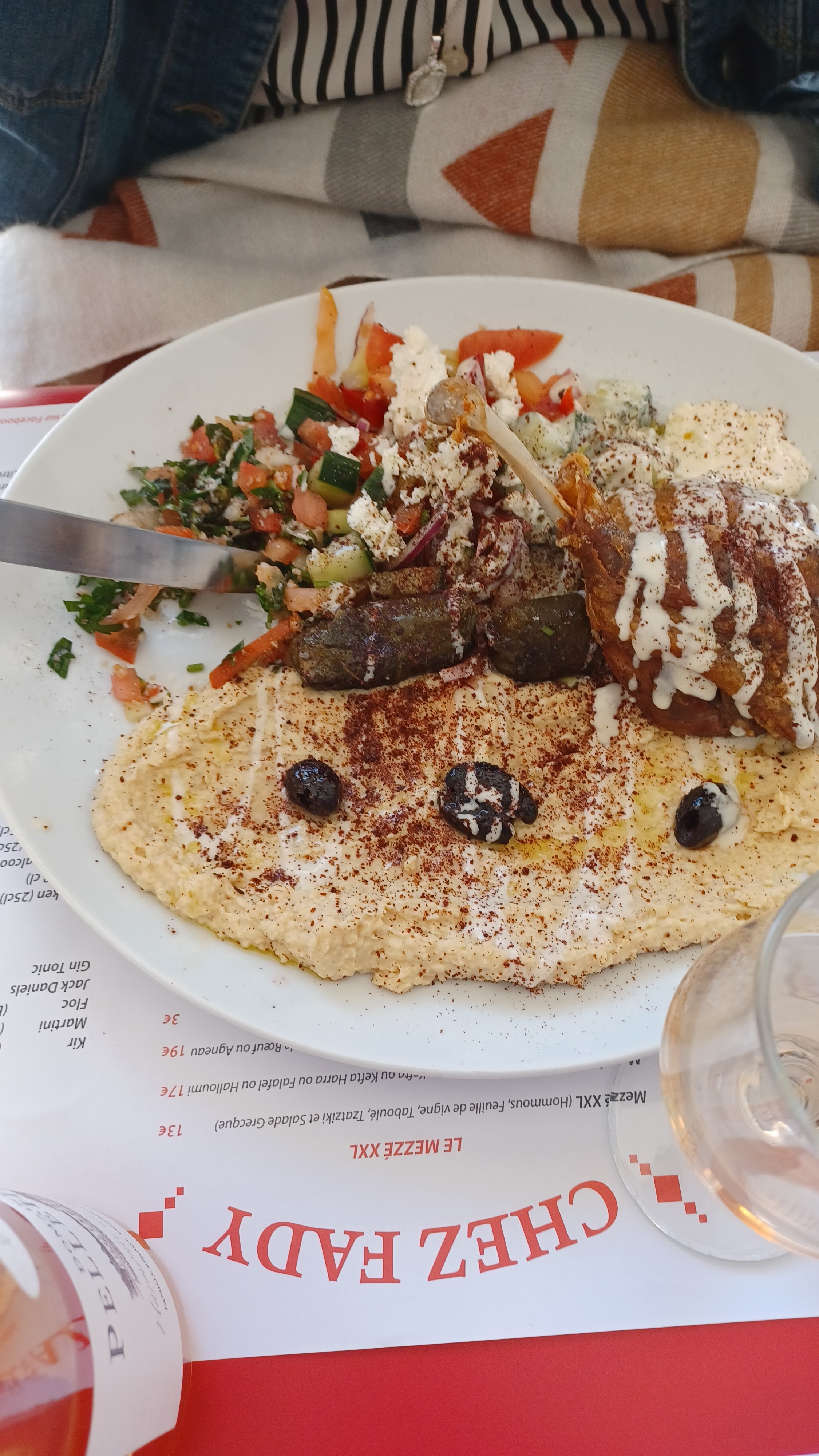 Une assiette de mezzés, copieuse et rafraîchissante sous les arcades. Emplacement agréable et bon acceuil.