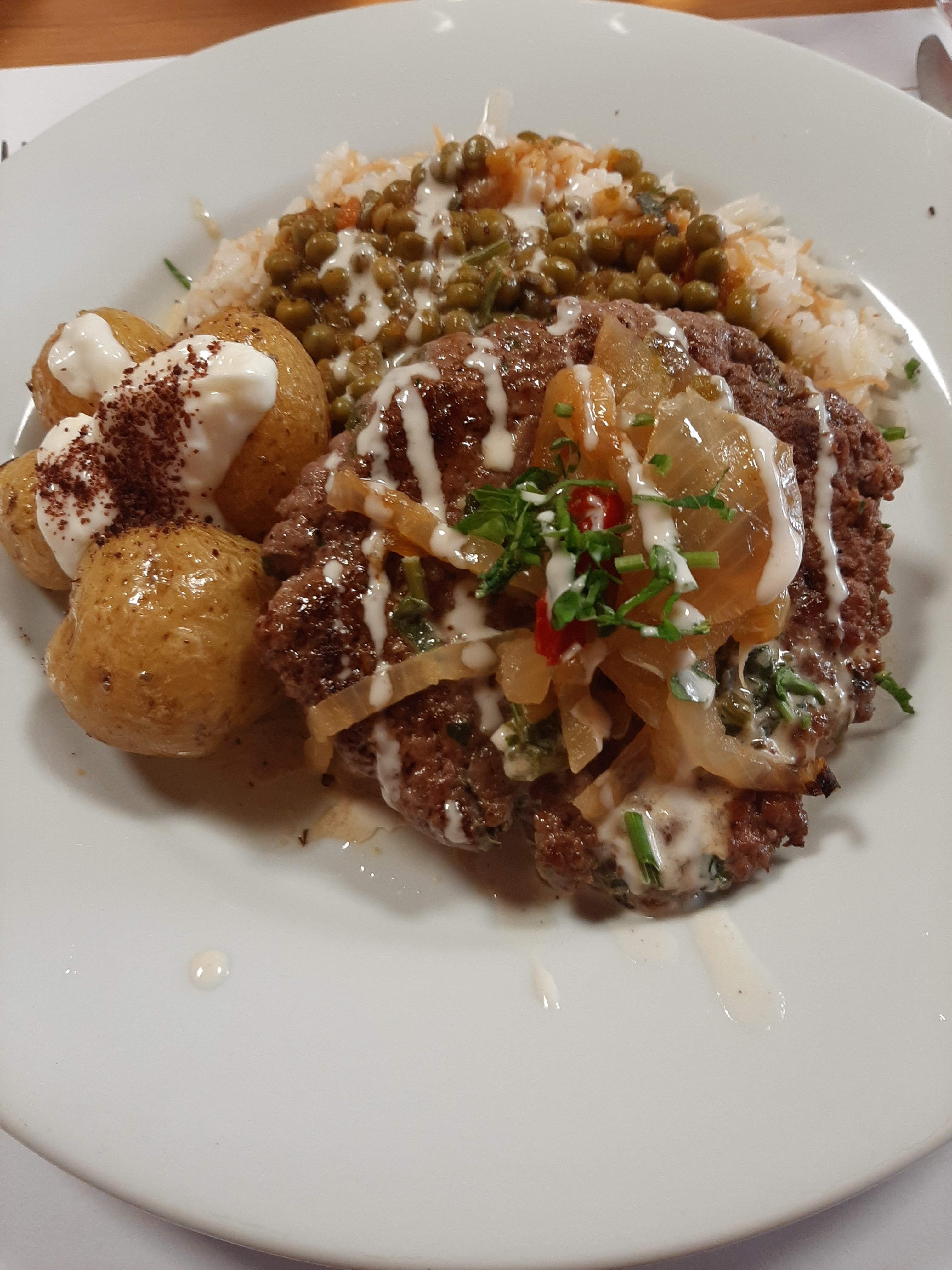 La présentation des plats laisse à désirer Une souris d'agneau servi au milieu d'une assiette creuse et tenue droite avec du riz mélangé à du vermicelle et des épices A cela des pommes de terre sautées ajoutées sur le dessus Quand vous voyez l'assiette vous n'avez plus faim tellement l'assiette est pleine En ce qui concerne le goût l'entrée qui nous a été servie était fade La farce de la feuille de vigne sèche La souris d'agneau trop cuite Le riz trop épicé Par contre les pommes de terre étaient parfaites Très fondante et assaisonnées à la perfection La patronne très agréable mais désolée je ne recommande pas car cela ne suffit pas pour satisfaire les clients et leurs papilles😔