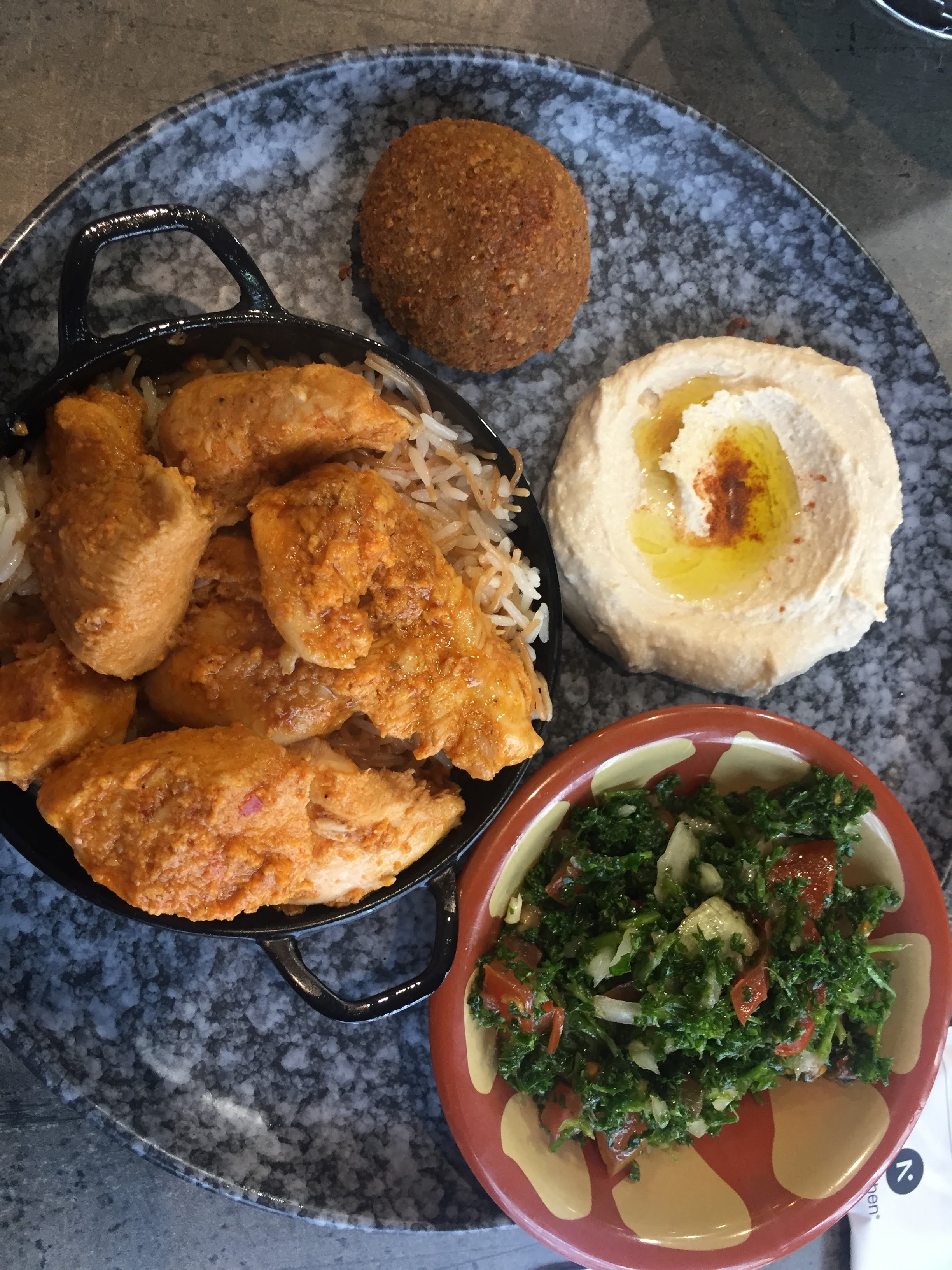 J'était venu une fois au moment de l'ouverture, j'ai été très déçu, le pire à été le morceau de bouillon cube dans une salade de lentilles. Lisant de bonne critiques, j'ai voulu y retourner : accueil très agréable, restaurant très bruyant, déco très kitch. Nous avons pris deux assiettes végé + des bouchées beauf/agneaux. Nous avons eu deux assiettes différentes, ce qui permet de goûter à plein de petites choses. Pour la cuisine, tout est fait maison, c'est vraiment appréciable mais ... avec des produits bas de gamme. Quel déception encore une fois : épinards surgelés sur cuits, houmous vraiment trop salé, bouchées boeuf/agneaux complètement sèches et le baklava n'avait pas été imbibée de miel donc lui aussi très sec ... Le reste correct mais sans plus sauf le caviar d'aubergine était vraiment délicieux. Je n'ai pas fini mon assiette non non dessert L'un dans l'autre je n'y ai pas trouver un bon apport qualité/prix La même chose avec des produits de qualité, frais et un peu de rigueur sur les assaisonnements, ce serait le rêve.