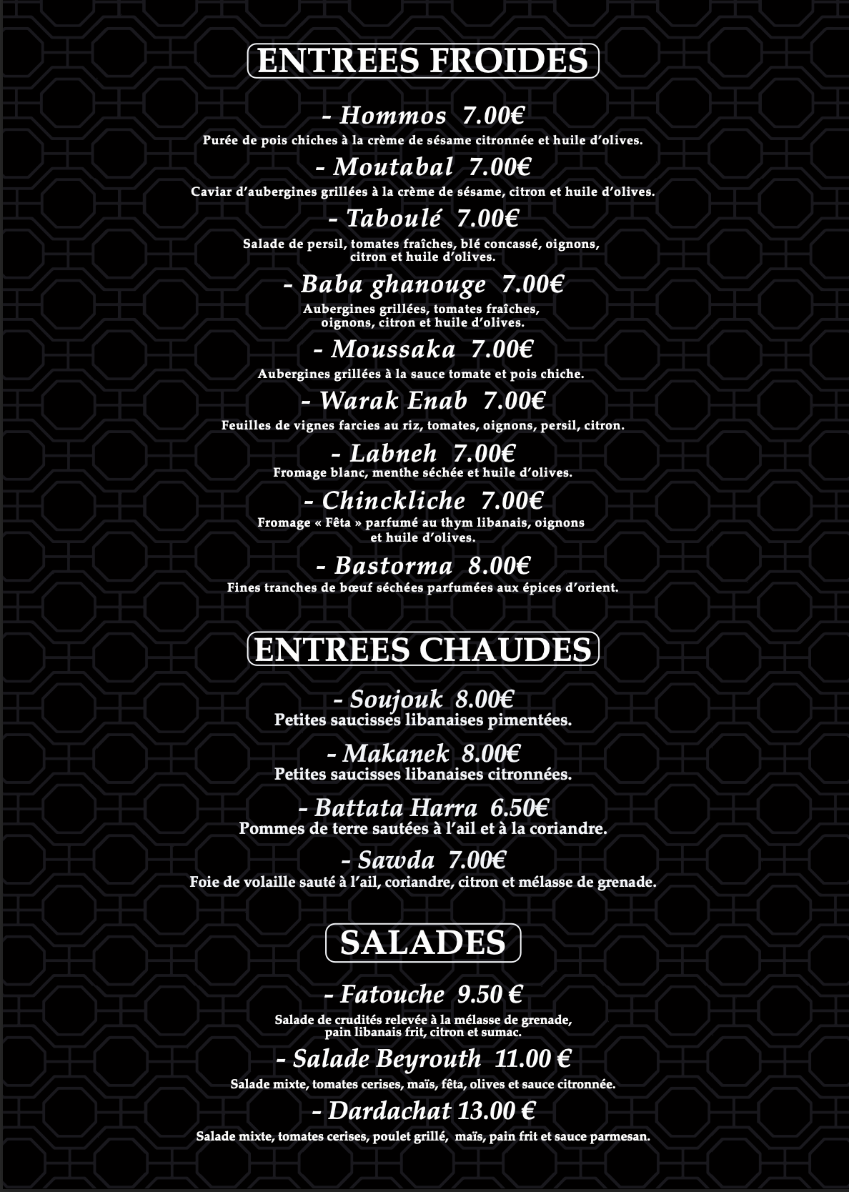 Excellent libanais proposant des plats allant de 15 à 20€ mais surtout une formule de mezzes délicieux, avec beignets et plats froids (houmous, un taboulé à tomber par terre) à 26€/personne (à partir de deux personnes). Une excellente adresse avec un personnel particulièrement sympathique !