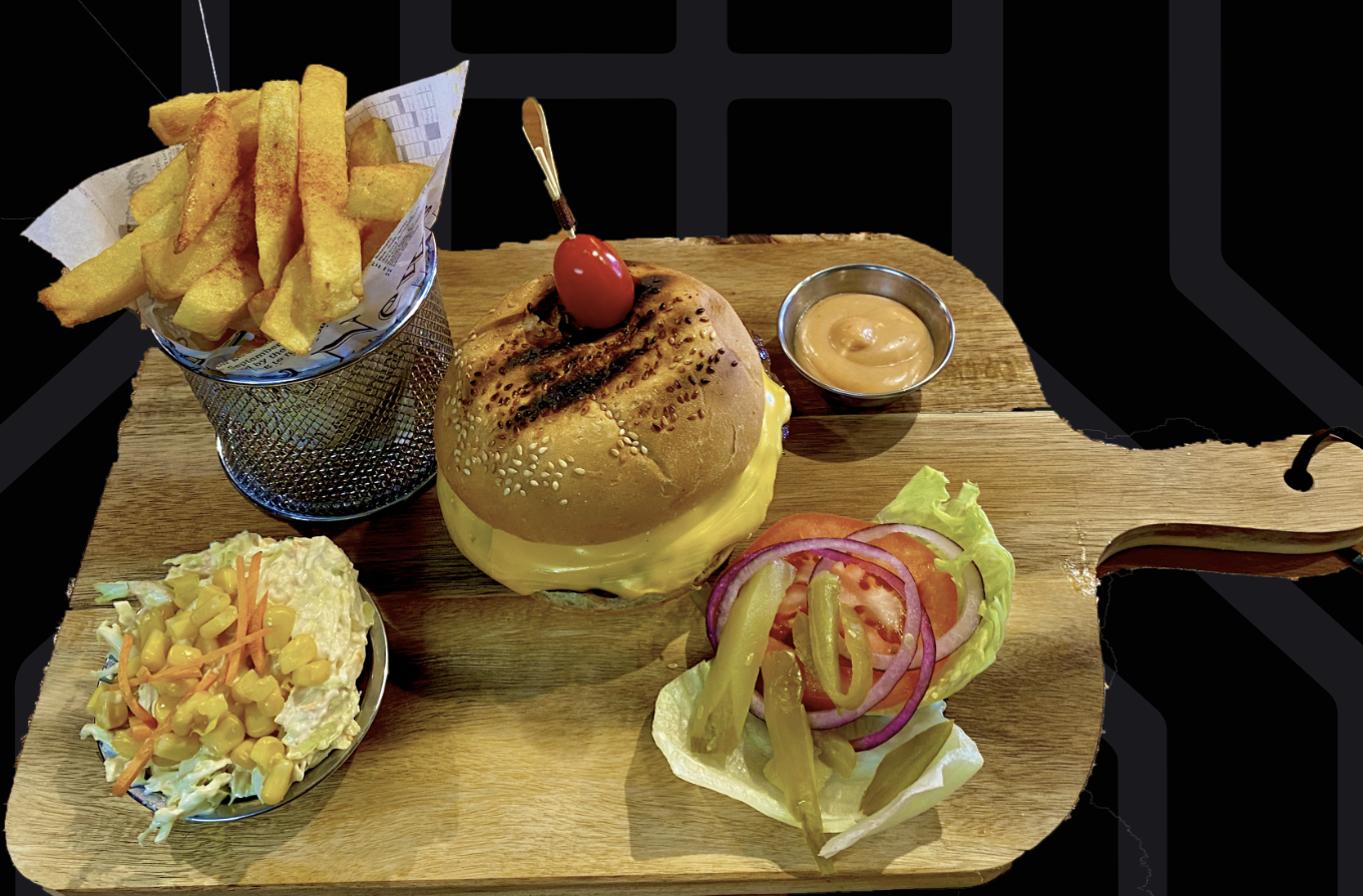 Burger Poulet a été dur comme une pierre. Burger viande a été cramé.