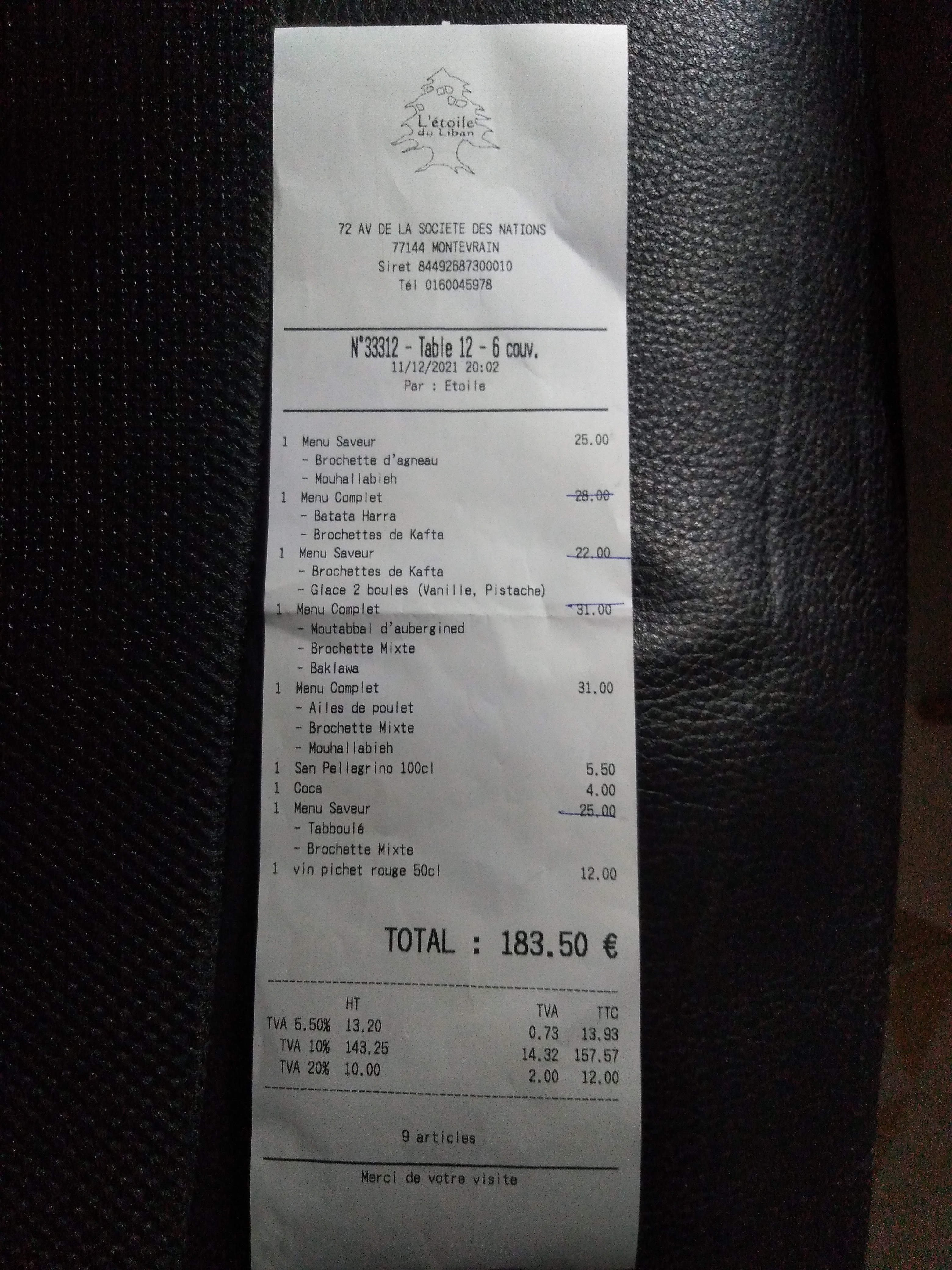 Déjà habitué à l etoile du Liban à Paris j ai testé celui de montevrain qui a ouvert la semaine dernière et il est autant à la hauteur....Je recommande plus que vivement ces restaurants :c'est un délice pour les papilles. Ambiance cosy et accueil chaleureux... On adore ♥ ♥️♥ la salle à