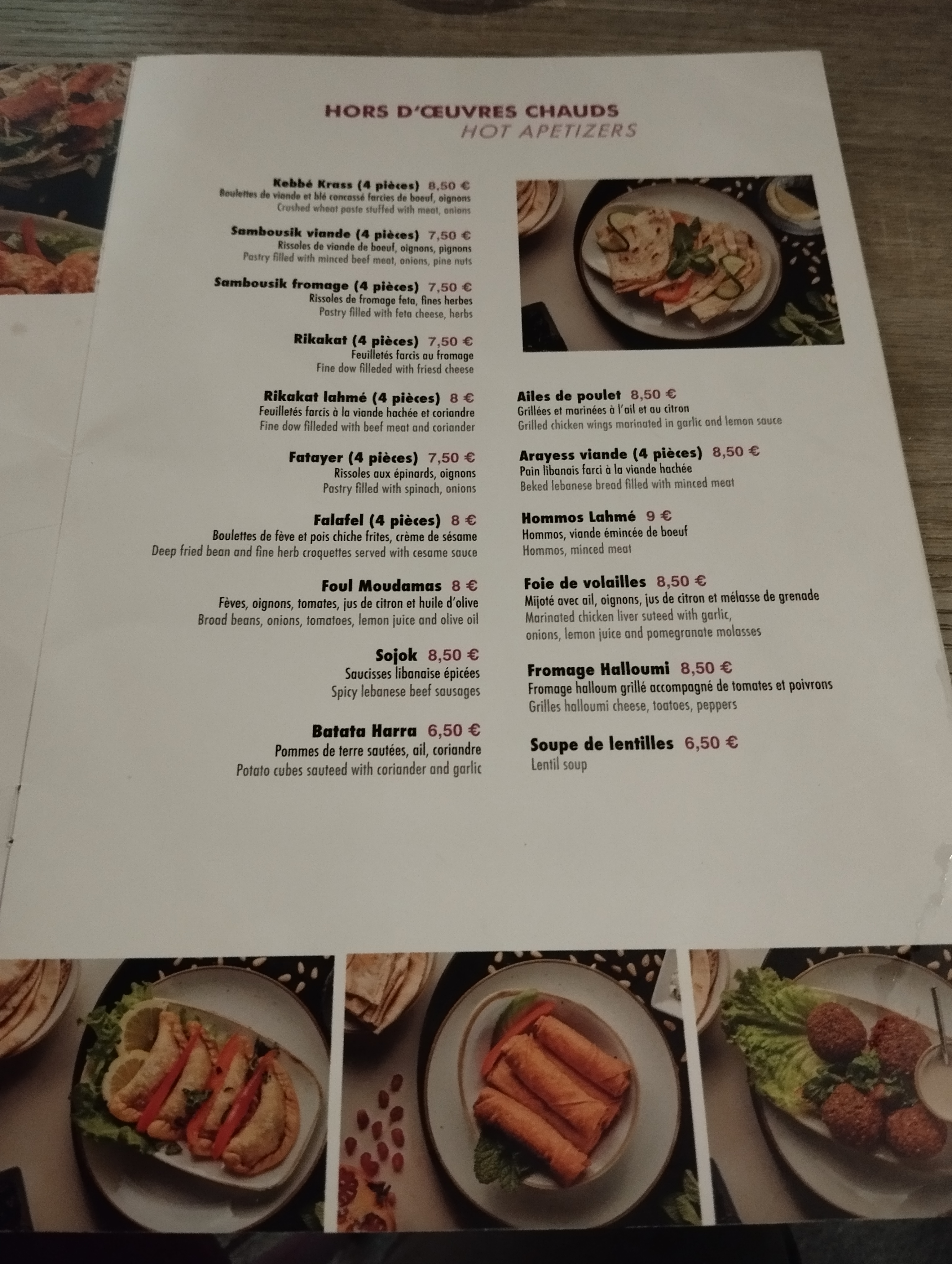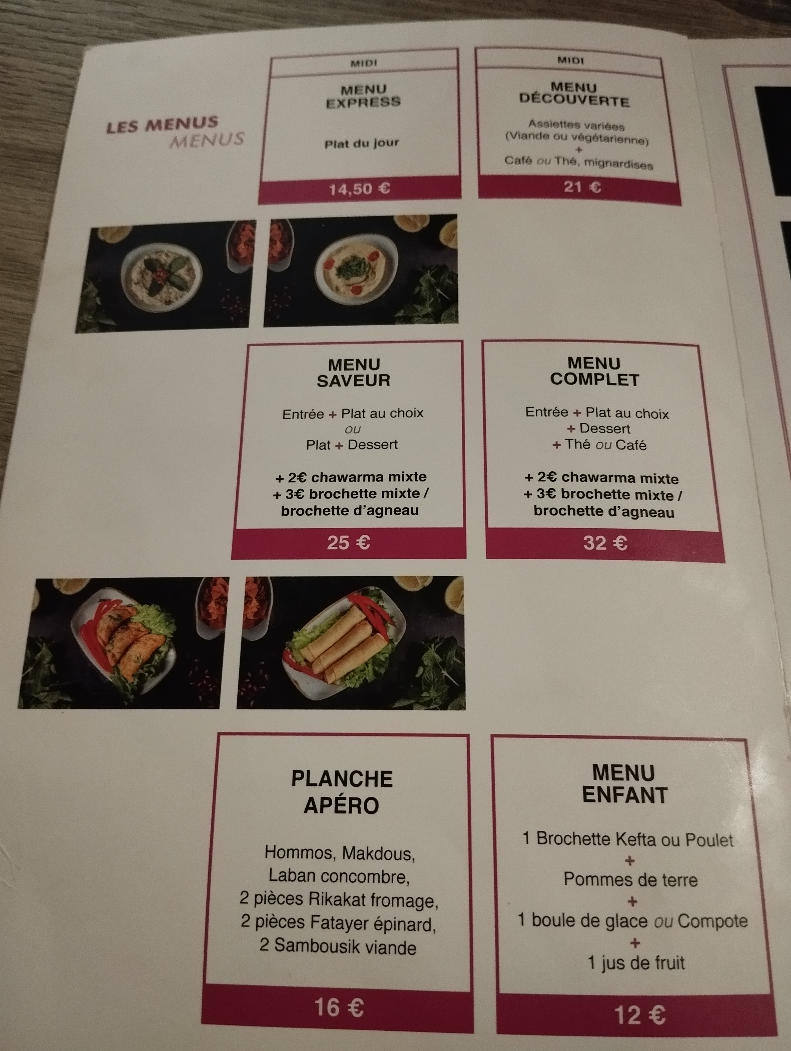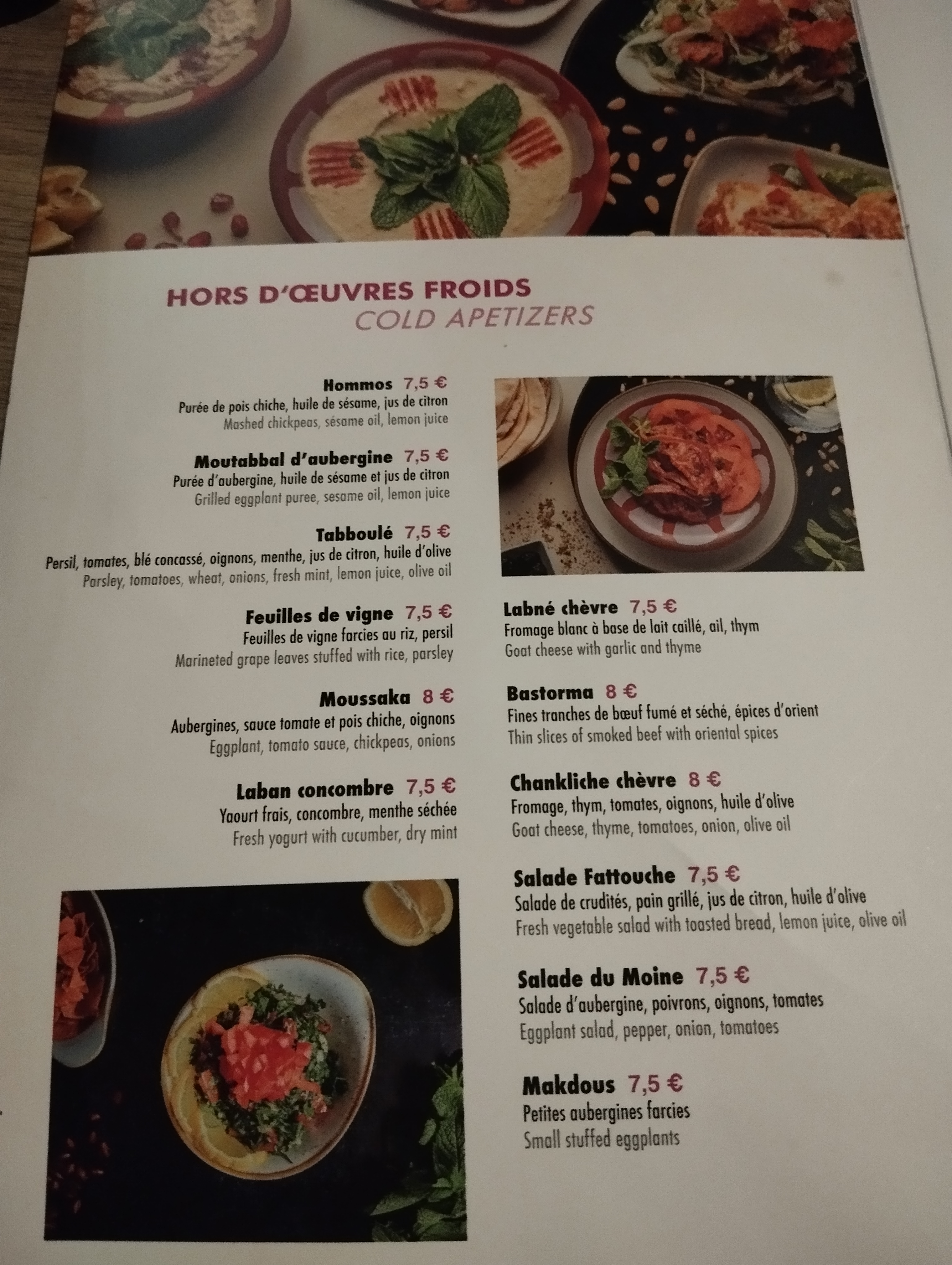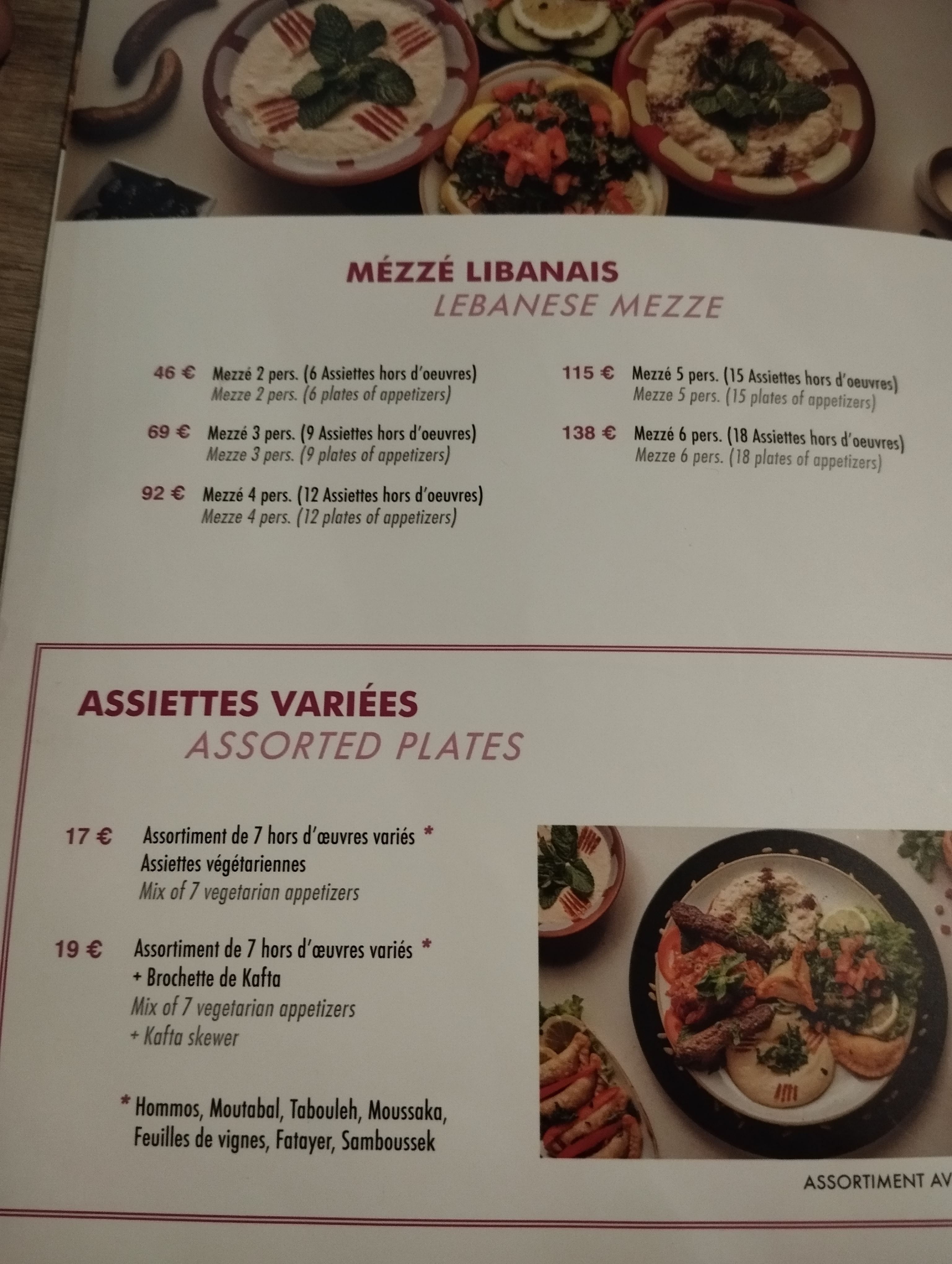 Avons testé le mezzé pour 2 6 assiettes avec différentes variétés de plats houmous, kafta, taboulé... C'était plutôt bon dans l'ensemble Quelques améliorations à faire sur l'houmous qui manquait un peu de goût Et les galettes un peu trop grillé Le vin rosé du Liban était excellent La carte des vins est sympa avec des prix qui commencent très bas Au global bonne soirée dans un cadre sympa avec possibilité de manger aussi en terrasse couverte