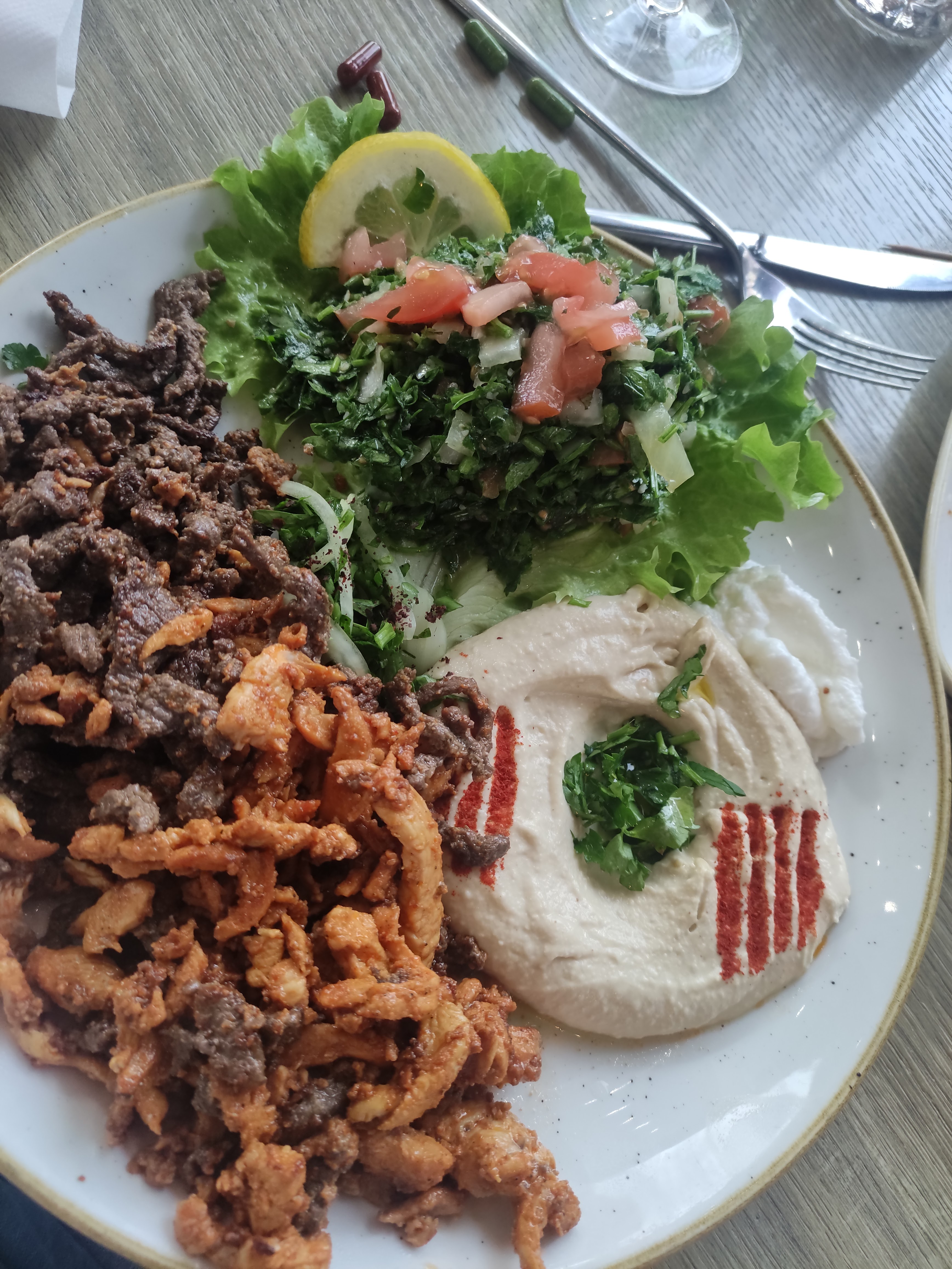 Restaurant excellent. Nous avions pris les assortiments d’hors d’œuvres végétariens et à la viande. Plats très copieux et délicieux. Pour le dessert nous nous sommes laissés tenter par l’assortiment de pâtisseries avec un café blanc à la fleur d’orange et un café libanais. Belle note de fin. Le personnel est très agréable et serviable. Nous reviendrons très certainement. Je recommande !