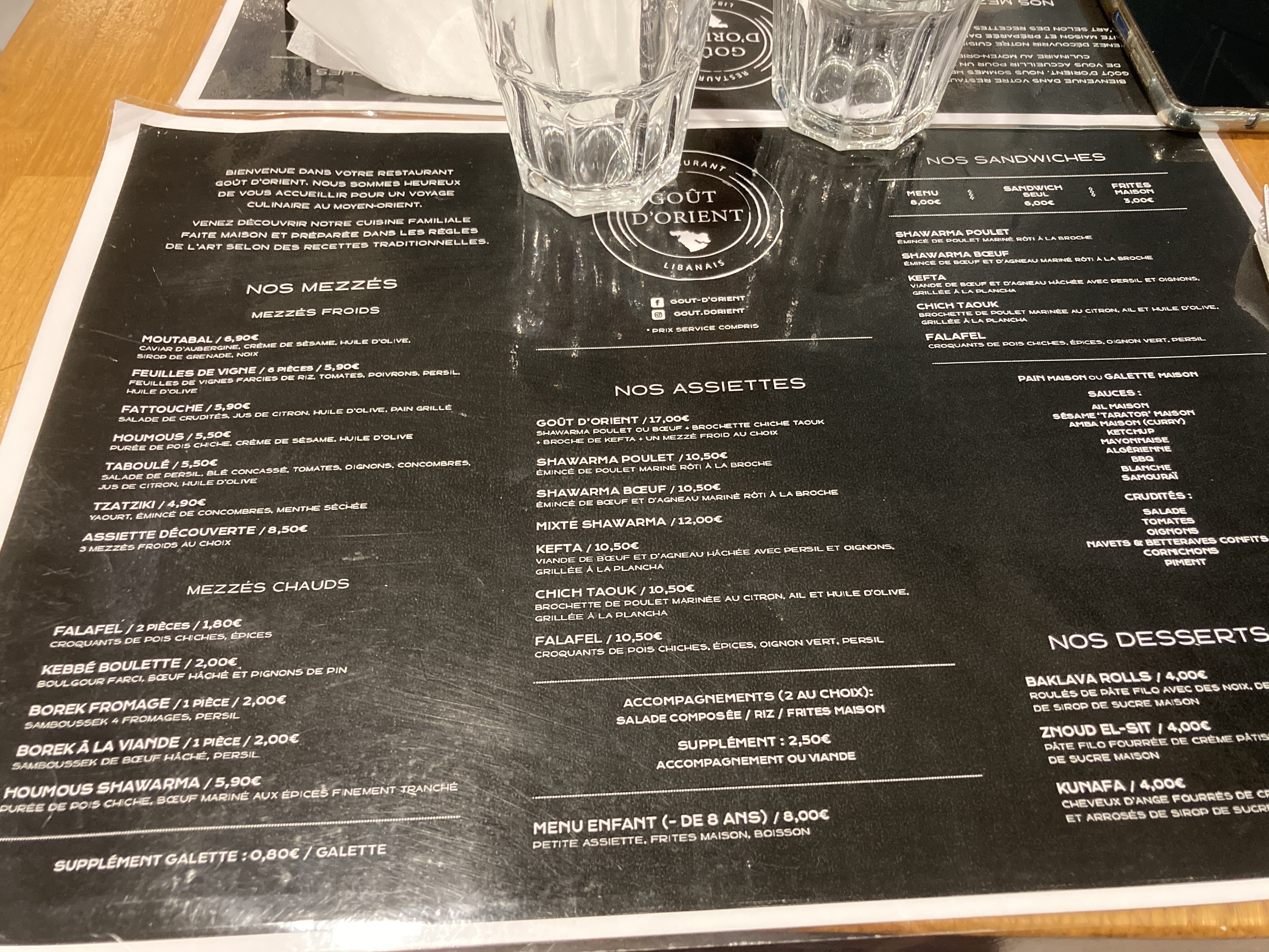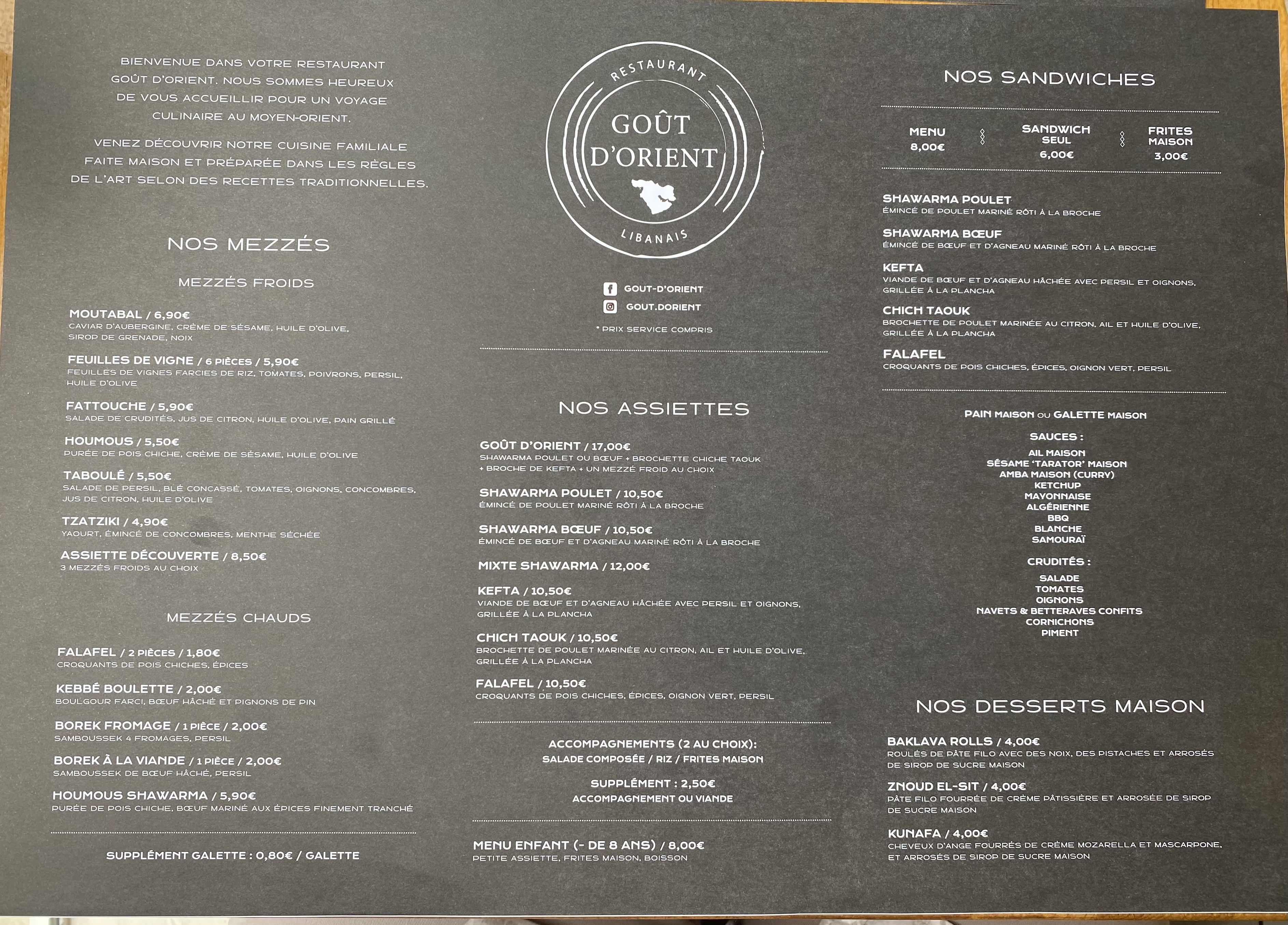 Nous avons découvert Goût d’orient lors de notre emménagement à Idron.Ils ont accepté de nous livrer à domicile malgré l’heure tardive et le fait qu’on était hors de la zone normale de livraison. Mais c’est bien pour la qualité de la nourriture qui est venue s’ajouter à leur bienveillance que nous n’avons depuis cessé d’y retourner pour déguster leurs sandwiches délicieux 😋