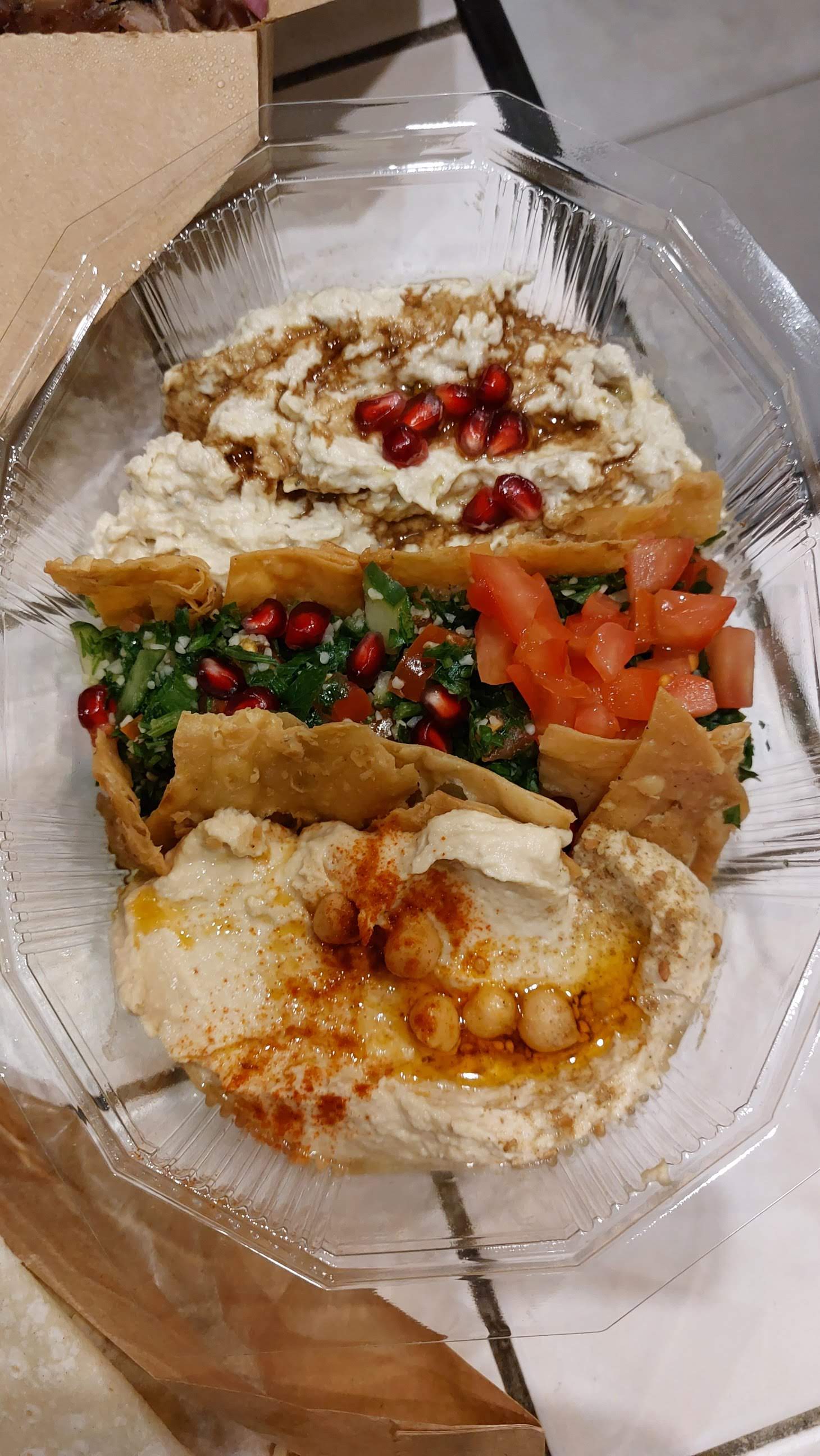 Des plats très copieux et surtout excellents J ai pris un trio de mezzés : houmous, taboulé et fattouche, puis des falafels , mon mari a pris une assiette goût d orient avec du shawarma et du kefta au boeuf et du chich taouk accompagné de salade, de frites maison et surtout d une sauce au curry à tomber par terre. Il a aussi pris des feuilles de vigne. Nous nous sommes regalé mais nous n avons pas pu tout finir, nous sommes reparti avec nos restes. La serveuse ainsi que le patron sont vraiment très sympa. Dommage que nous habitions si loin de Pau 😉