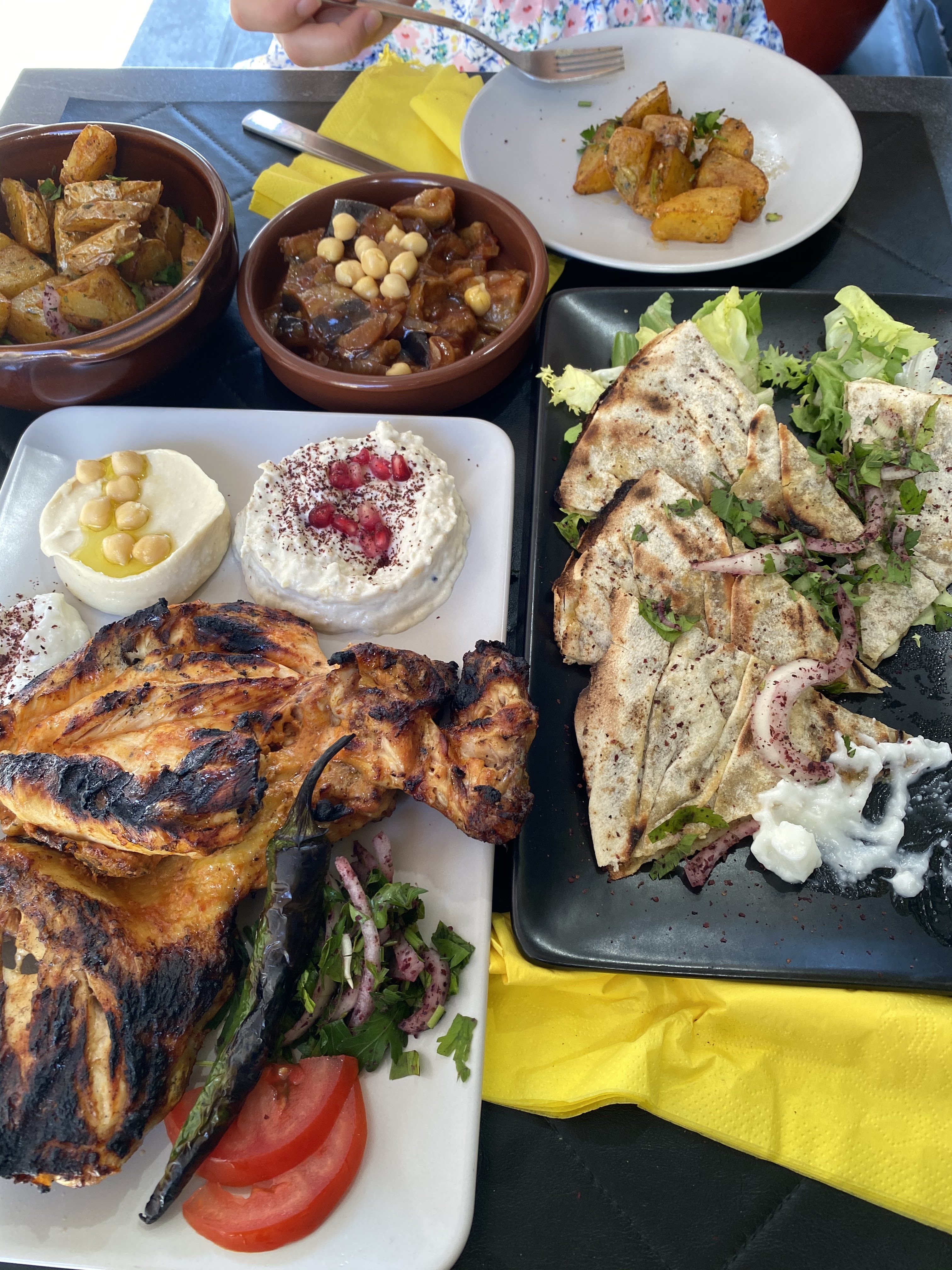 Avant d y aller, j avais vu des super remarques. J avoue être un peu déçu. J ai pris la moitié d un poulet braisé. Le poulet ressemblait plus à une caille vraiment très petit, la batata hara froide et pas beaucoup de goûts, le pain froid, le houmous est correct. Le service est aussi correct. Les prix sont un peu chère pour ce qui est proposé. Le port du masque est aussi optionnel ... Vraiment moyen.