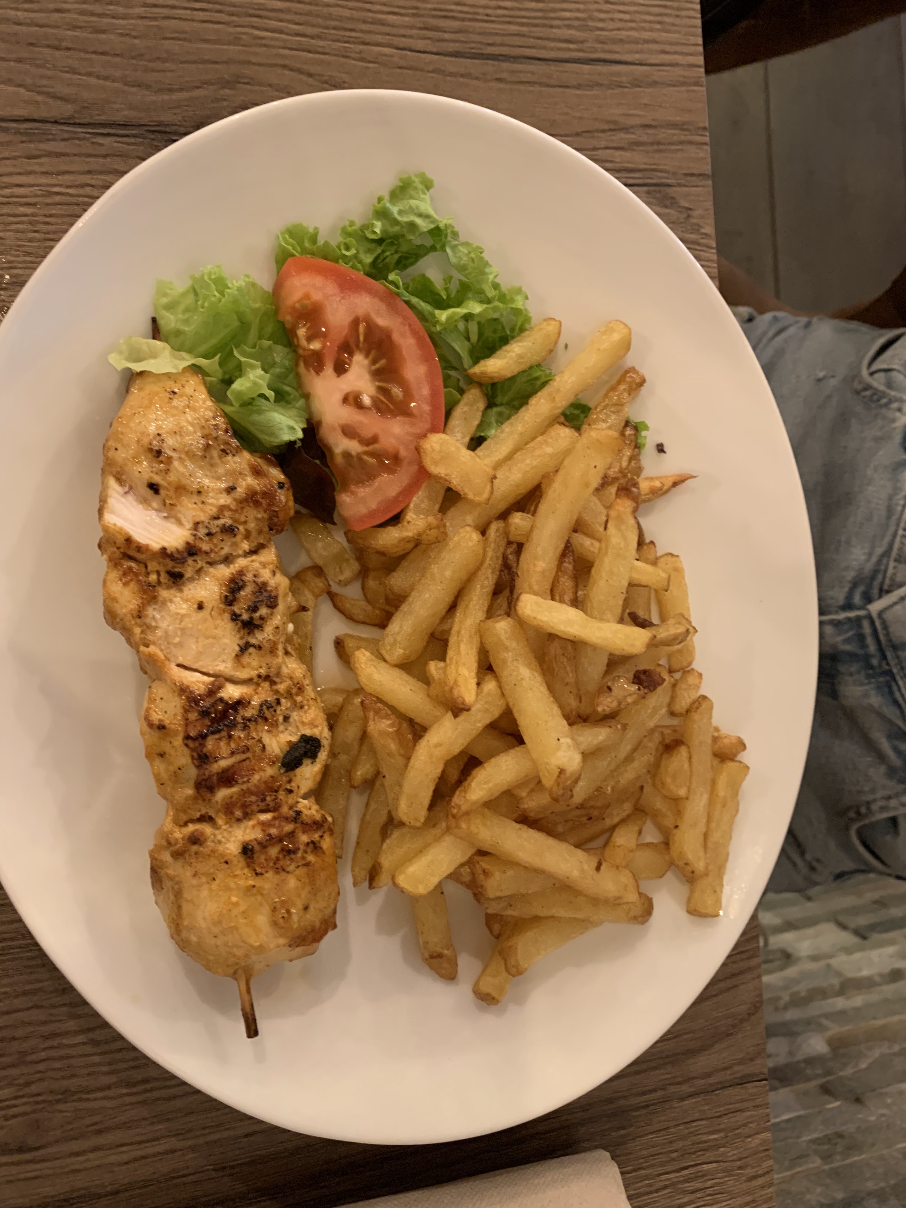 Plat a emporter trop de brochette excellent épicé parfaitement et plein de petite mise en bouche vraiment je conseille le pain est très bon .