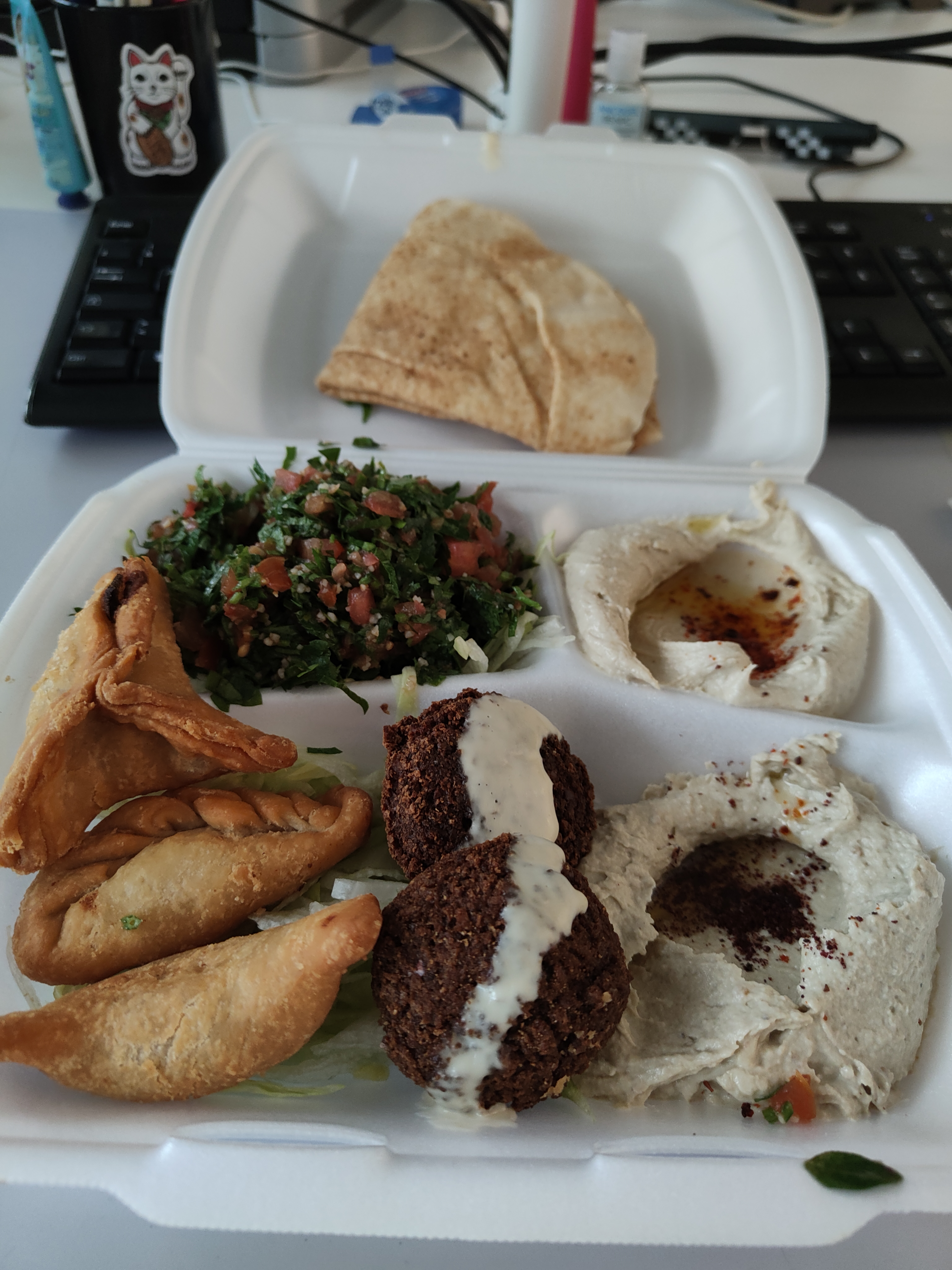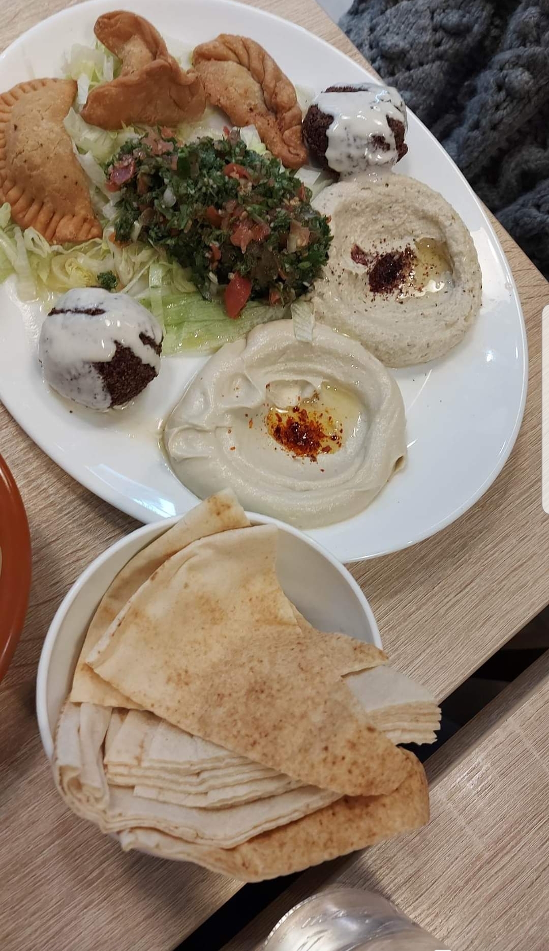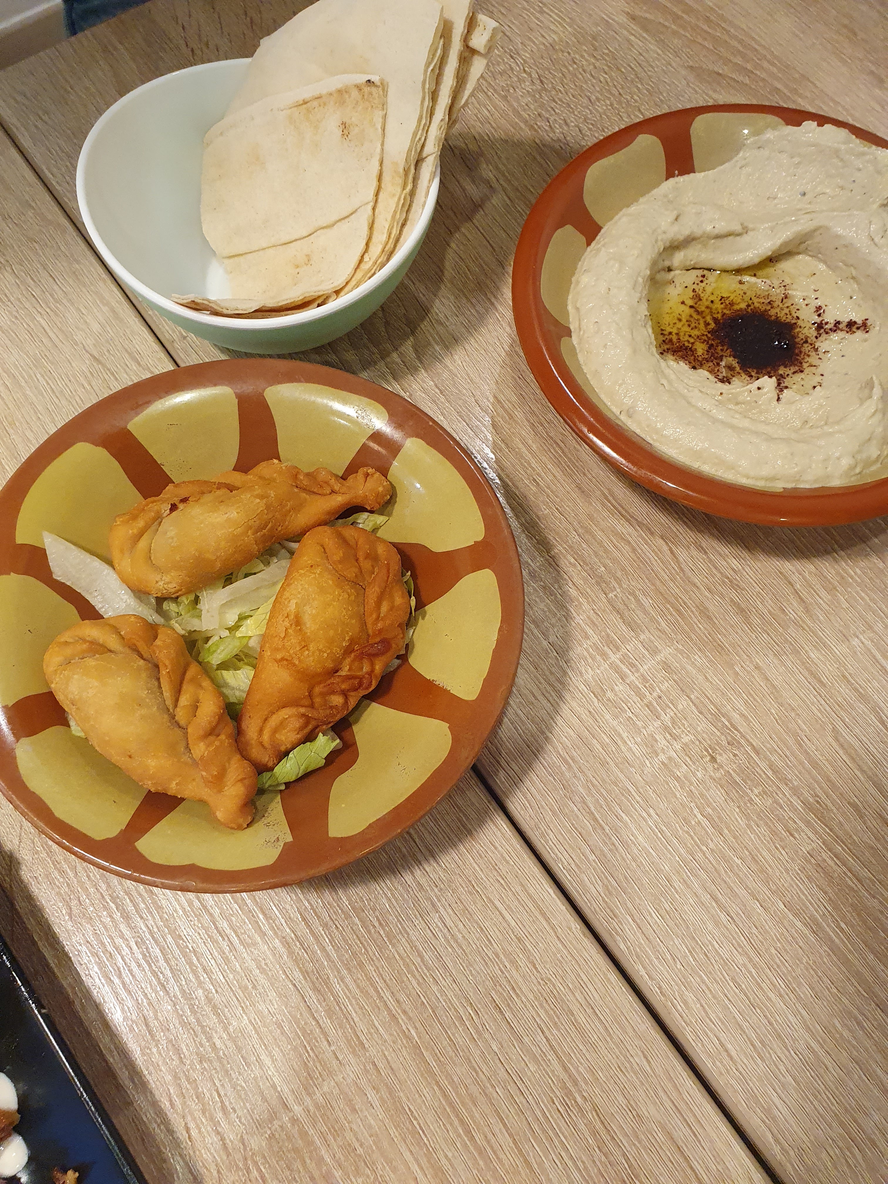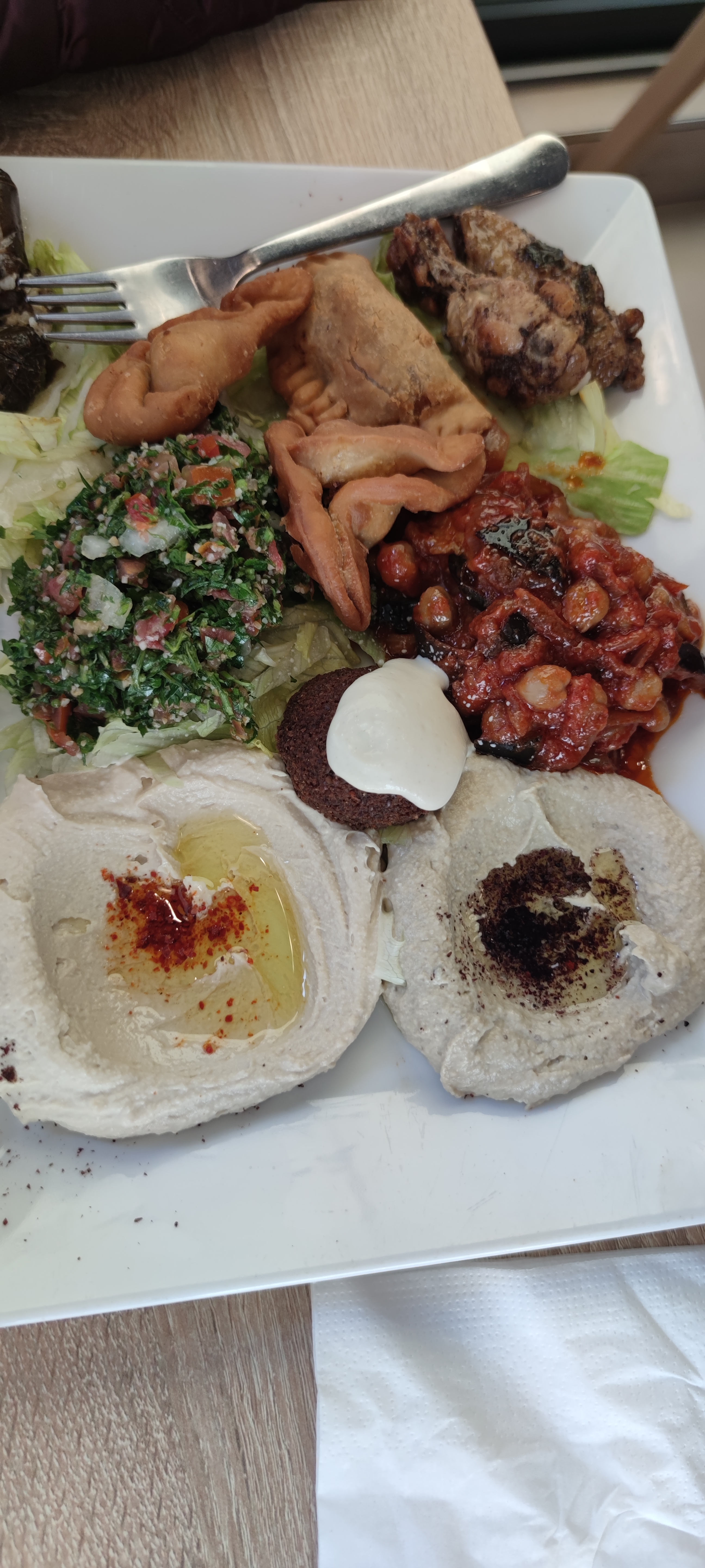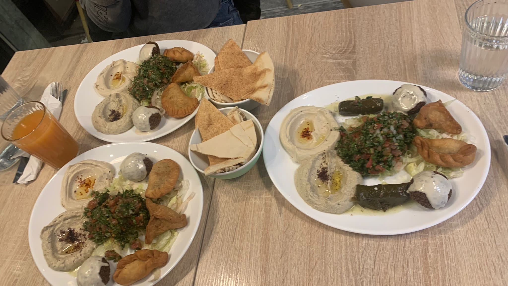 Le falafel était ok mais sans plus et le reste de l’assiette était bof. Les chaussons manquent de cuisson et la pâte est trop épaisse, c’est peut-être pas du fait maison. La salle est pas très grande, les tables sont trop collées l’une à l’autre.