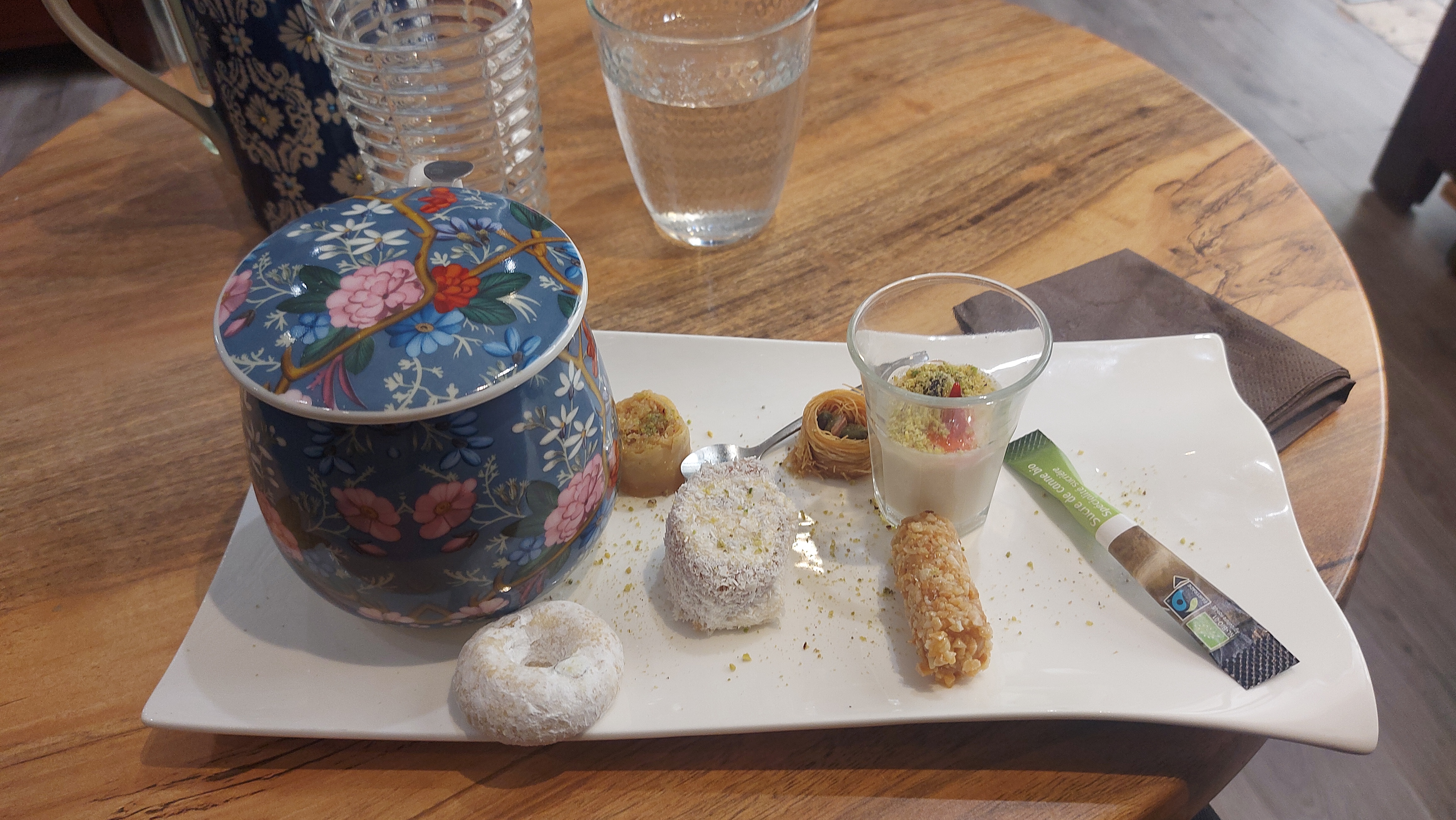 Une gentillesse hors pair ...j'aime l'ambivalence du lieu .... Pâtisserie orientale sous cloche .. salon de thé ou resto.... Assiette de spécialités je recommande...je ferme les yeux , je peux m'imaginer déjeuner sous un cèdre du Liban ,, les mains réchauffés par la douceur d' un thé . Réchauffement de mes sens les plus naïfs , ceux de l'enfance par l' appétence de gâteaux .. miel , pistaches.. j'ai voyagé ..