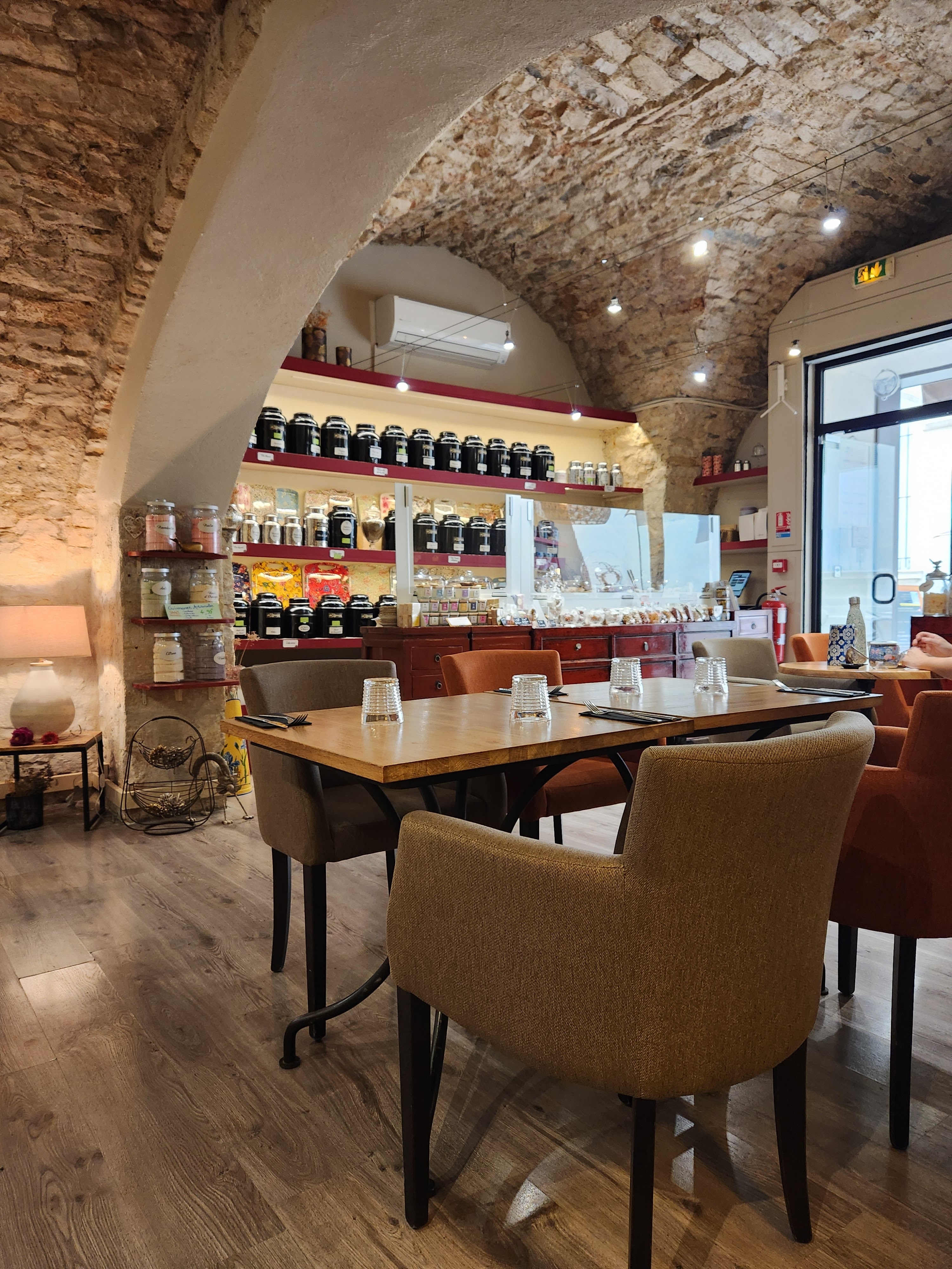 Très bon chocolat chaud à l'ancienne. Pâtisseries orientales. Large choix de thé. Service agréable dans une salle voûtée en pierre. Recommandé pour une pause gourmande. Possibilité de déjeuner sur place jusqu'à 17h.