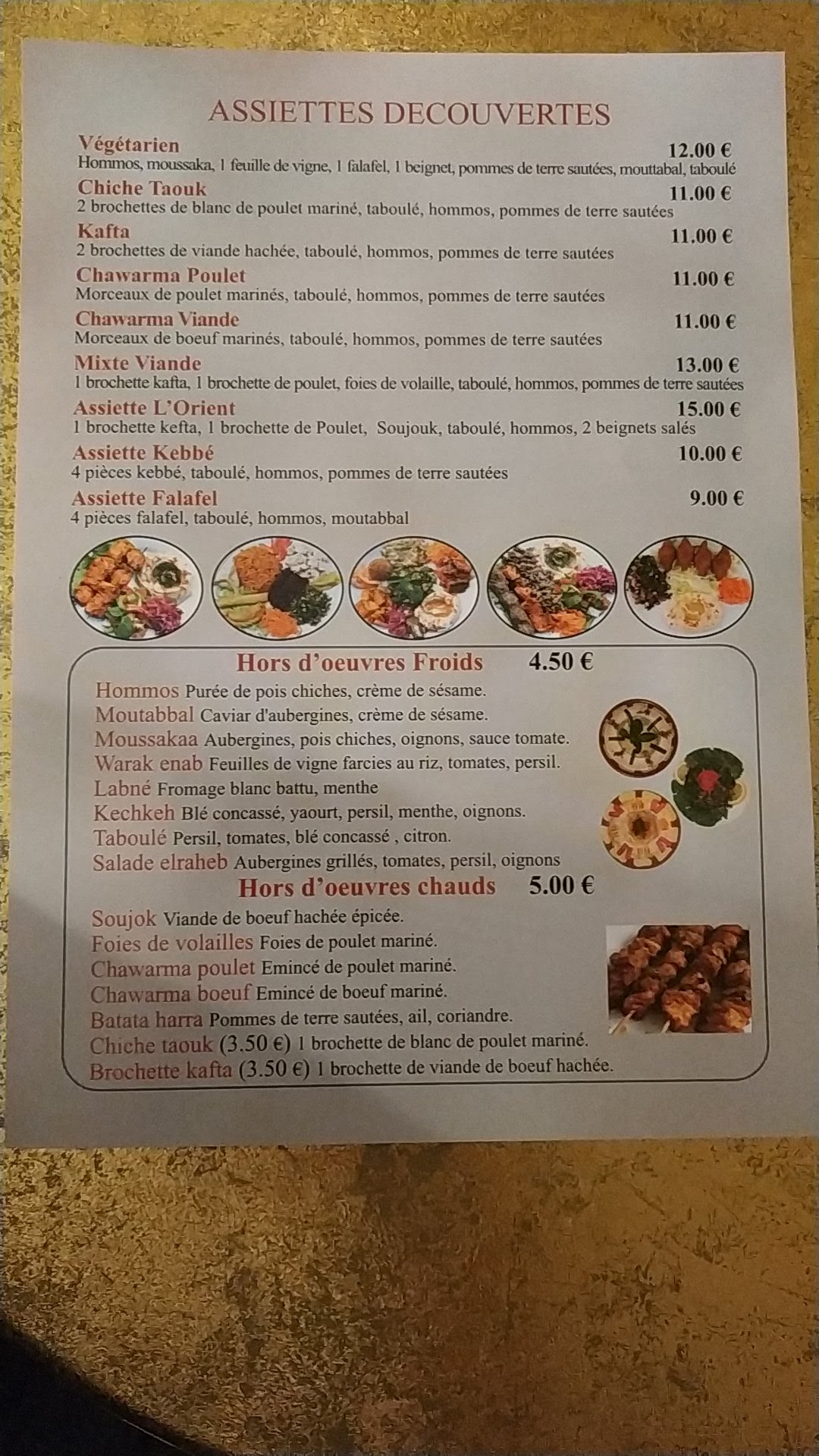 On a tenté l'experience à emporter même si a 20 minutes de chez nous. Pour gouter un peu tout, on a choisi l'Assiette l'Orient la plus complète et donc la plus chère aussi. A 16€, je trouvais cela pas donné. ( Sandwich viande aussi à 5.50€) . En fait , apres avoir degusté , c'est un super rapport qualité prix. Les petits mangeurs feront 2 repas vu la qté de viande dans l'assiette. C'etait vraiment excellent, encore chaud apres 20minute de route et l'acceuil est vraiment top pour nous faire patienter pendant la preparation. Une trés bonne experience à renouveler absolument. J'adore.