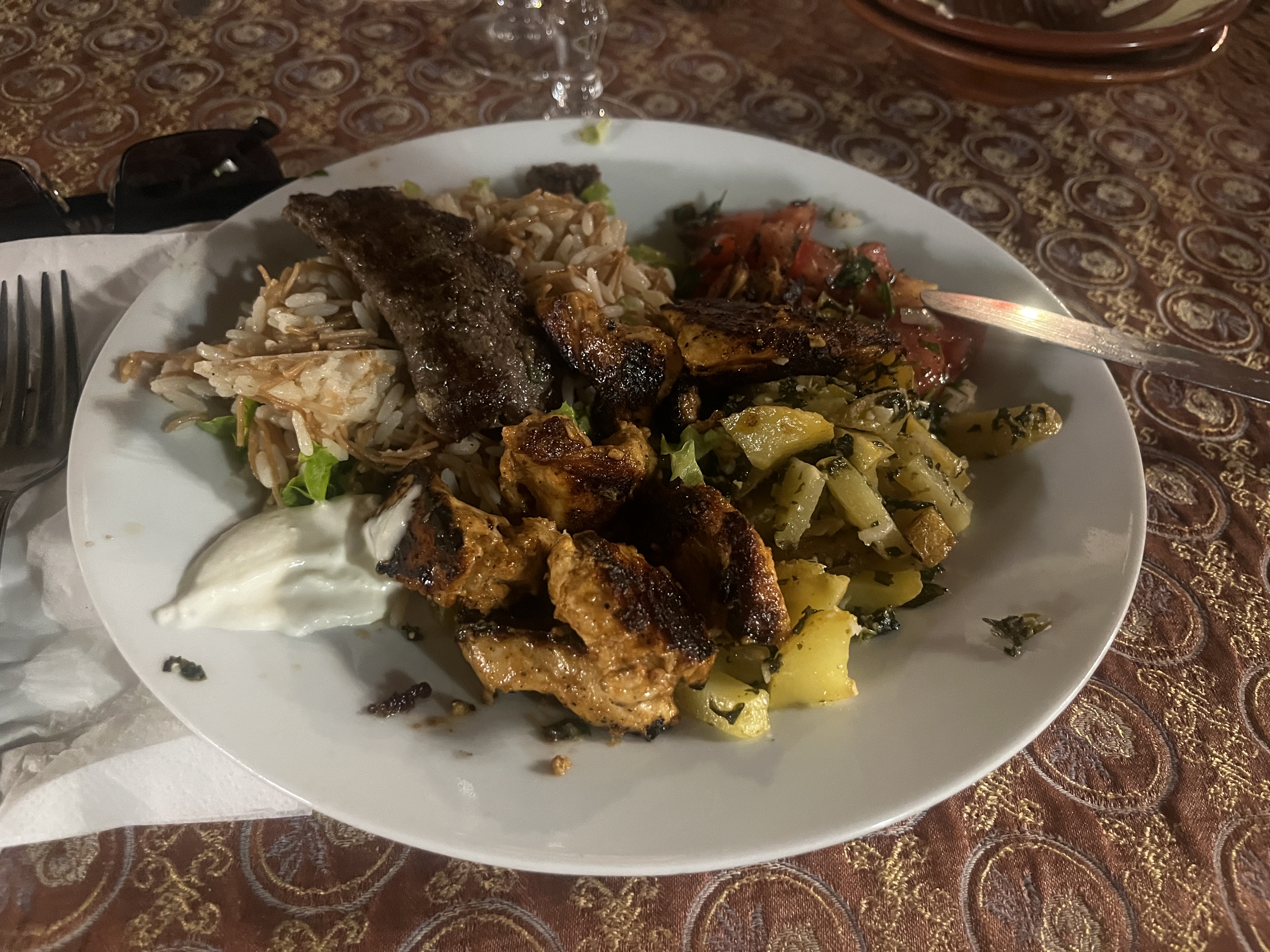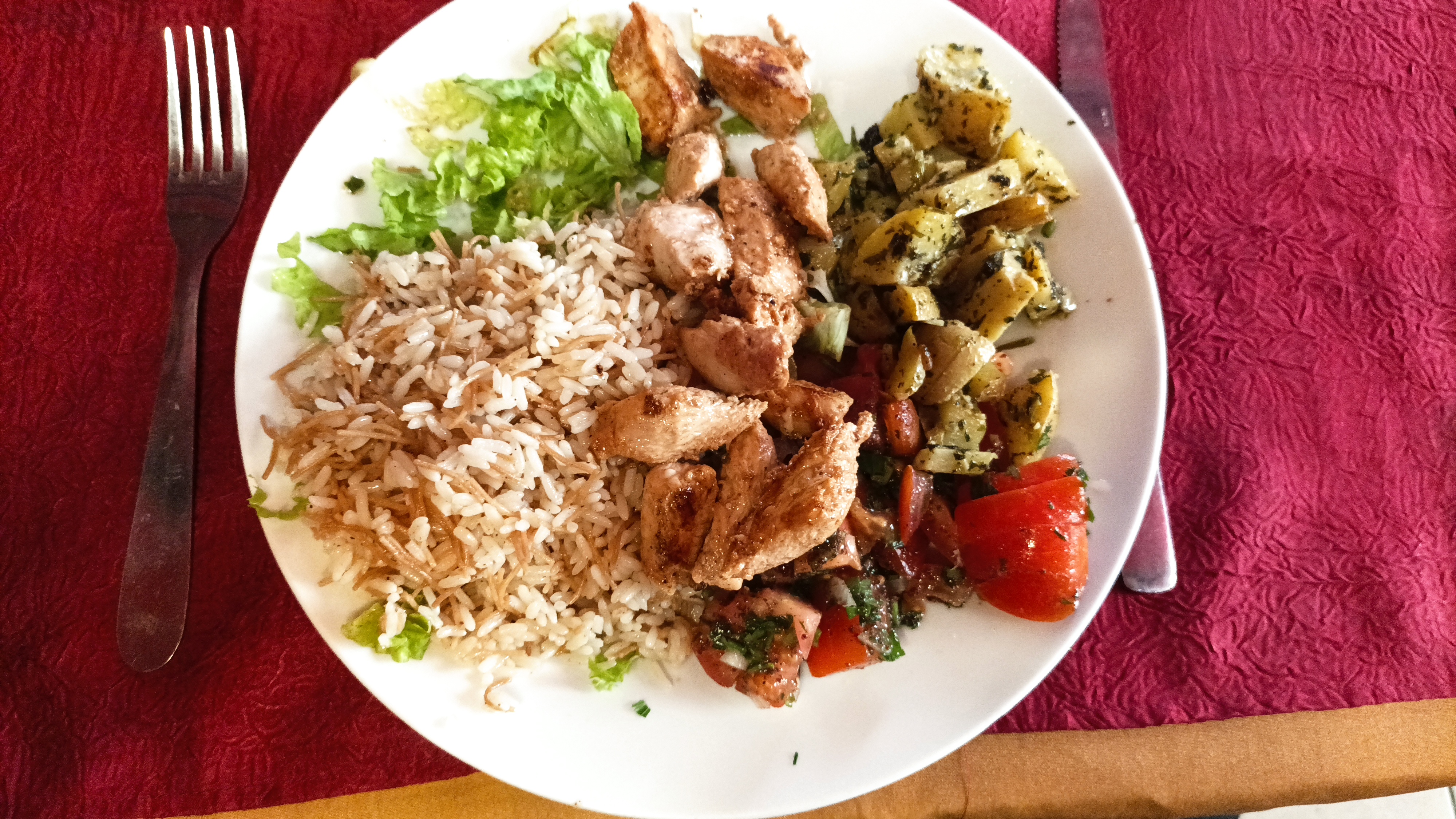 C’était un Dimanche soir, de passage à Tours sous pluie, et pas envie de dîner lourdement alors pourquoi pas un resto Libanais qui de surcroît a une table disponible juste devant la porte d’entrée….En fait j’aurai du passer mon chemin car comme la cuisine asiatique, la cuisine libanaise ne supporte pas d’être bâclée, ni parfaitement fraîche….digestion difficile une partie de la nuit…Le serveur seul, débordé dans une salle comble faisait comme il pouvait avec le sourire, mais ça ne rend pas un service agréable pour le client. Alors la prochaine fois je passe mon chemin.