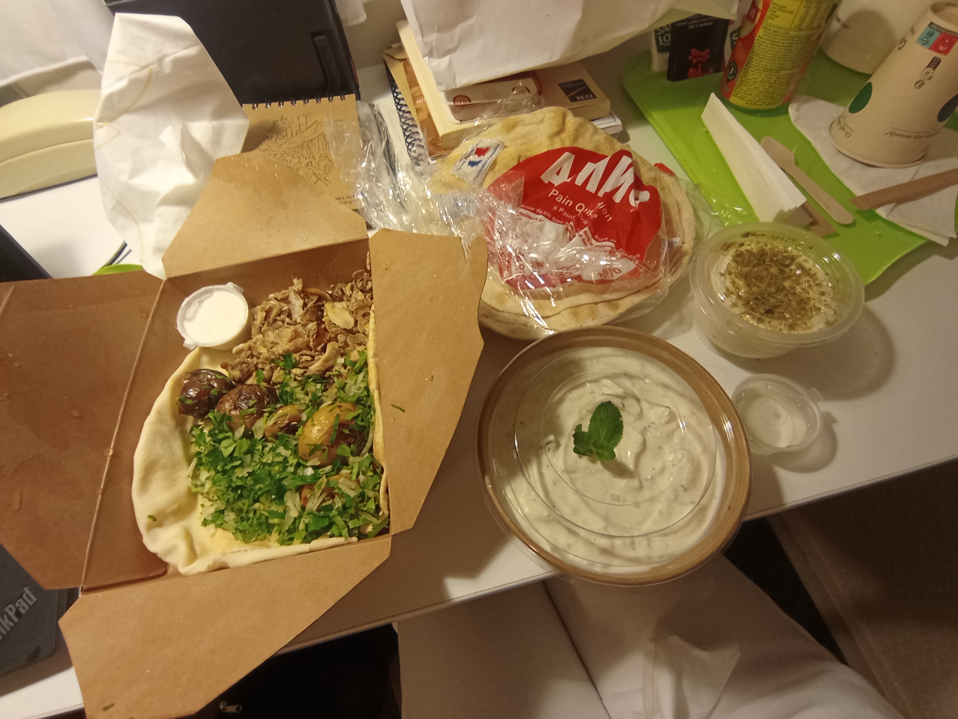 C'était vraiment pas ouf, le poulet était presque trop sec, plein d'oignons dessus, j'ai pas aimé. Le tzatziki était bon mais trop salé. Le dessert était le plus gourmand de la commande.