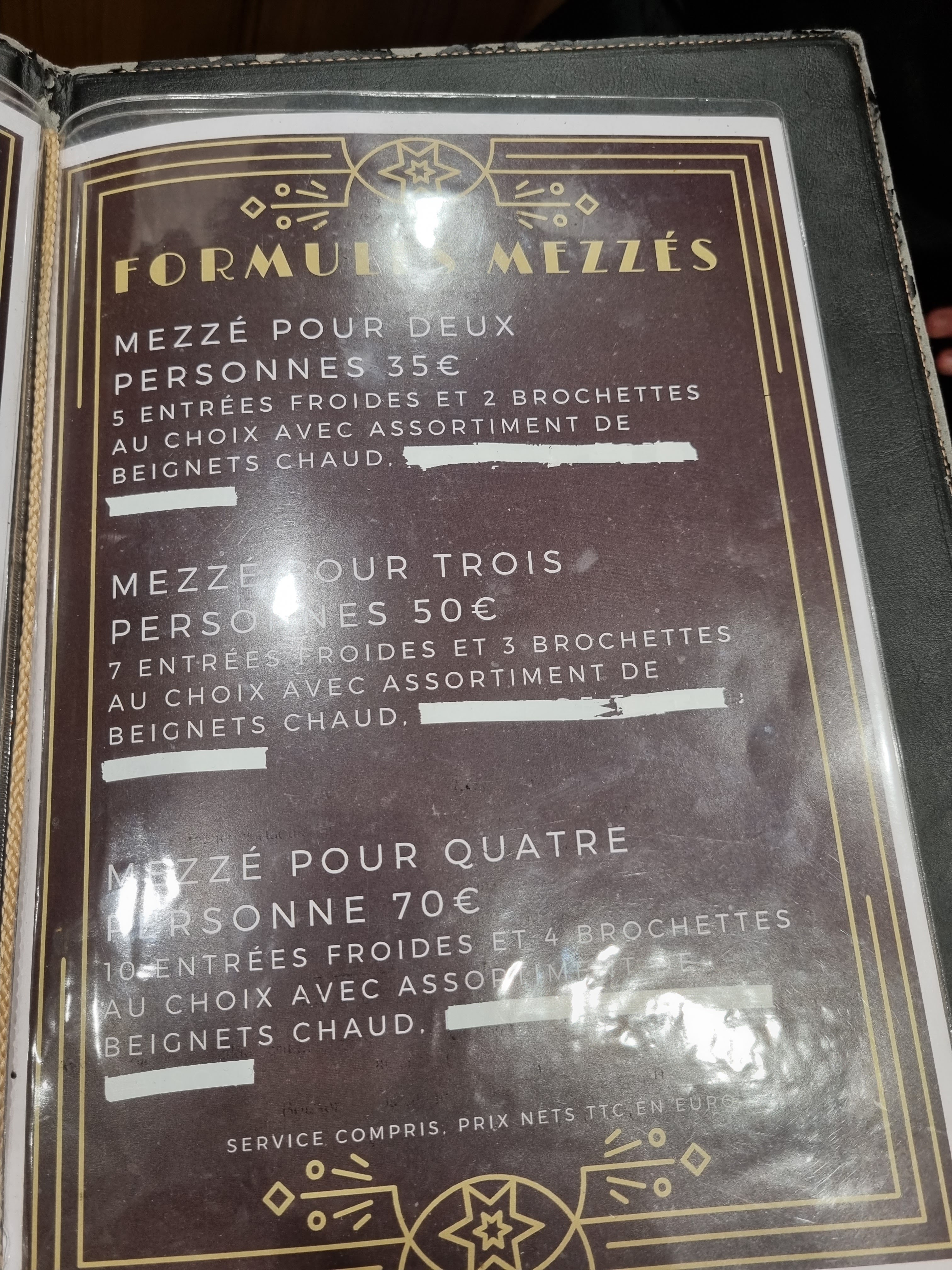 S'il ne fallait noter que le repas, j'aurais mis 5 étoiles car c'est vraiment bon. La formule Mezzé offre l'avantage de pouvoir découvrir toutes les spécialités...sauf que pour 4, la table est vraiment trop petite ( on a empiété sur celle d'à côté libre)...autre bémol, pas de taboulé dans les entrées car il n'y en avait pas, un seul choix de vin rouge, pas de brochette de boeuf car pas de viande, vin servi dans une flûte à champagne car plus de verre à vin. Pour un samedi soir à 20h, ça fait beaucoup, dommage. Heureusement les plats rattrapent ces désagréments. Et la jeune serveuse était très agréable.