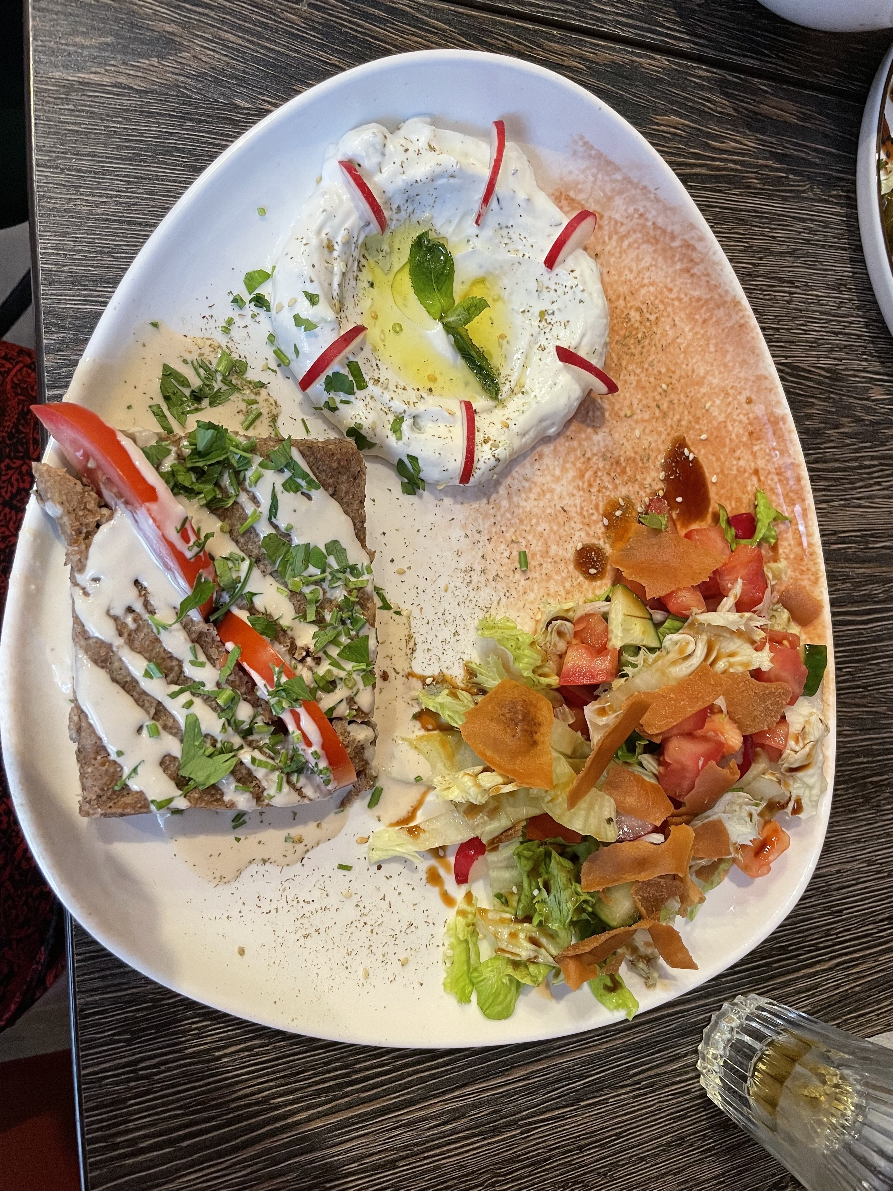 Shawarma boeuf très bon et bien accompagné, service rapide, dessert à la fleur d'oranger et la pistache incroyable, nan vraiment c'était super bon