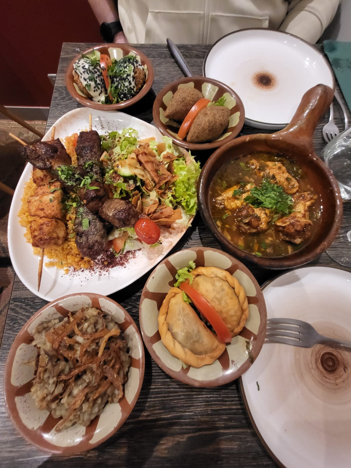 Repas bon, ça a été une réelle découverte pour mon compagnon et moi qui ne connaissons pas la cuisine libanaise. Néanmoins, les serveurs sont désagréables. Nous n'avons pas compris, si c'était par rapport à nous... Mais il y a eu des oublis pour notre commande. Et quand nous partons pour régler l'addition, on nous a suivis , comme si nous allions partir comme des voleurs. Et pour couronner, pas un aurevoir, ni bonne soirée. Le serveurs était très froid avec nous. Nous pensions revenir, mais avec un accueil comme cela, nous n allons pas en parler à notre entourage pour leur permettre d avoir de nouveaux clients. Dommage.