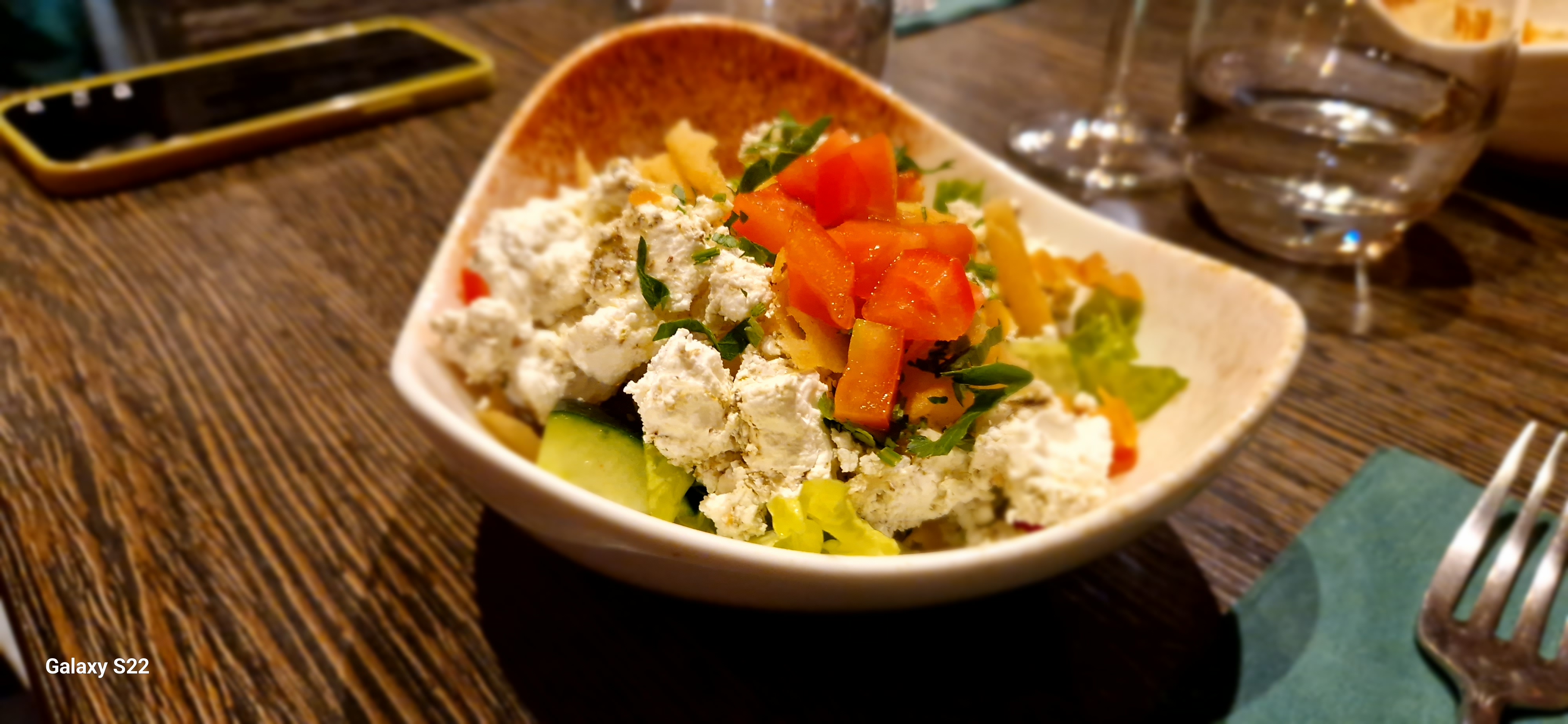 A fuir! Cher pour ce que c'est. La Salade d'orient est une mascarade.. 3 bruns de salade verte avec 1 tranche de concombre coupée en 4!