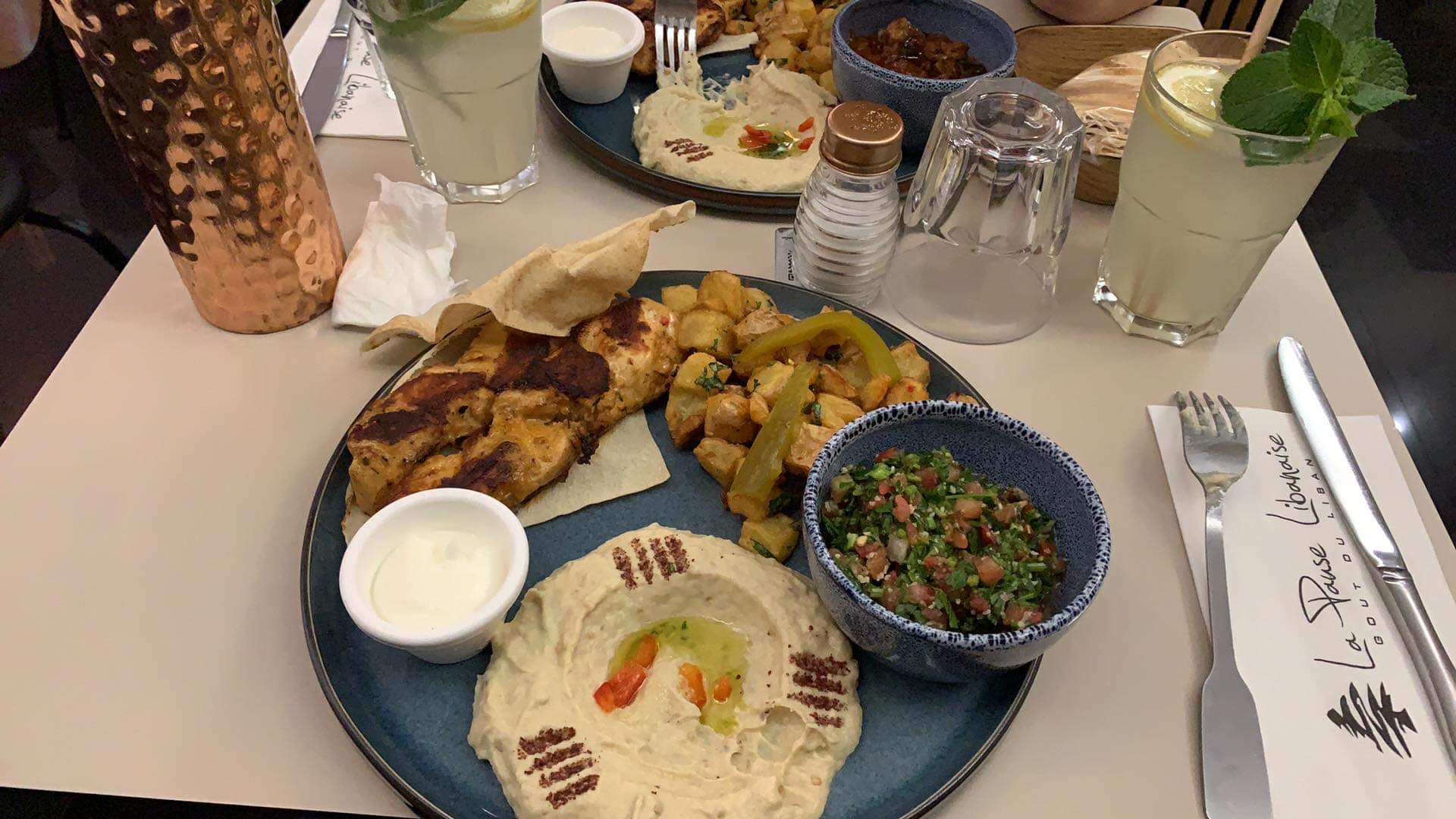 La pause libanaise (le restaurant dans le 8ème), des assiettes généreuses. Un Chawarma poulet avec citronade (20,90€) : poulet peu assaisonné, houmous à l'opposé d'un houmous liquide, ensemble plutôt lourd. Un rapport qualité/prix moyen. Un Chiche Taouk avec soda (20,90€) : brochettes de poulet (bonne texture) mariné au citron (quasi imperceptible, pas du tout sec), un taboulé frais très liquide, un houmous dense peu relevé, des pommes de terre sautées à température ambiante, une crème d'ail sans goût véritable. Un rapport qualité/prix moyen.