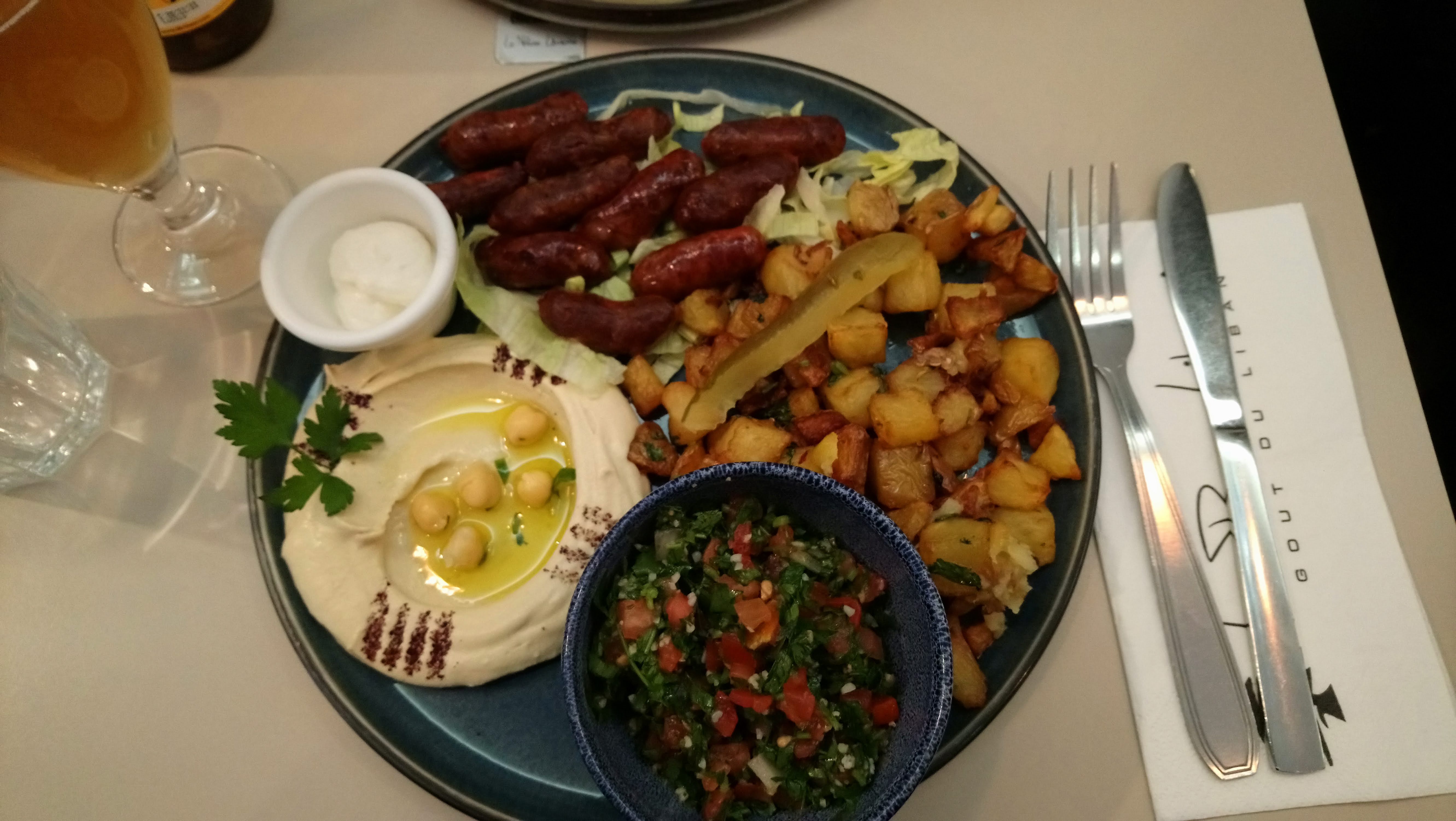 J'ai choisi ce restaurant presque au hasard et je peux dire que sa moyenne de 4,7/5 n'est pas volée. En attendant d'avoir une table à l'intérieur, nous avons pu prendre une bière libanaise en terrasse avec les petites cacahuètes de rigueur. On nous a tenus informés du temps avant que notre table intérieure se libère et le service a été très efficace et sympathique durant toute la durée du déjeuner. Côté nourriture, j'ai découvert les petites saucisses libanaises épicées (légèrement). Les formules du midi sont très pratiques avec une assiette complète + un dessert ou une boisson, pour un prix raisonnable en ces temps d'inflation. Si tous les restaurants de Paris étaient comme ça, ce serait super !