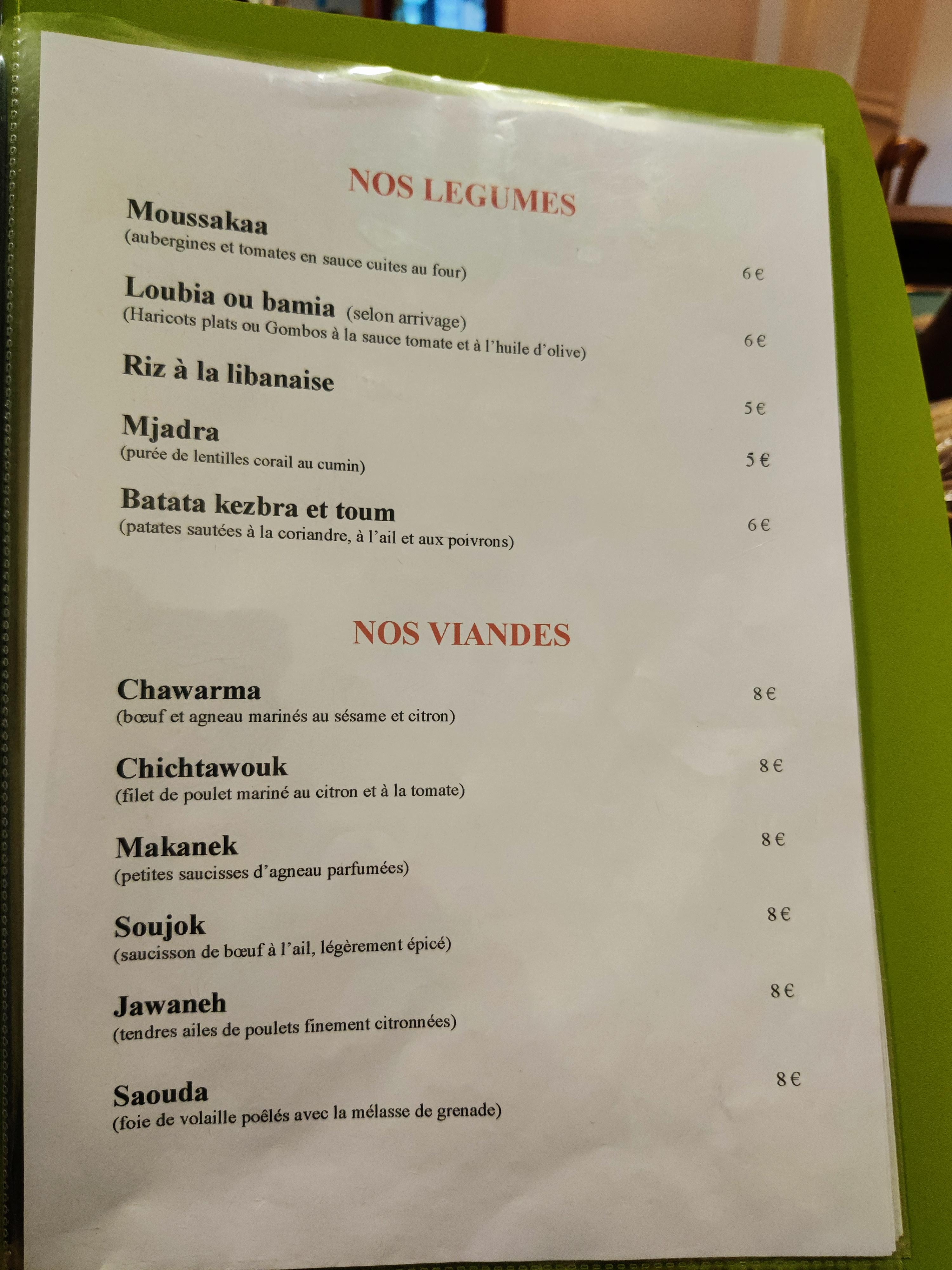 C est pour moi la découverte de la cuisine libanaise. J ai bien aimé l idée de l assiette, j ai choisi la moussaka et filet mariné au citron .avec le dessert le prix est raisonnable. 12 +3 euros. Je recommande ce restaurant et je souhaite bonne continuation à toute l équipe.