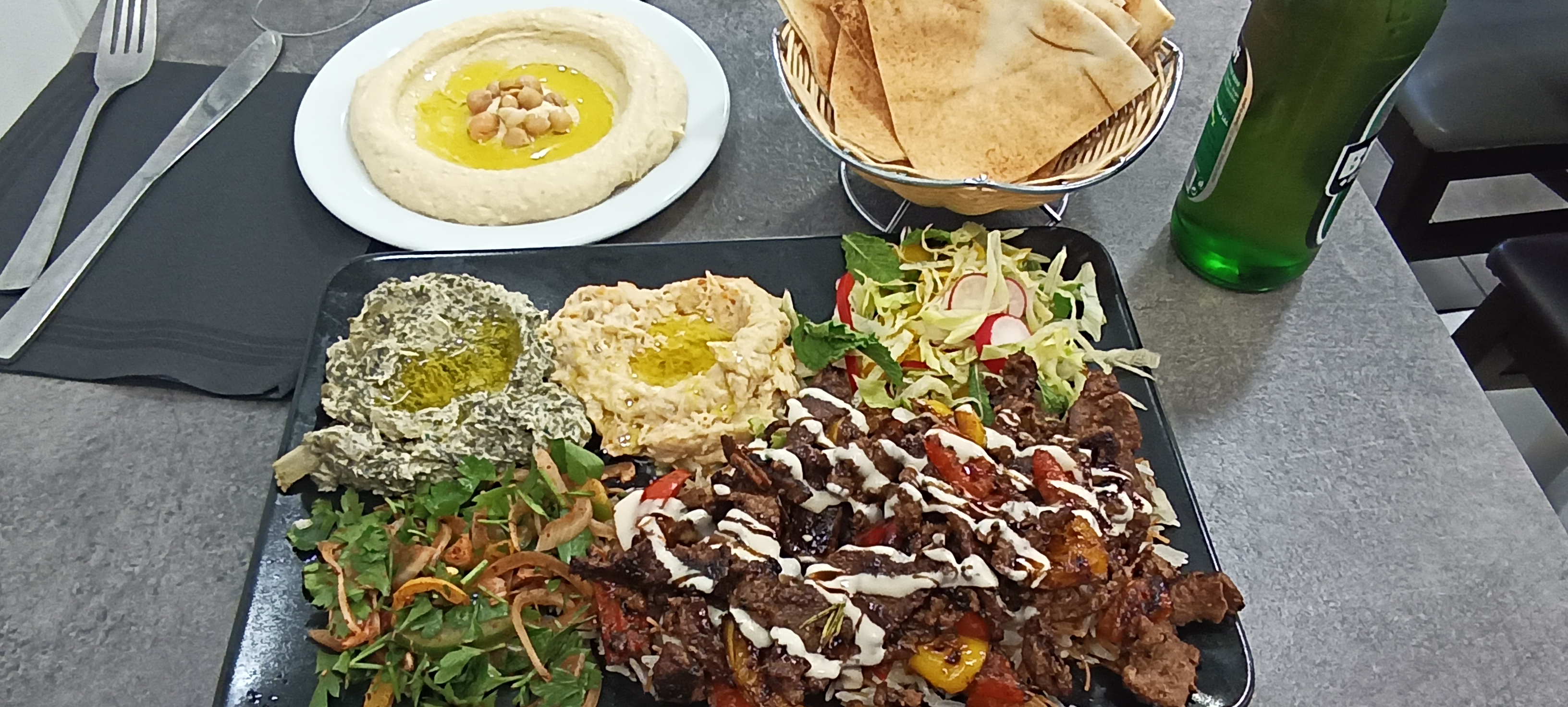 Degeulasse. Nous passions devant on a décider de prendre a emporter. Déjà les tarifs affichés à l'extérieur pour le lahm mechwi était de 8euros 10 et bizarrement au moment de payer c'est 9 € 50. Le taboulé a 6e50 a fini à la poubelle car salé de fou, immangeable et les sandwichs benh dégueulasses, viande quasi inexistante, les poivrons et concombre coupé trop gros, le pain libanais qui tient tout seul tellement il est séché. Vu les avis positifs des autres je me dis que nous avons étés très malchanceux, que la jeune femme qui s'est occupée de nous ne devais pas en avoir envie pour saccager une commande comme ça