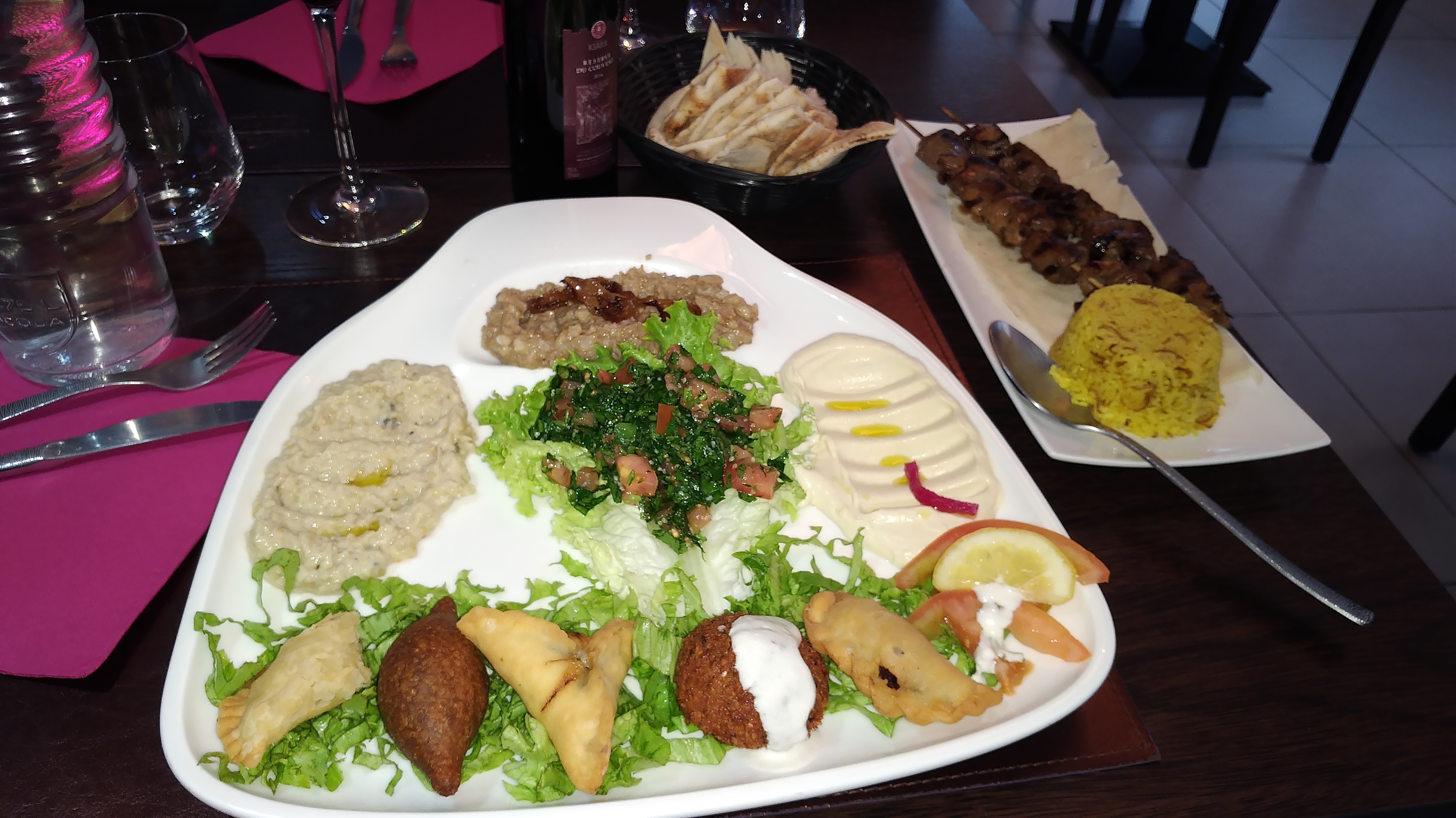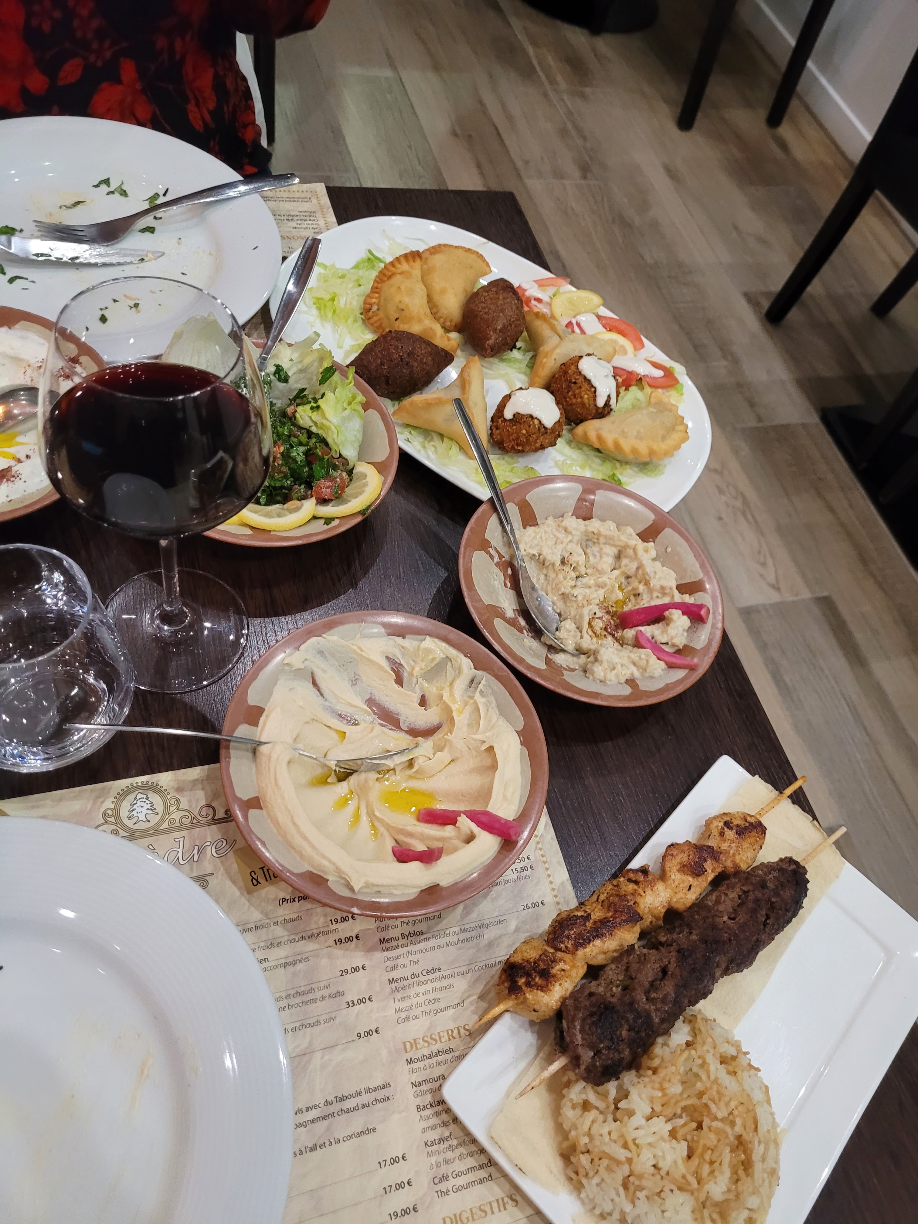 Notre premier repas dans un restaurant libanais c'est soldé par un coup de maitre. Tout était parfait, à quatre nous avons goûté 3 plats différents un Mezze royal (ensemble d'entrées chaudes et froides accompagnées de 2 brochettes) , des crevettes en sauce et des brochettes de viandes (agneau, poulet et viande hachée). Les plats sont accompagnés de taboulé libanais (persil, tomates, menthe et boulgour assaisonné au citron), d'houmous et de riz pilaf, haricots verts ou pommes de terre. Tout est excellent préparé à base de produits frais. Les vins libanais n'ont rien à envier aux vins français. Une excellente soirée et un très bon repas que nous n'hésiterons pas à refaire.