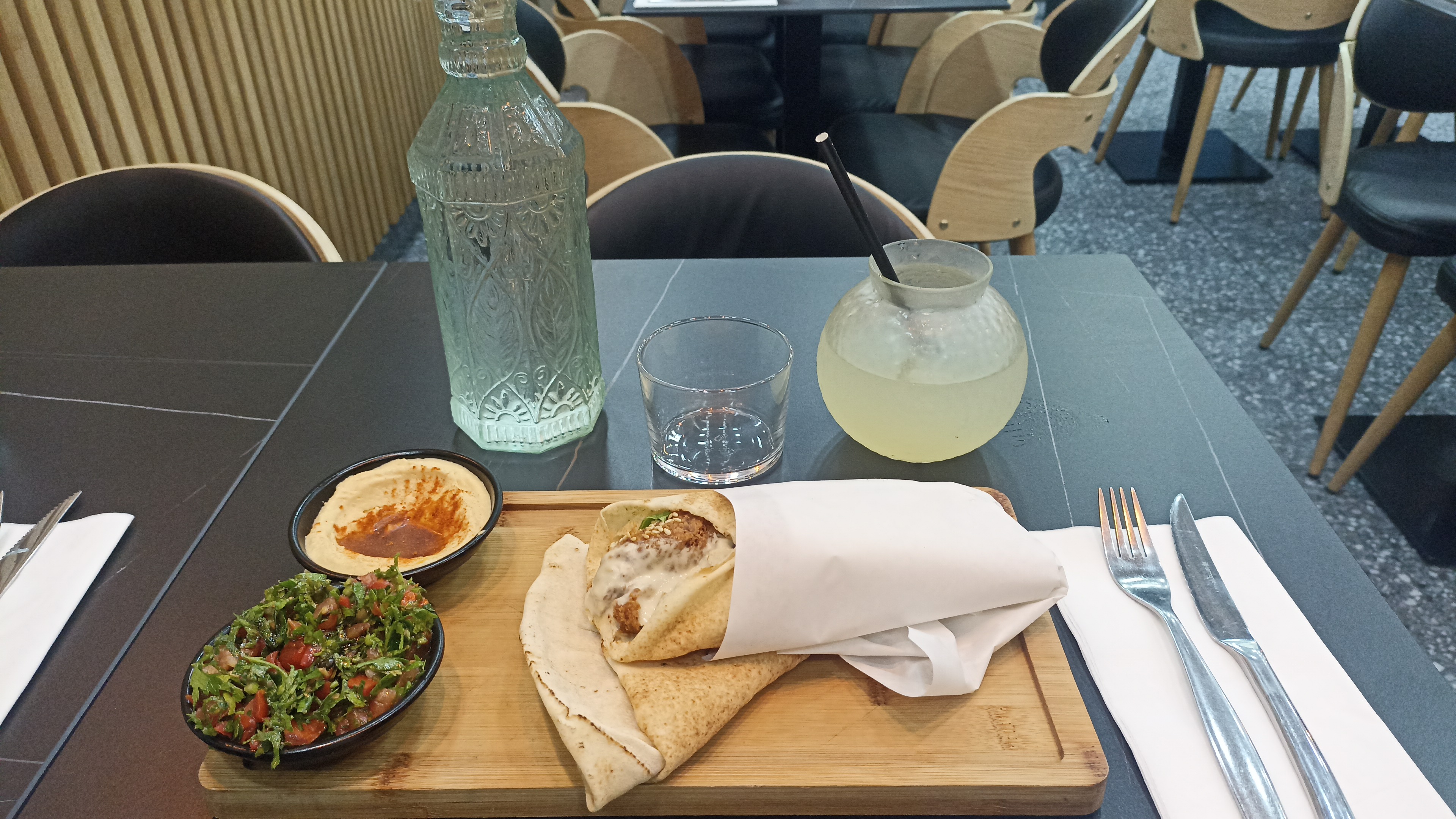 Ma première fois dans un restaurant Libanais. Un très bon accueil, n'y connaissant rien du tout le serveur très agréable nous à expliqué comment sont préparées les assiettes. Depuis longtemps j'ai toujours voulu goûter des falafels. Et je ne suis pas déçu. C'est très bien assaisonne, épicé juste ce qu'il faut. Le houmous est super. La petite salade est fraîche. J'ai adoré le petit plus a la fin, le petit verre de thé.
