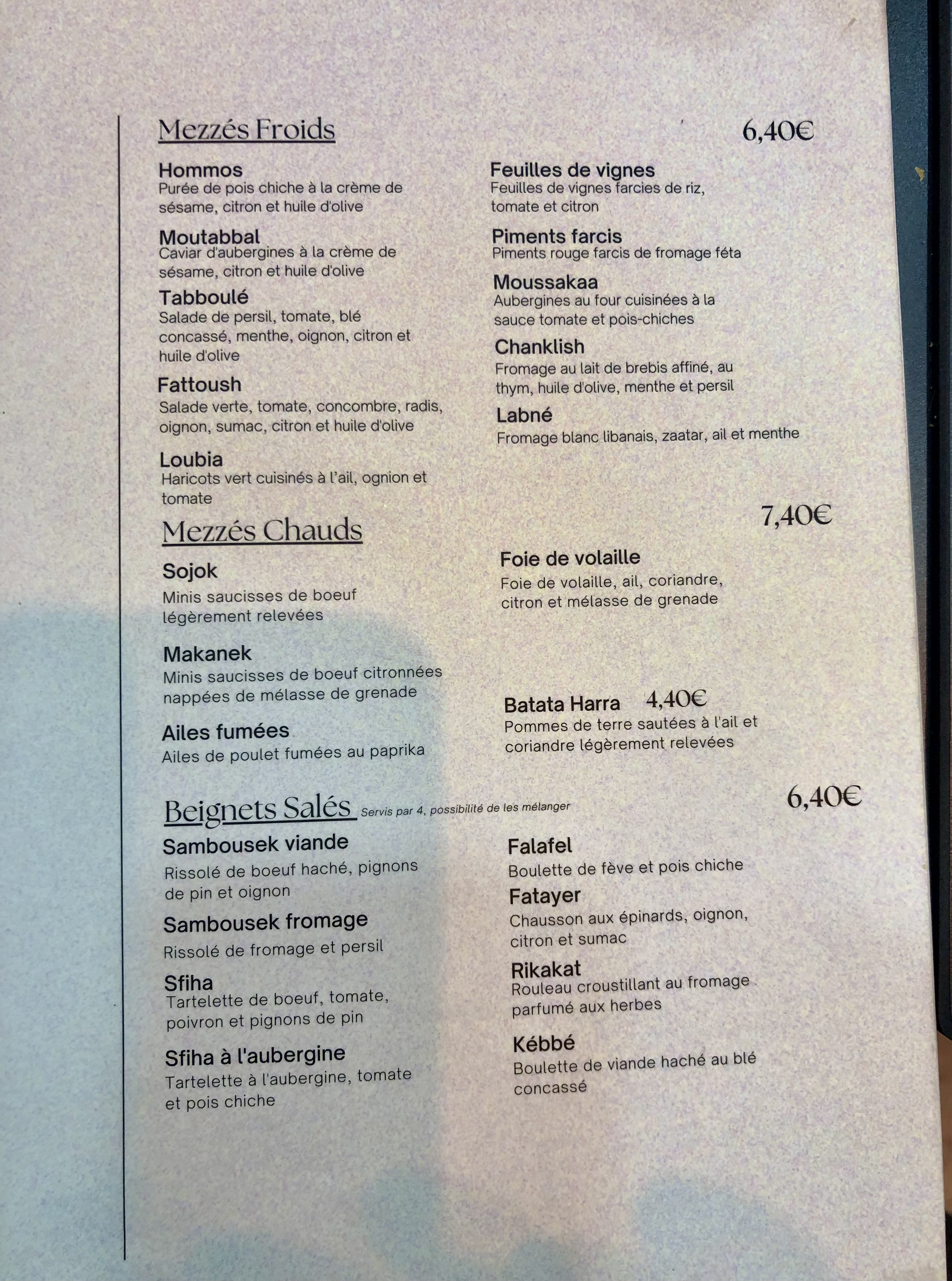 Les mezzes sont incroyables ! Vraiment trop bon et le personnel hyper gentil. Juste Un peu compliquer pour se garer.