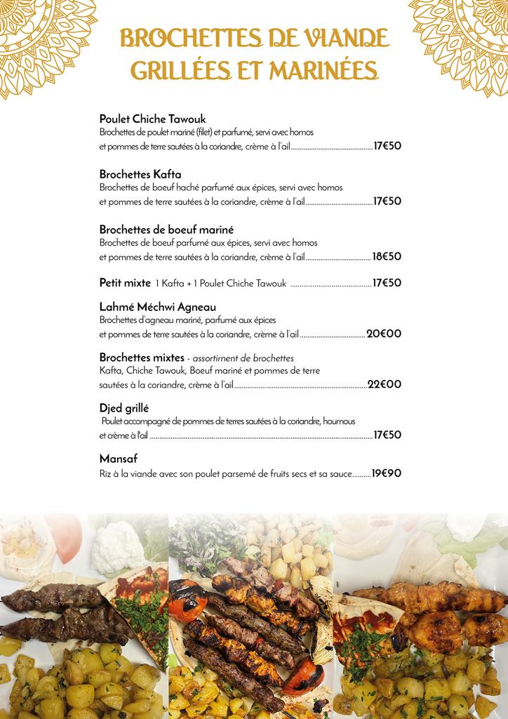 Beaucoup trop cher pour la quantité et la qualité proposée, c était plutôt bon hormis certaines pièces de viande mais à ce prix pour certains plats on s attend à quelque chose de supérieur surtout quand la brochette de viande seule revient entre 5 et 10 euros. Les desserts et les thés ne sont pas très bon. Le cadre est très bien.