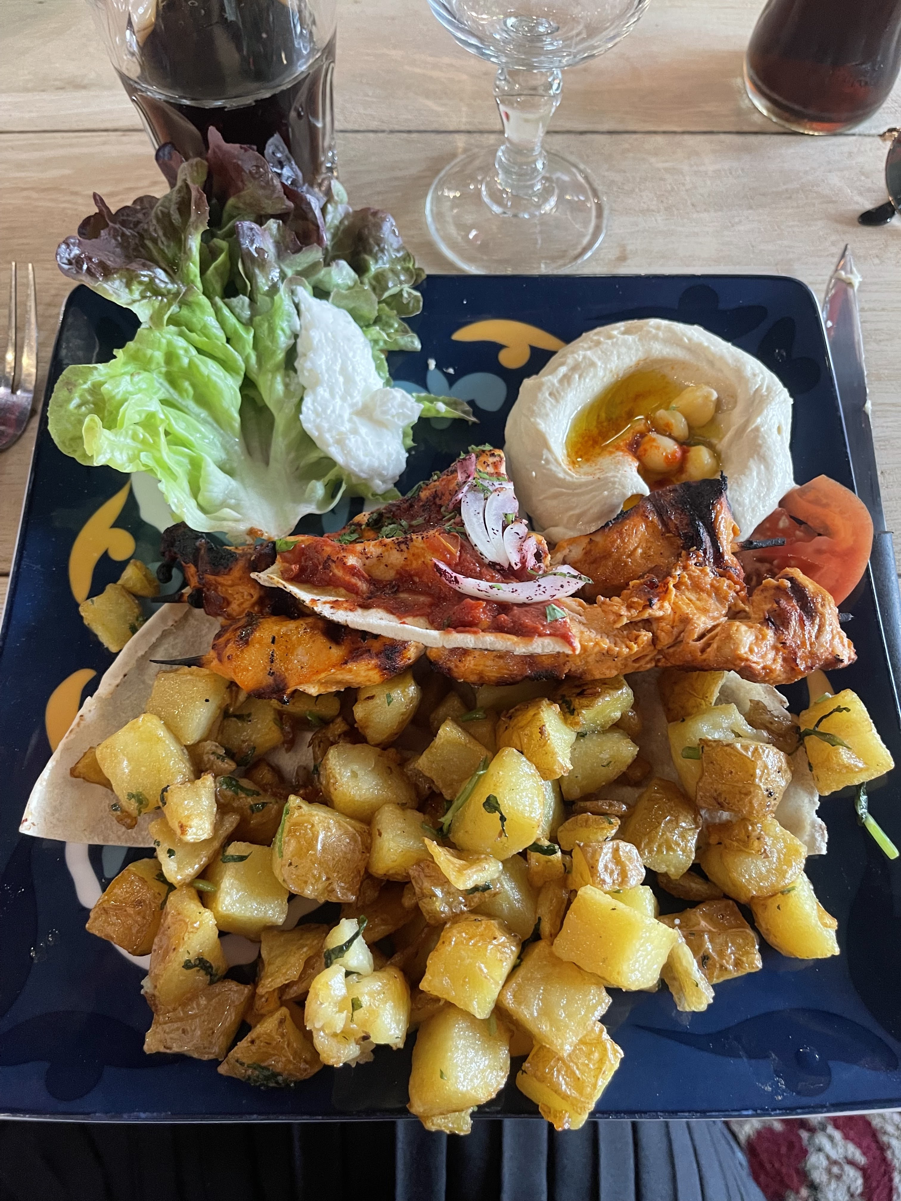 Vraiment un super cadre et nous avons bien mangé qualité des produits frais et diversifiés semons les goûts Nous avons pris les mezés froid et chauds 6et 6 …. Ça suffit et cela permet de goûter à tout … Cependant la brochette me faisait trop envie !!! La prochaine fois