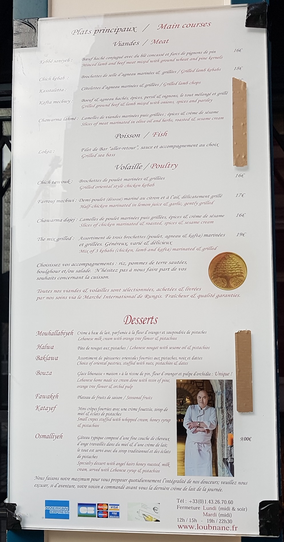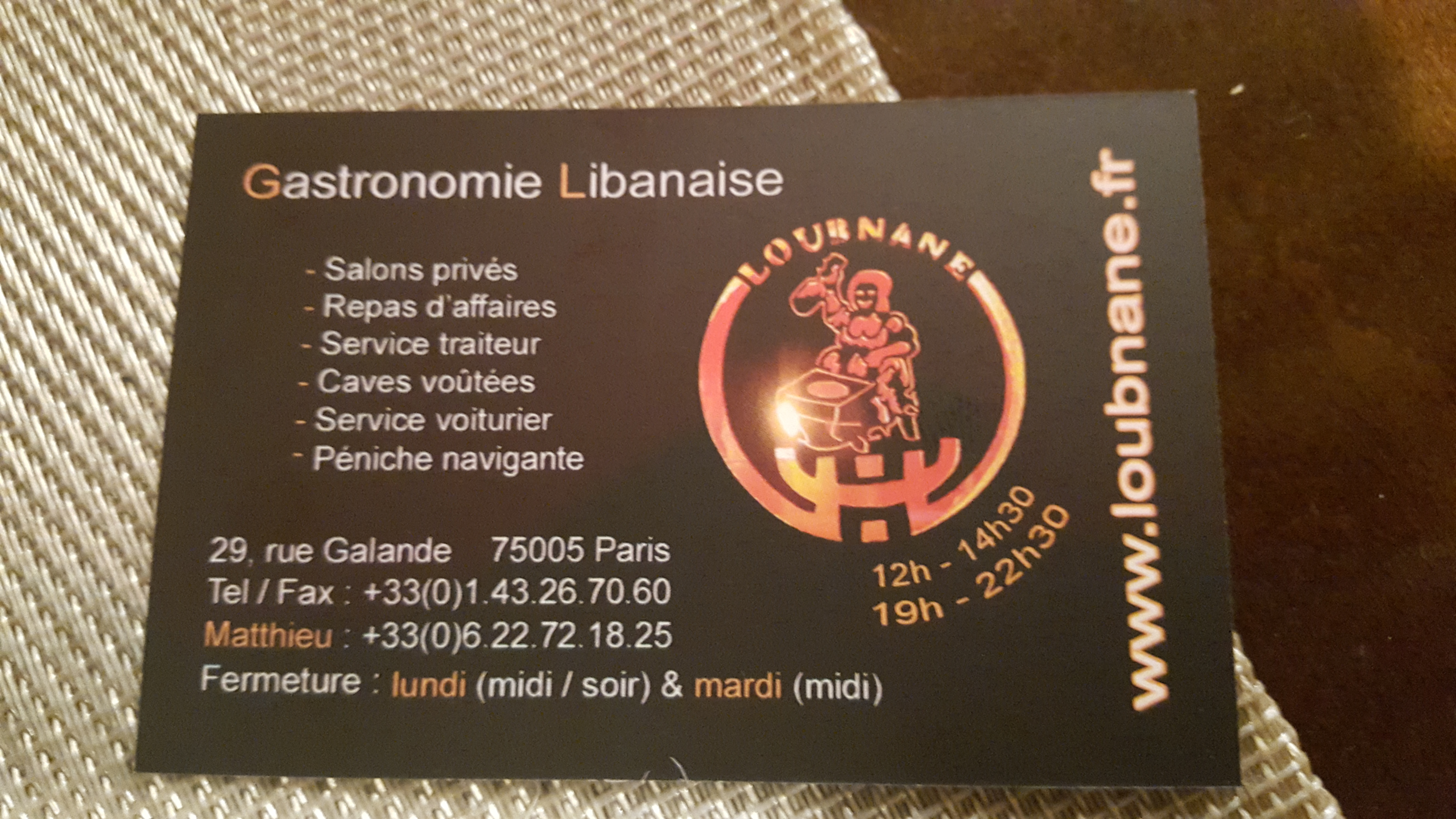 Peut-on être encore objectif quand on connaît un restaurant depuis presque 30 ans ? On peut toujours essayer. Mais il est vrai qu’il n’y a pas grand chose à redire sur la cuisine proposée par le Loubnane. Même une (difficile !) amie libanaise à qui je faisais découvrir l’endroit il y a trois ans en a fait une de ses cantines. C’est tout dire ! Il est vrai que je fais aussi assez mal mon métier dans cet établissement puisque je me contente du très large assortiment de mezzé qui suffit largement à rassasier l’ogre que je suis. Ma préférence va aux Rakakat, ces délicieuses petites cigarettes de fromage de chèvre enroulées dans une feuille de brik et frites. A manger dès leur arrivée sur la table car bien meilleures très chaudes. Ensuite, les Arrayes pourraient constituer tout mon repas. Petits pains farcis à la viande et aromates puis grillé au four. Je ne vais pas vous faire un inventaire à la Prévert des houmous, baba ganesh et autres samboussek (fromages ou viandes) qui parsèment la carte. Tant un cuisinier fidèle que des dizaines d'années d'expérience donnent à tous ces plats une régularité qualitative irréprochable. Pour les amateurs, on notera la présence du kebbé nayé, tartare d'agneau et boeuf cru, mélangé à du blé concassé. De plus, la diversité des Mezzés permet aux végétariens d'accomplir un dîner varié sans se sentir la cinquième roue du carrosse. J'y ai emmené des clients Indiens végétariens qui ont été épatés tant de la cuisine que du fait que ce soit la cantine parisienne d'un des plus gros miliardaires indiens ! Si vous souhaitez une livraison à bord de votre jet privé au Bourget, la maison sait faire. Les desserts restent cependant un suicide diabétique, que ce soit sous format pâtisseries sèches à base de miel ou fraiches avec de la crème. Dont le fameux Mouhallabiyeh, dont la difficulté de prononciation est inversement proportionnelle à la facilité de dégustation. Un délice mais gare à l'abus. Mais les propriétaires ne se reposent pas sur leurs lauriers. Ils créent parfois certaines variations pour ne pas se figer dans la tradition. Et me font parfois l'honneur de me demander mon avis. Entre autre pour des desserts plus light ! Comme nous sommes dans un des plus vieux quartiers de Paris, le sous-sol récèle son jardin secret sous la forme d'une cave voutée aménagée, tant pour des groupes que pour des repas plus discrets. Enfin, pour ceux qui souhaiteraient réaliser des événements spéciaux, Matthieu Nassif est co-gérant d'une grande péniche pouvant vous accueillir pour des soirées sur la Seine. A un tarif plus que convenable, vous pouvez donc organiser tant des réceptions que des anniversaires avec la totalité de la prestation alimentaire incluse. J'étais testé pour vous et ce fut parfait ! Ouvert depuis 1984, on ne peut qu'espérer qu nous serons tous là pour féter les 40 ans de l'établissement en 2024.