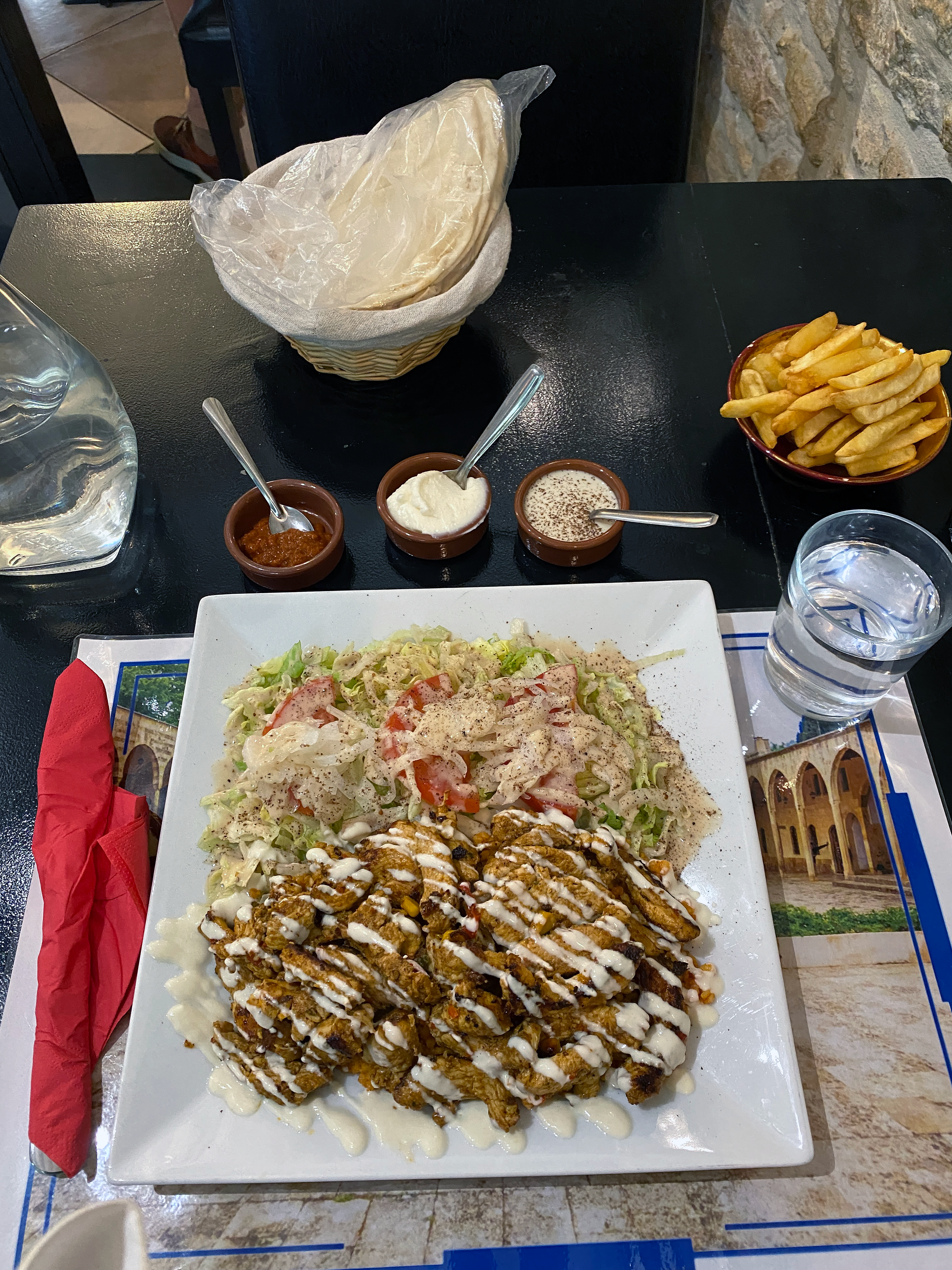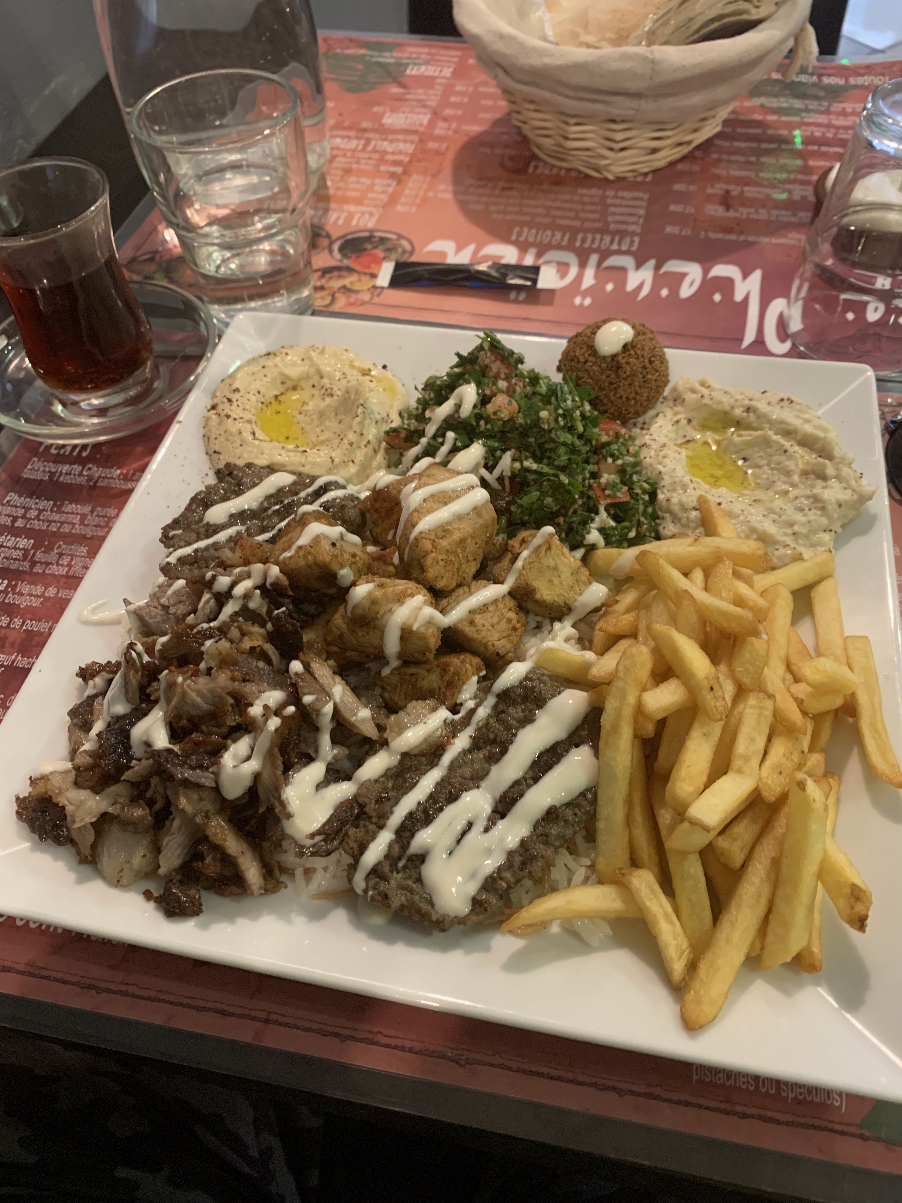 excellent,ils sont super aimable,la nourriture est top,la sauce a l'ail une merveille,la viande du shawarma,un delice,thé offert a chaque fois,houmous tres souvent,merci bcp