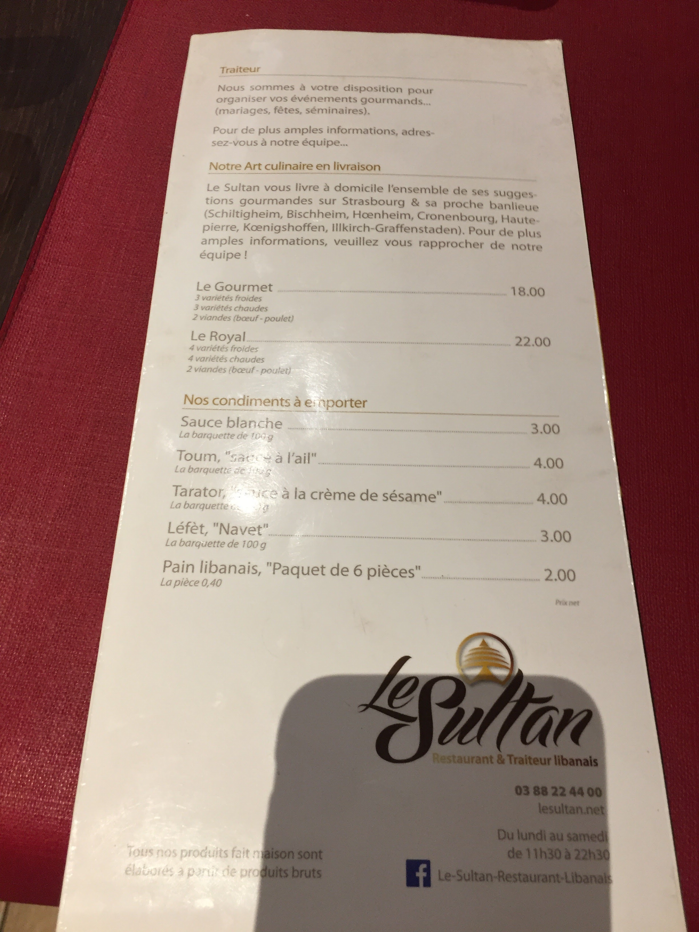 Restaurant Libanais situé 7 passage de la pomme de pain proche de la place Kleber. Le Sultan prépare une cuisine de bon niveau.