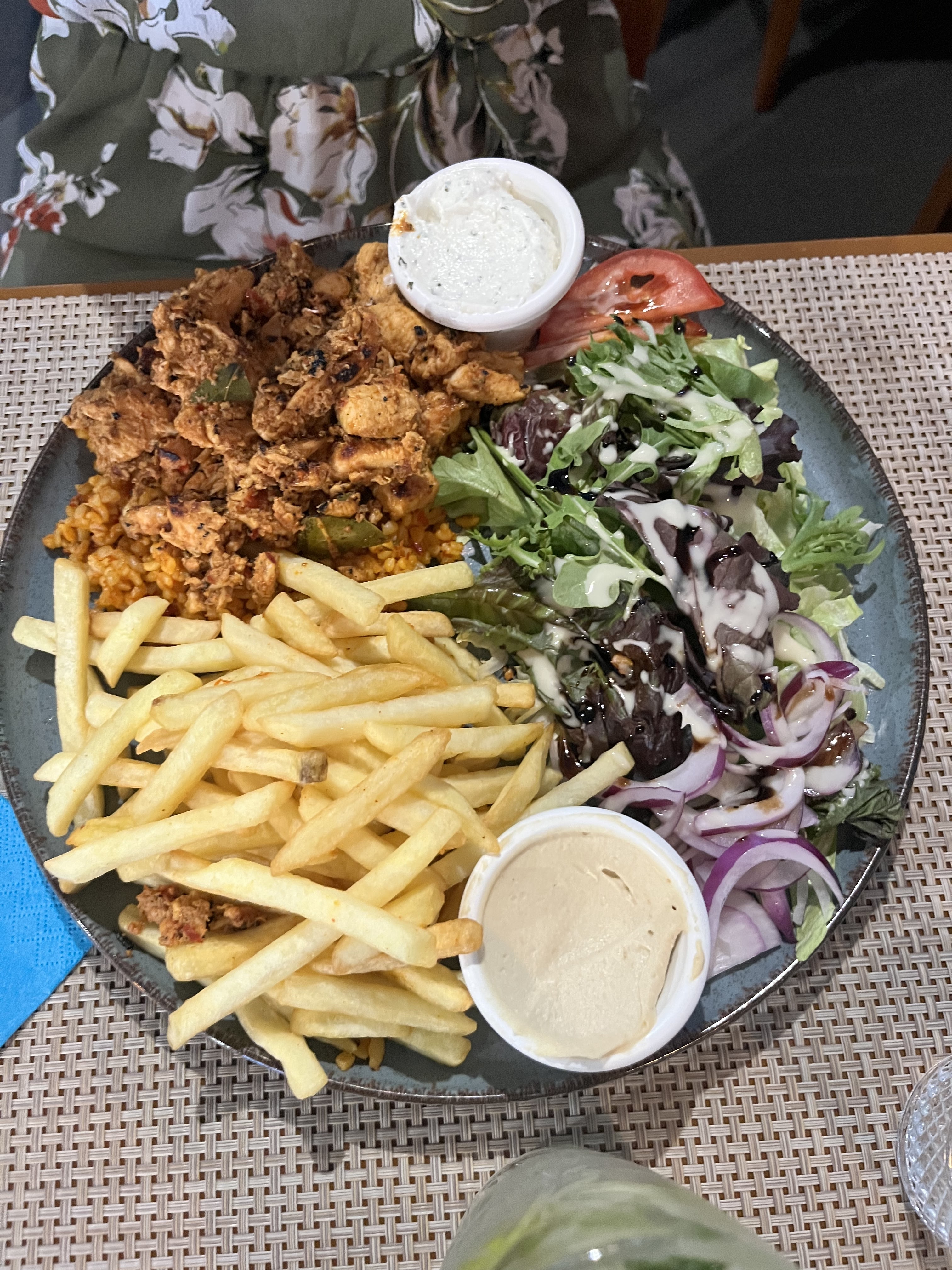 commande à emporter, un plateau pour 2 personnes un délice, les portions sont nobles et la cuisson divine. PS: les baklavas c'est trop bon 😁 Sans oublié l'amabilité du personnel qui fait toujours plaisir !