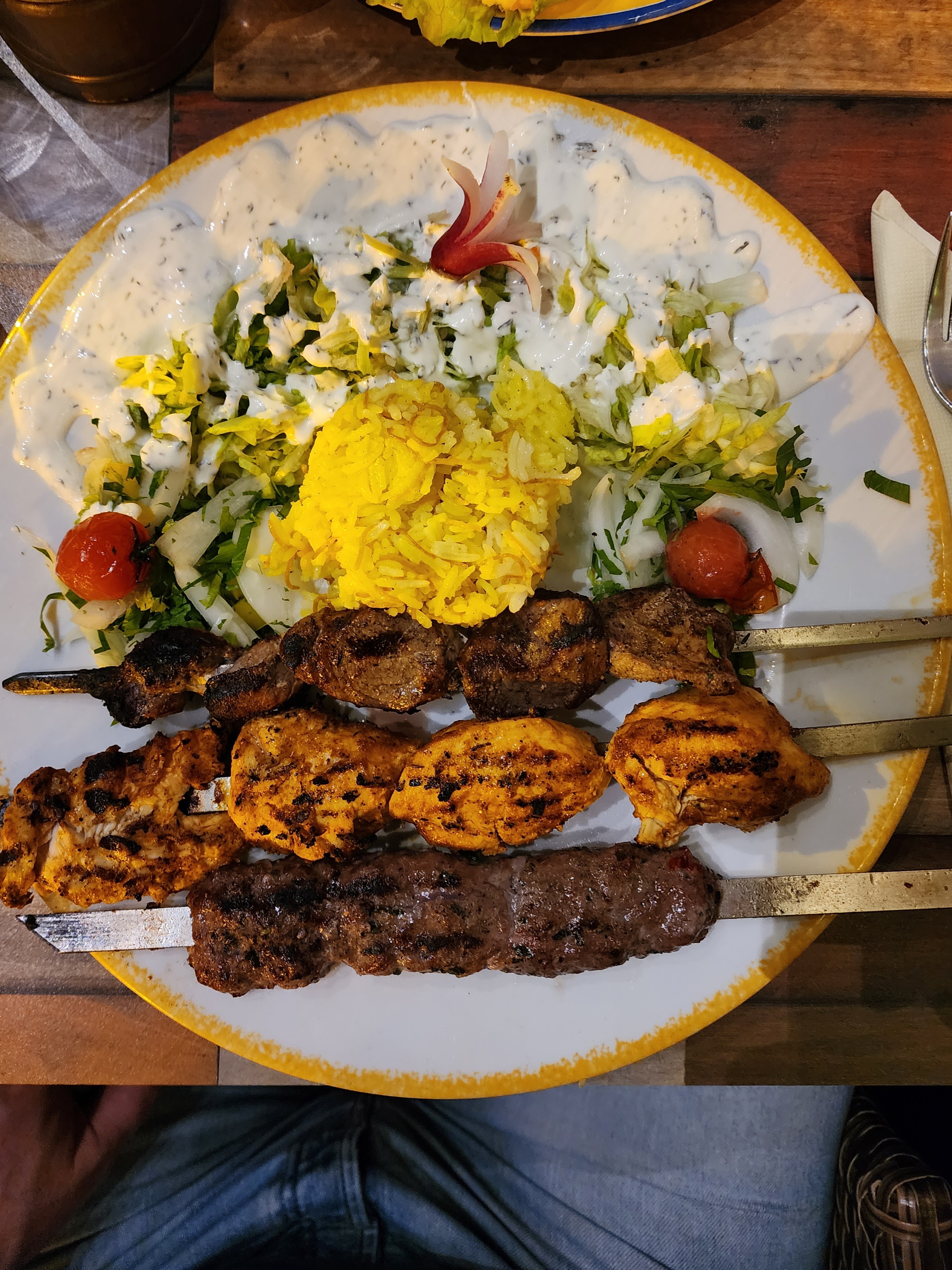 Accueil pour le moins sexiste mais avec le sourire. Pour le mezze complet,c’est plutôt classique mais correct sauf pour les brochettes, ridicules pour 28 euros ( les 5 personnes déçues, et nous voilà partis pour 2 plats de brochettes supplémentaires). Pour le prix vous pouvez passer à un restaurant de bien meilleure qualité et éviter une salle qui a due être sympa, au siècle dernier. En clair, passez votre chemin.