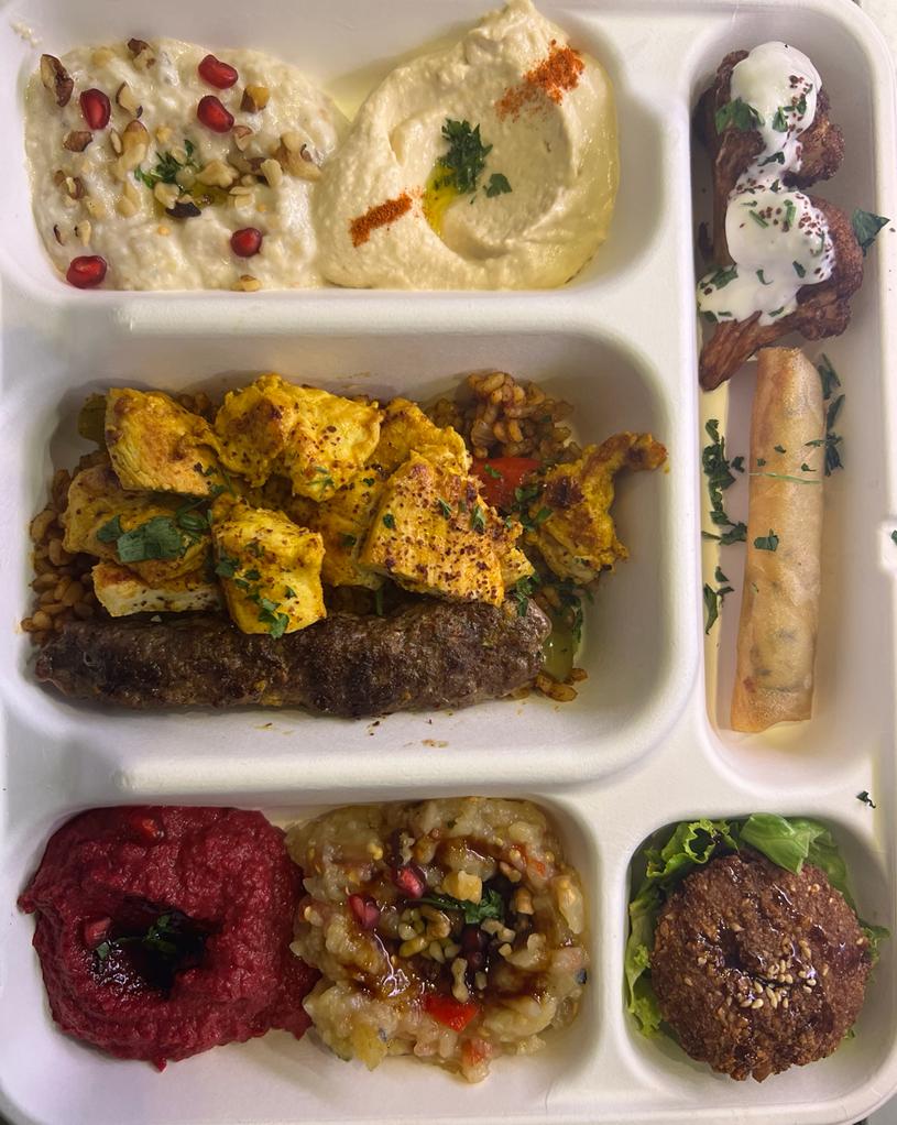 Étant de grands amateurs de cuisine libanaise nous avons trouvé les plats du mezze bien présentés, ils donnent envoi. Mais cela ne mérite pas un tel prix. Surtout à emporter, et pas le choix c'est le chef qui décide quels plats vous seront servis, sans prévenir. Nous avons eu les plats les plus simples et moins chers de la carte....et en quantité payé pour 3 personnes qui ressemblaient plus à du deux personnes. En plus un assortiment de 6 MINUSCULES gâteaux à 6e!!! Alors en résumé c'était bon et bien présenté mais 60e pour des plats simples et en quantité trop faible. Dommage