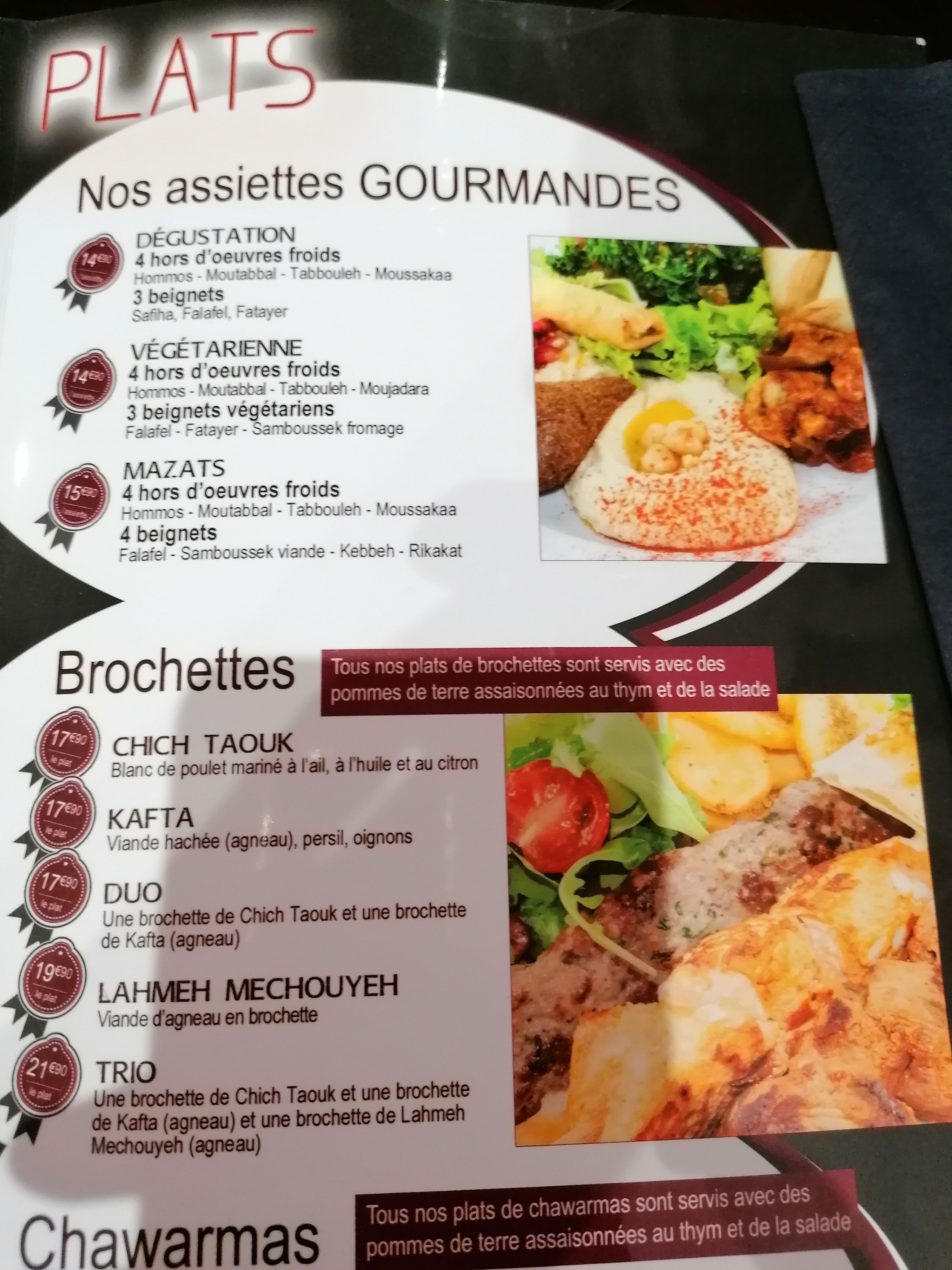 Je vous partage mon expérience dans ce restaurant. Content de vouloir découvrir la cuisine libanaise, je me retrouve à être malheureusement déçu par la cuisine. Il s’avère que le Chawarma à 20€90 est servi avec une petite portion dans un pain encore plus petit que les kebab… avec une portion de pomme de terre et de plus c’était sec. La portion de frite surgelé en supplément est à 5,90. Le pain n’est pas fait maison, absence de houmous dans l’assiette alors que la carte le prévoit, que le serveur en a parlé et j’en passe. 94 euros pour 3 inadmissible ! Total: 121,10 euros avec le vin. Je pense que le patron devrait revoir le coût de production ainsi que le coût de revient Je n’y retournerai plus. Ps: le vin était bon et le serveur sympa
