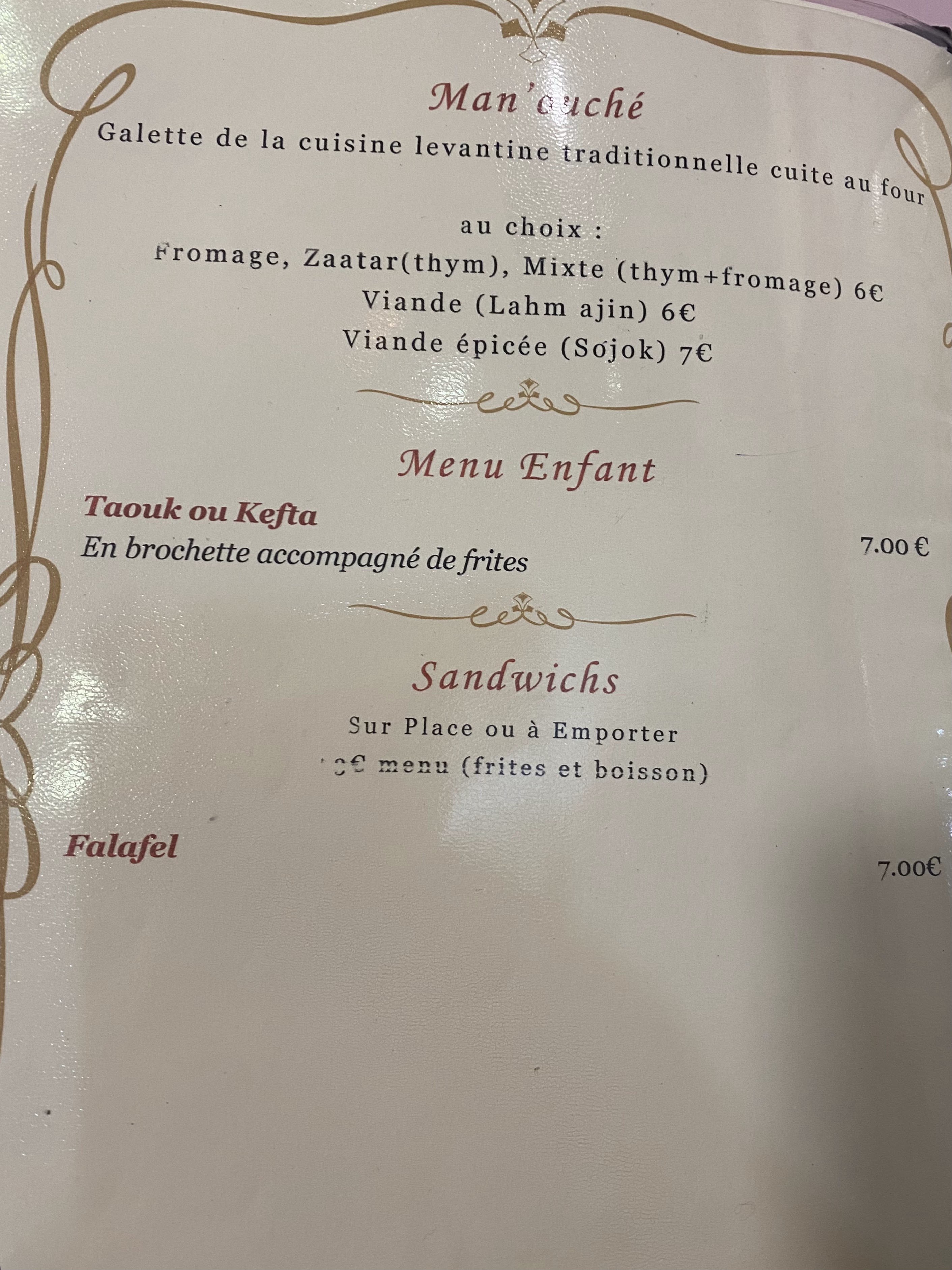 Cuisine excellente, j’ai commandé un plat kefta, des kebbé et un manouché au fromage, du houmous, et tout vraiment très très bon. Que Dieu vous bénisse et vous offre une magnifique réussite, vous le méritez !
