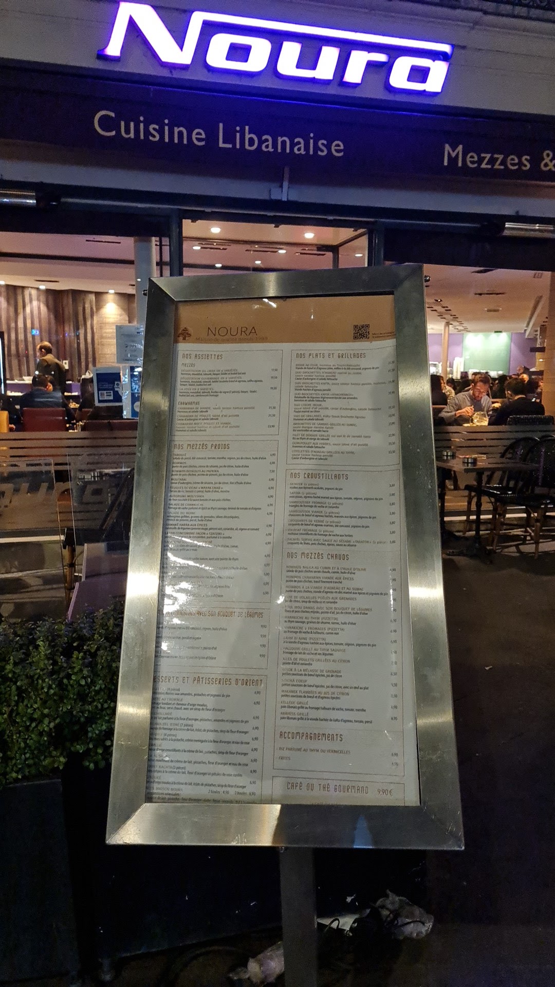 Excellent !! Noura dispose d'un traiteur vendant des pâtisseries, juste en face d'un restaurant avec une possibilité de plats à emporter et plus bas un restaurant gastronomique de spécialité libanaise. Nous nous sommes arrêtés dans le second et c'était tout simplement délicieux avec un service très prévenant. Nous avons payé 60€ pour 2 plats et 2 desserts ce qui est est raisonnable compte tenu de la qualité et du lieu. Les plats ne sont pas ceux que l'on trouve dans n'importe quel libanais. Je recommande vivement de vous y arrêter si vous êtes de passage.