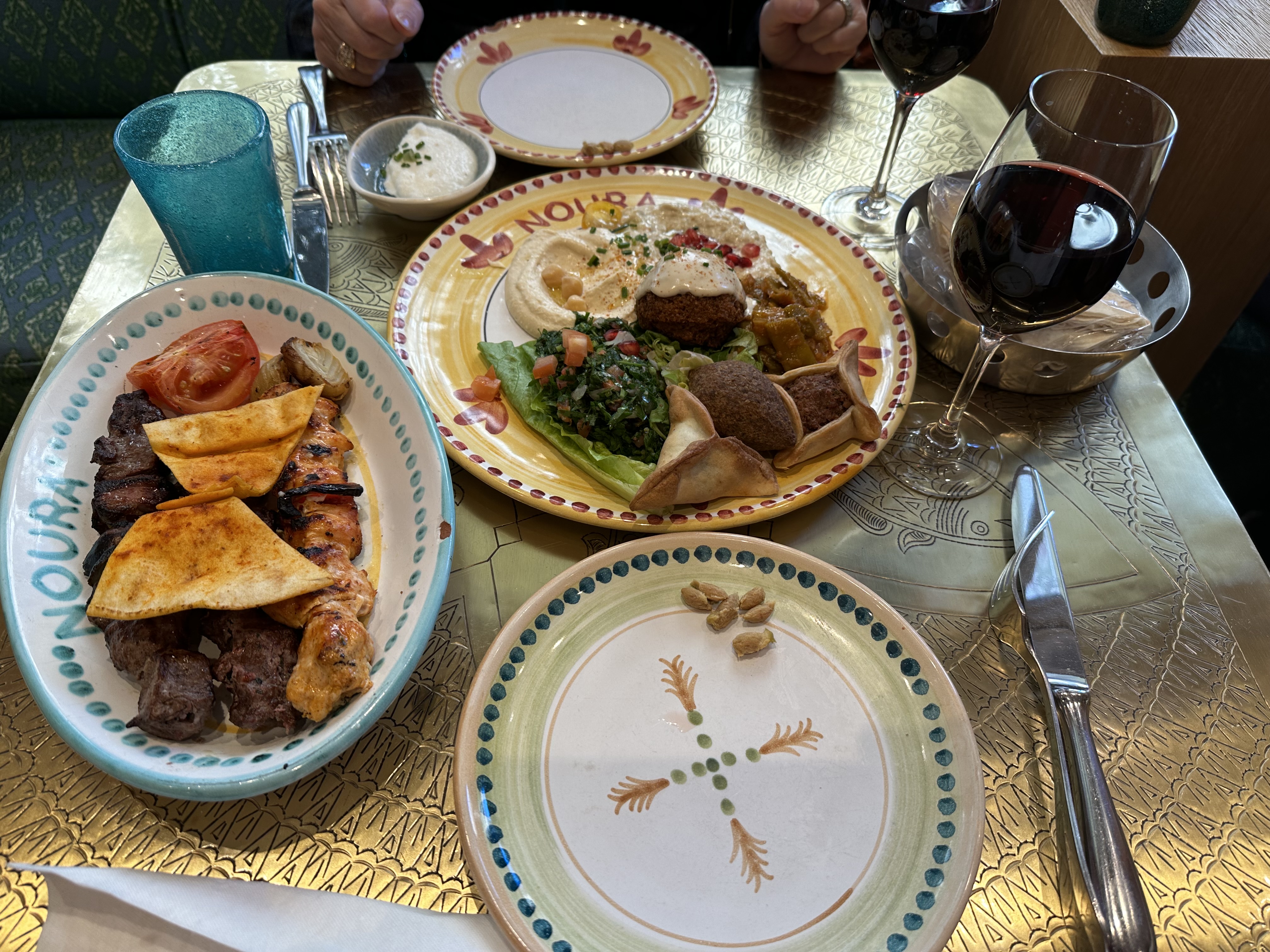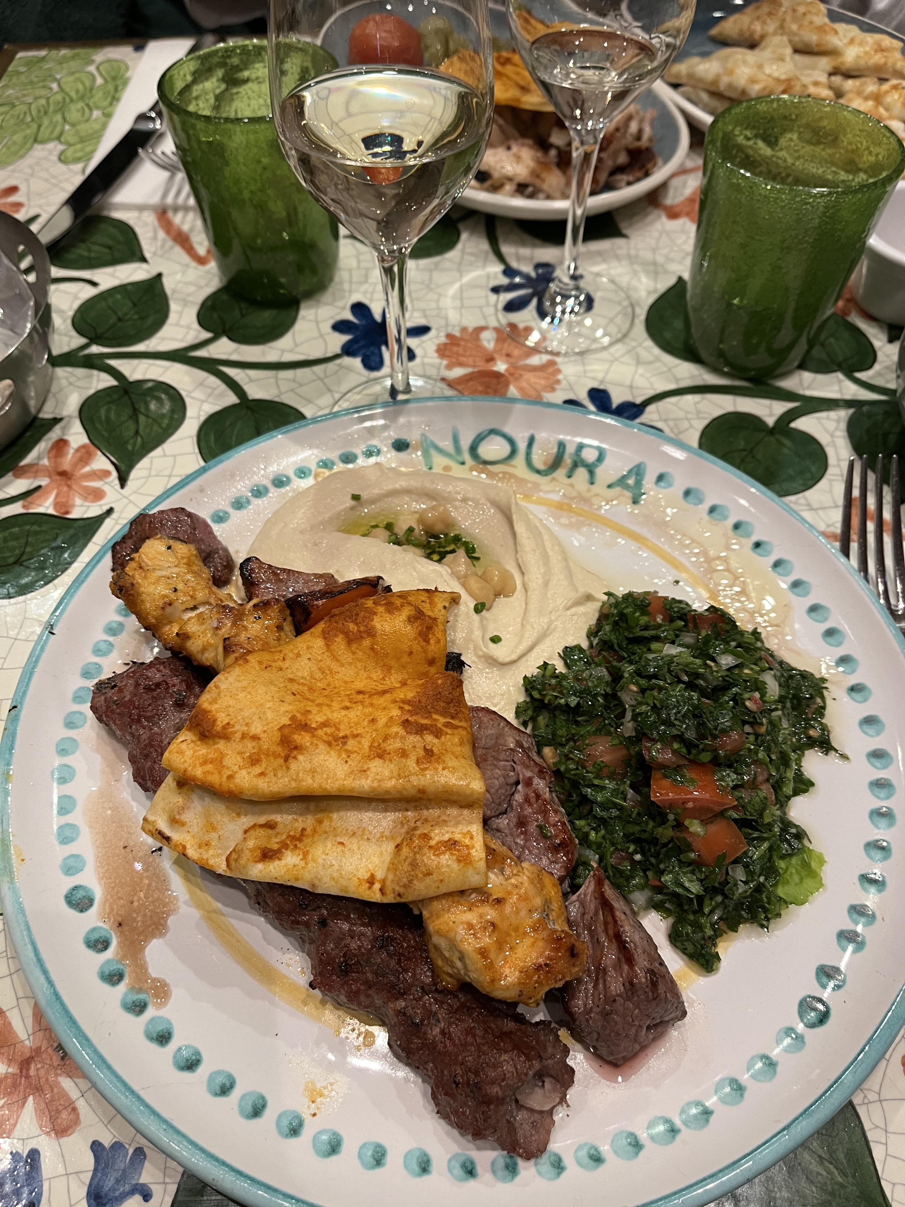Traiteur mais aussi restaurant Noura La gastronomie Libanaise de Paris Accueil, sourires,service, ambiance, décoration , choix multiples de plats et mezzés libanais accompagnés de thé à la menthe et pignons et pour finir petites pâtisseries orientales . Nous avons passer un moment exceptionnel entre sœurs et comme toujours jamais déçues . ( un peu d’attente tout de même !!! Prévoir 30/40 mn environ )