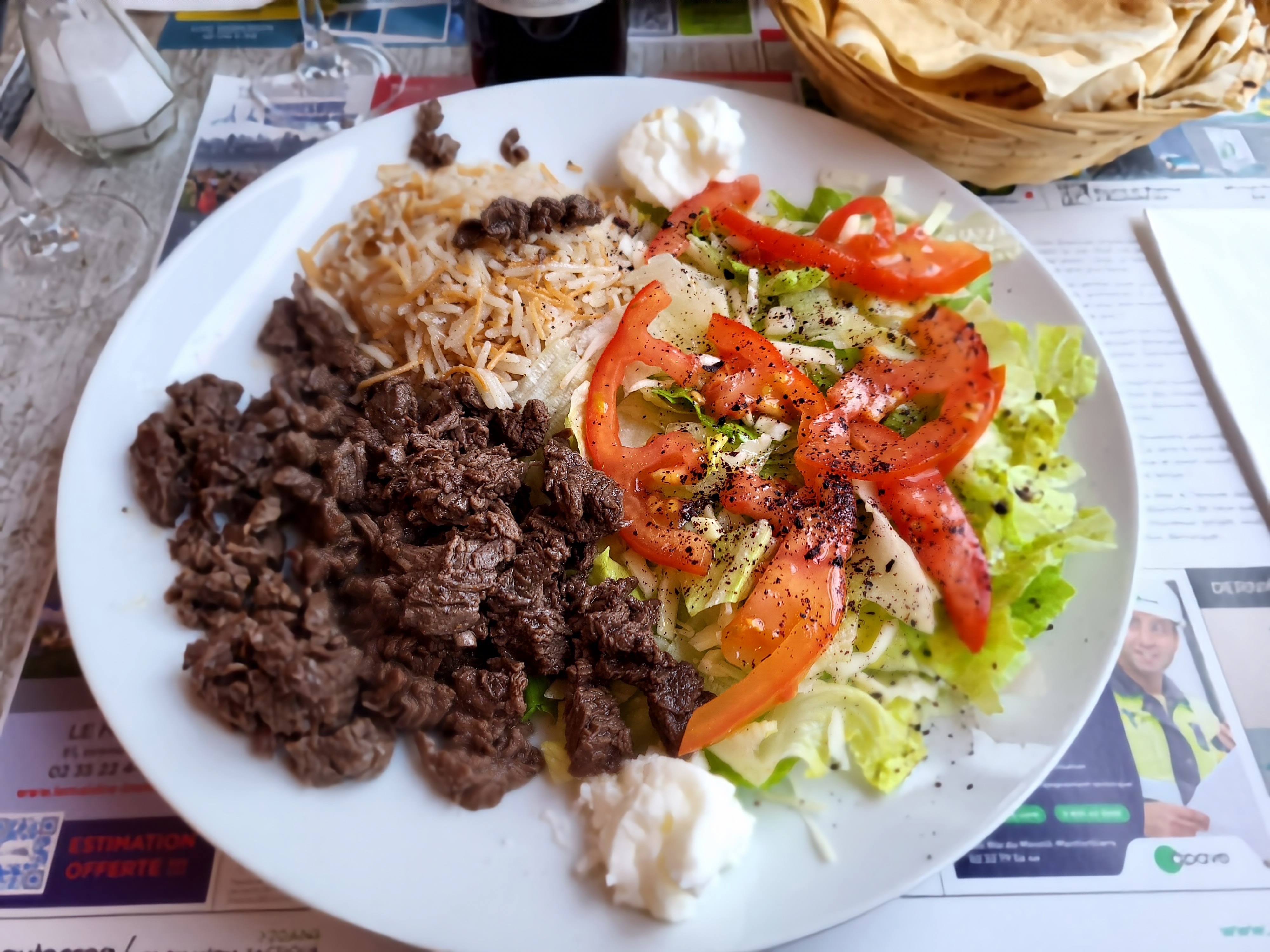pas mauvais mais dommage de retrouver de la sauce algerienne industrielle avec le plat . brochette de poulet trop cuite et du coup seche et dure . dommage frittes surgelé industrielle