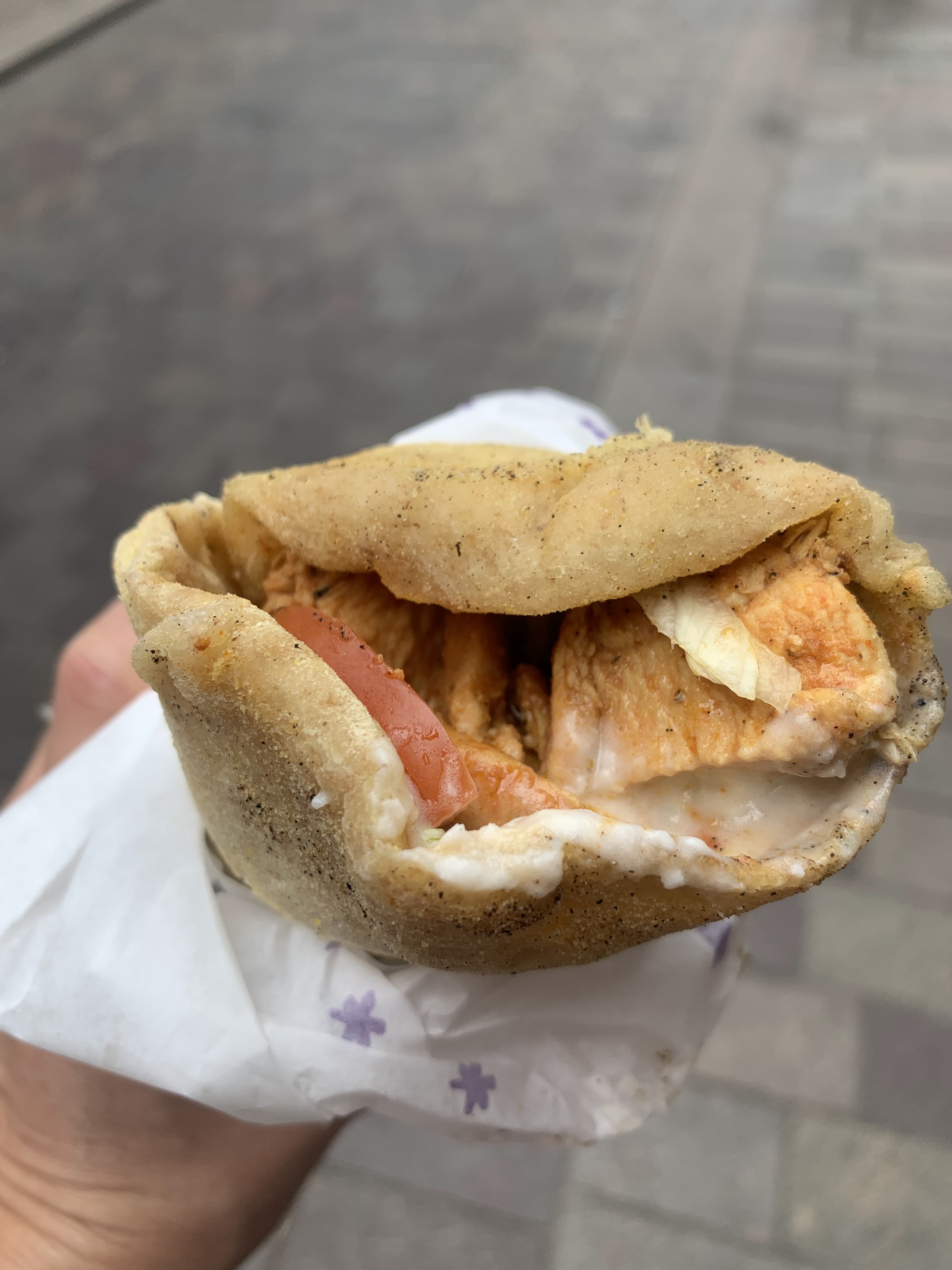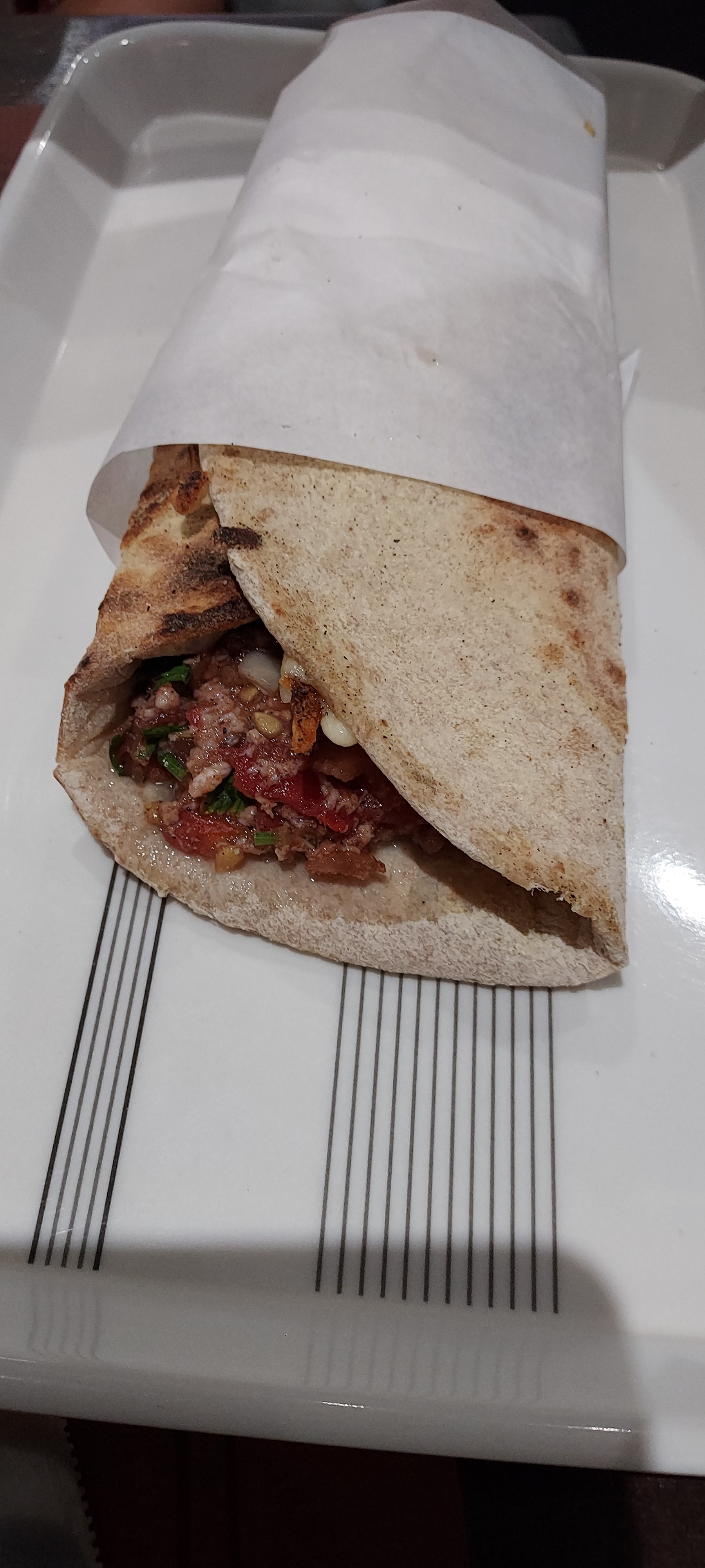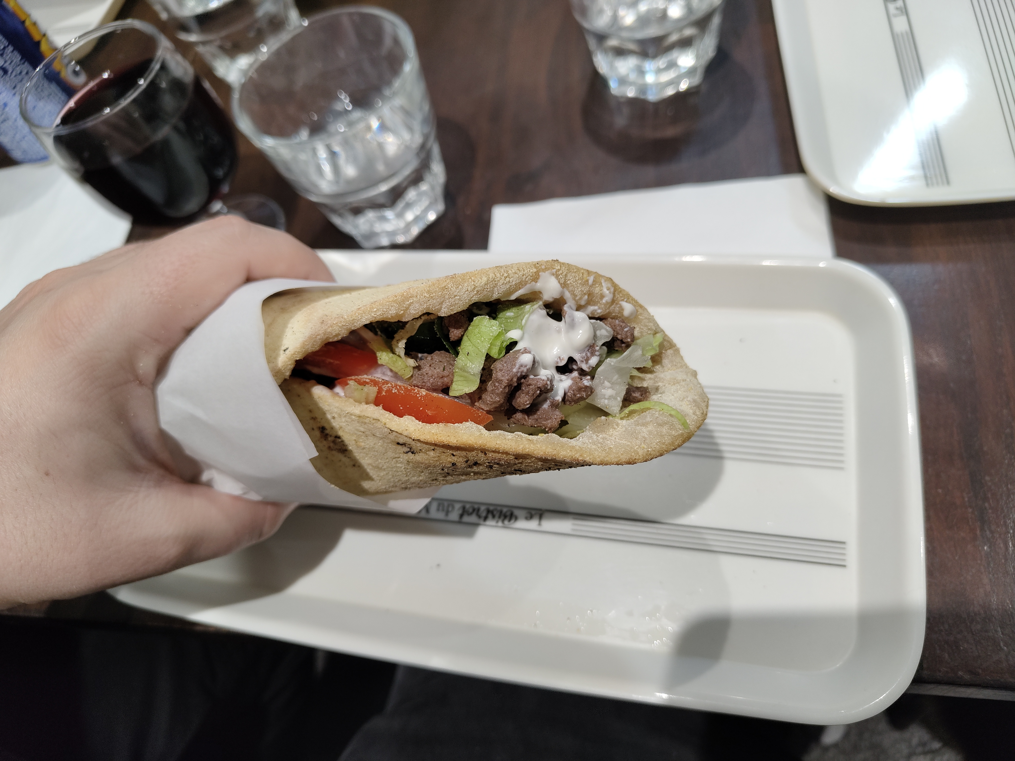 Première fois que je passe devant et qu’il n’y a pas une longue file d’attente, je n’ai donc pas hésité à aller tester leurs fameux sandwich libanais. La galette est préparée à la minute et généreusement garnie de viande de bœuf et une merveilleuse sauce typique de shawarma. On est un peu sur une tranche haute de prix mais ça fait toujours du bien un bon libanais.
