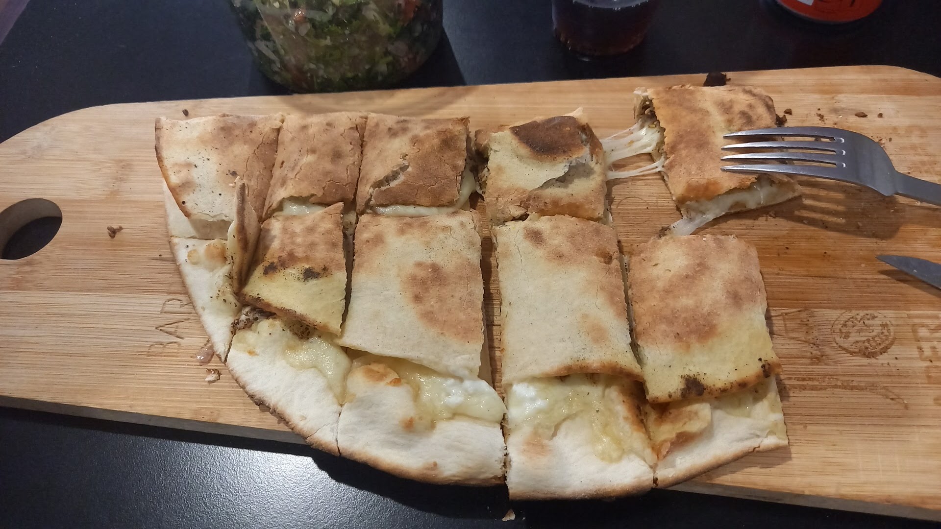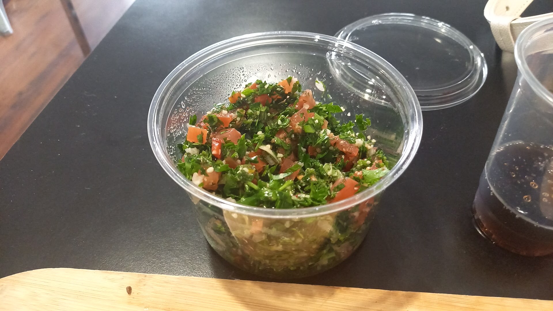 Taboulé libanais et pizza sandwich au fromage -thym libanais : un délice savouré dans la parc de la Tête te d Or. Accueil adorable.